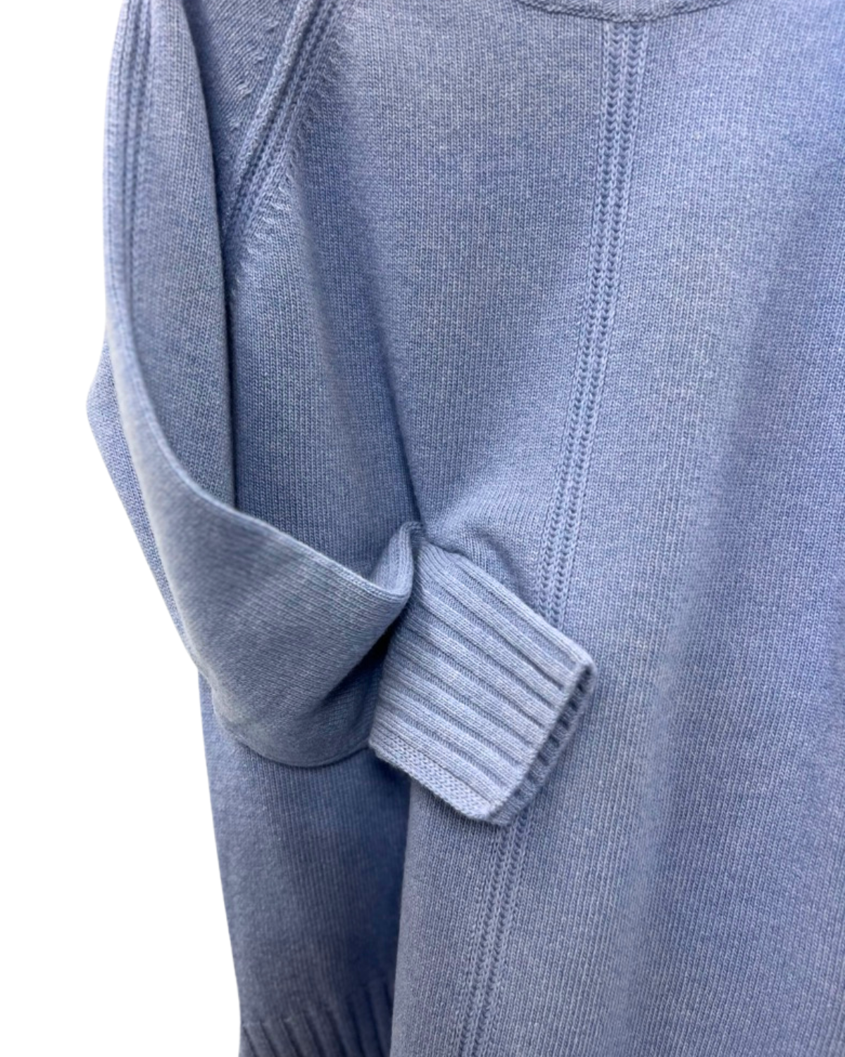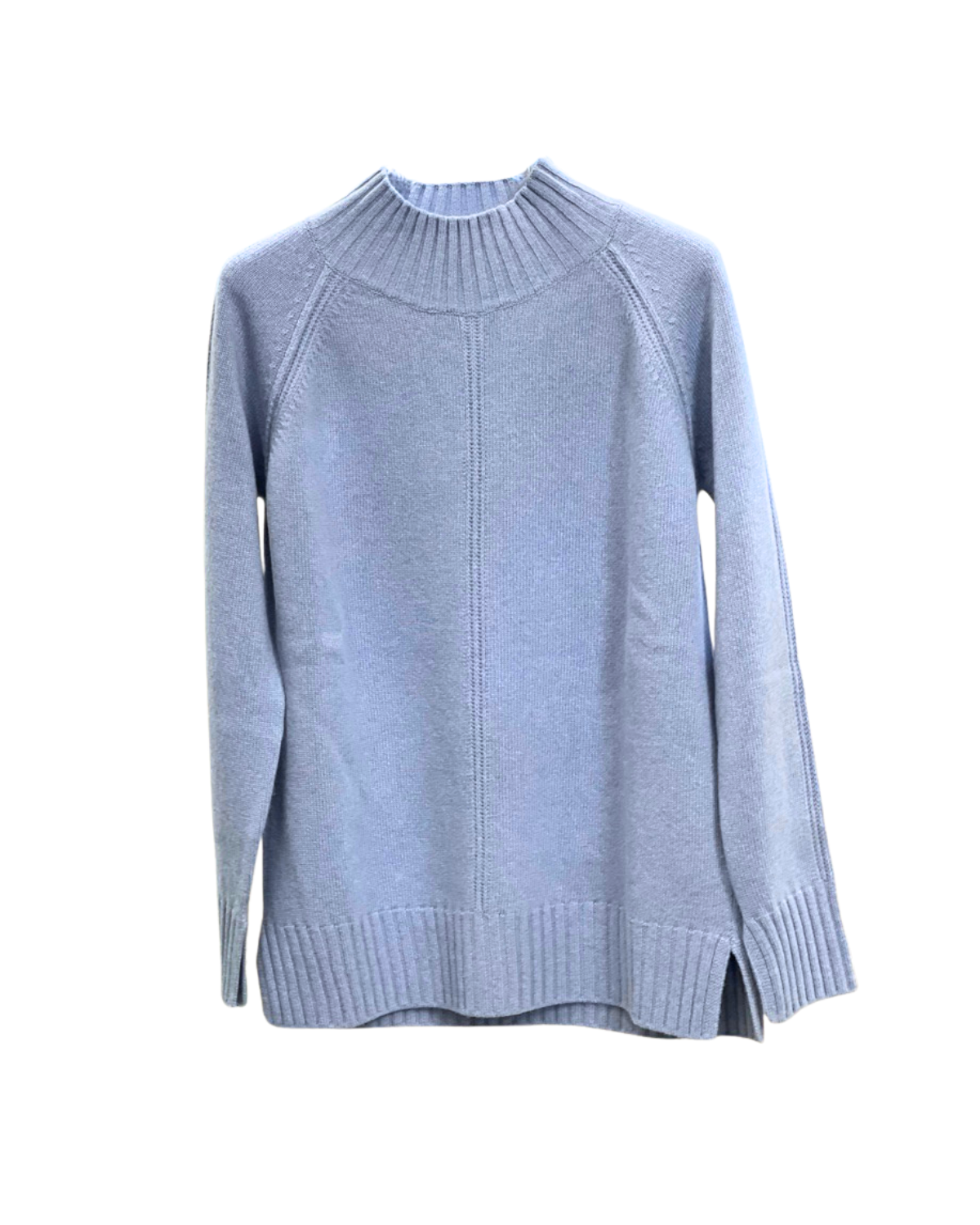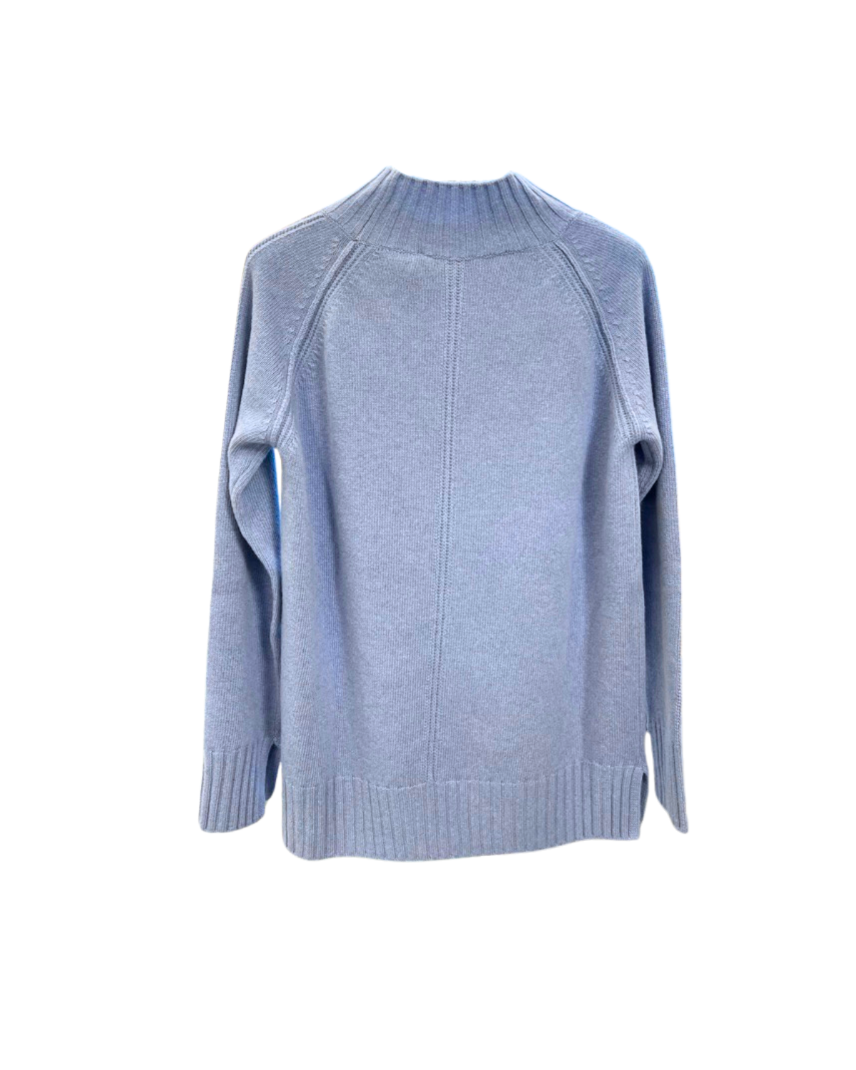 Maglia a mezzocollo in morbida lavorazione tricot color azzurro ghiaccio, caratterizzata da maniche lunghe raglan e dettagli di coste marcate su collo, fondo e polsini. La linea è leggermente morbida con piccoli spacchi laterali, pensata per garantire comfort e movimento. Un capo essenziale e raffinato, perfetto per look quotidiani eleganti.