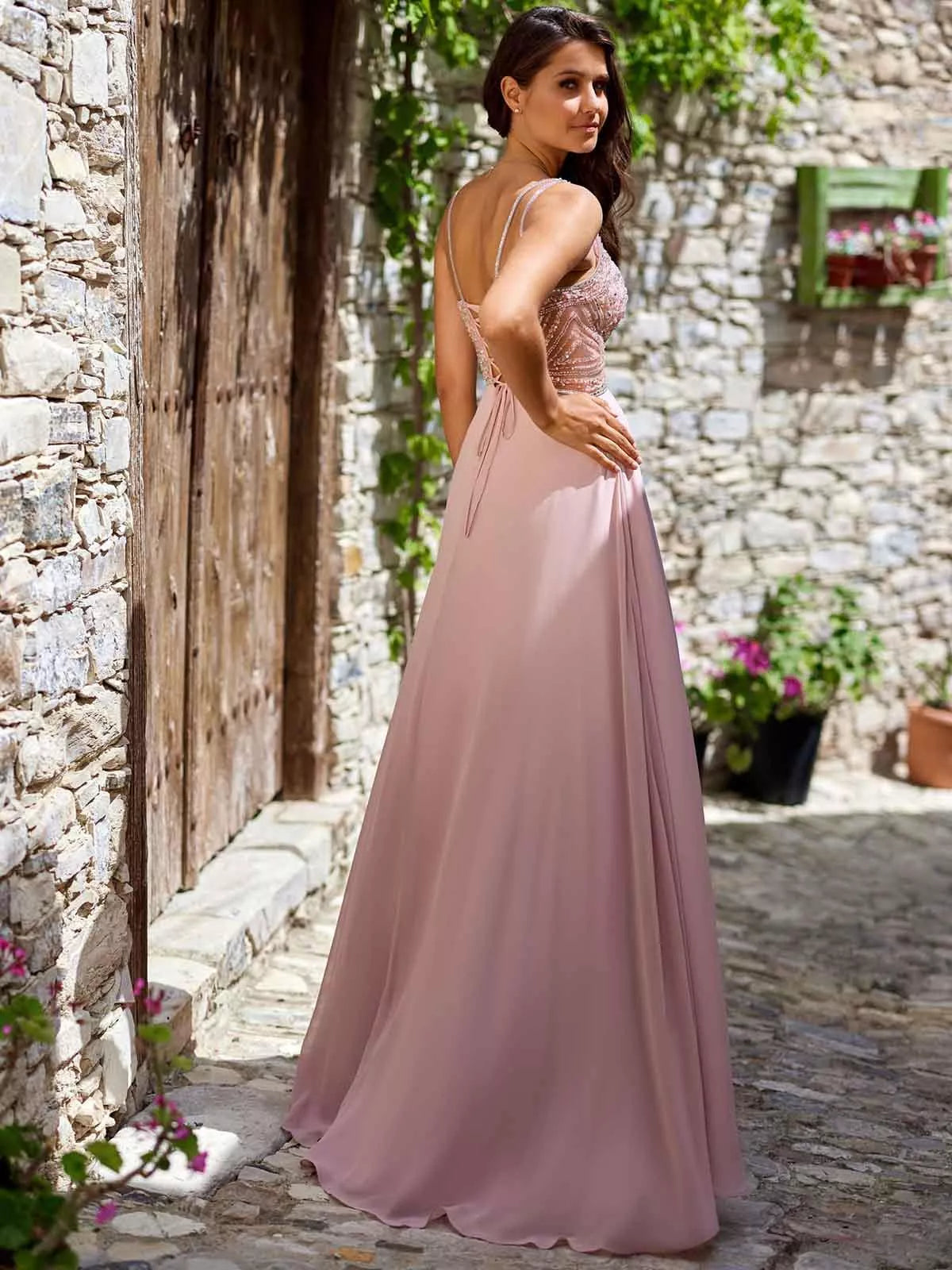 Abito lungo con corpetto lavorato ed impreziosito con swarosky, presenta una scollatura a V e spalline medio-sottili. Gonna a peplo con spacco laterale.