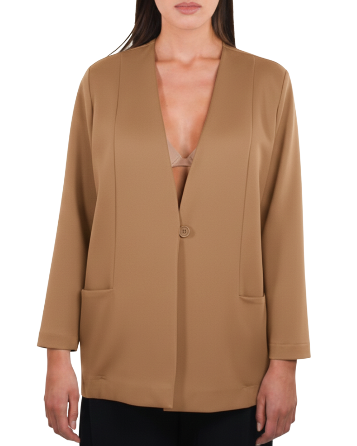 Presenta scollo profondo a V, chiusura monopetto con singolo bottone e tasche frontali applicate.