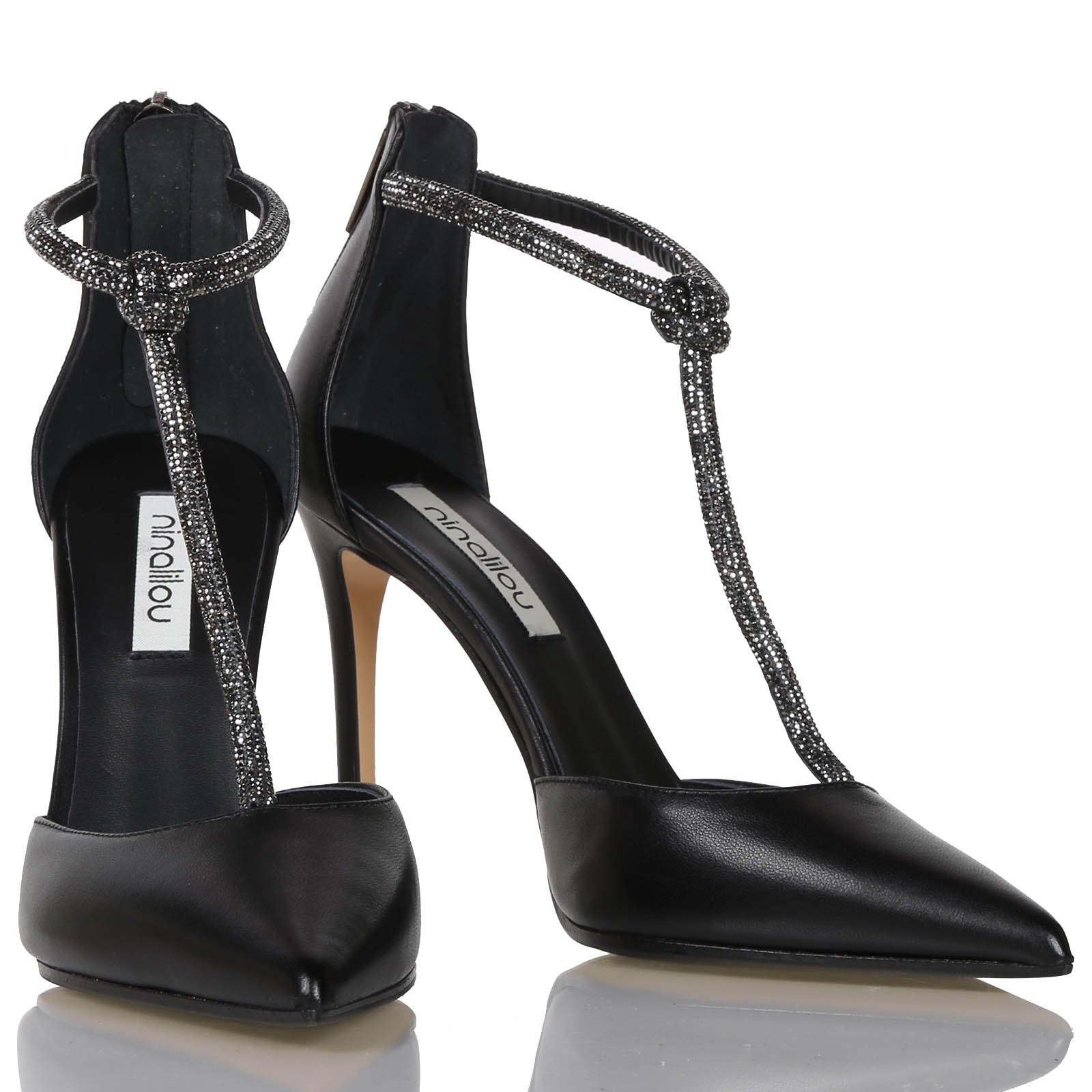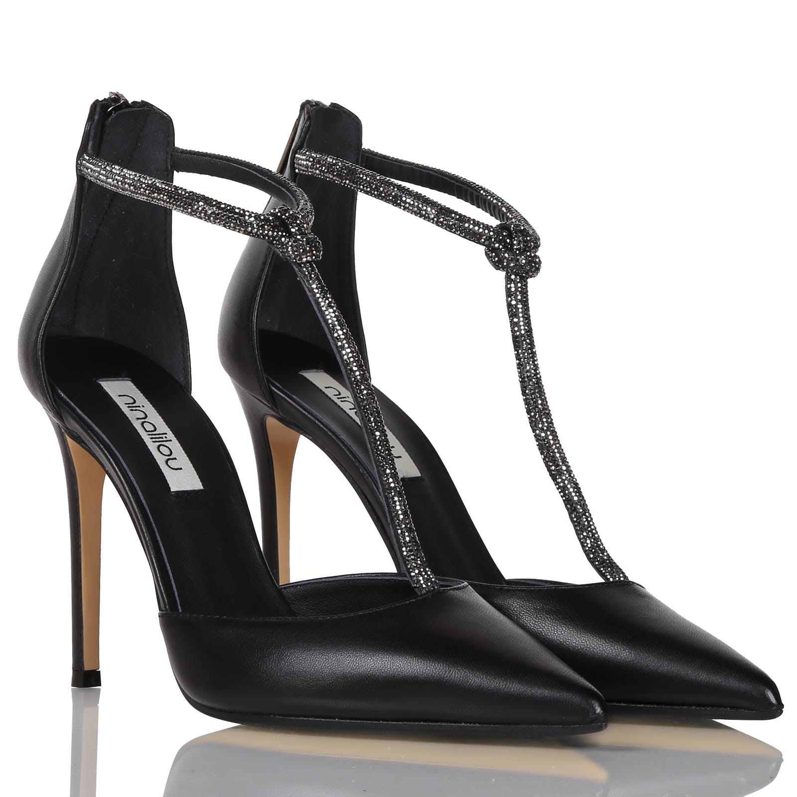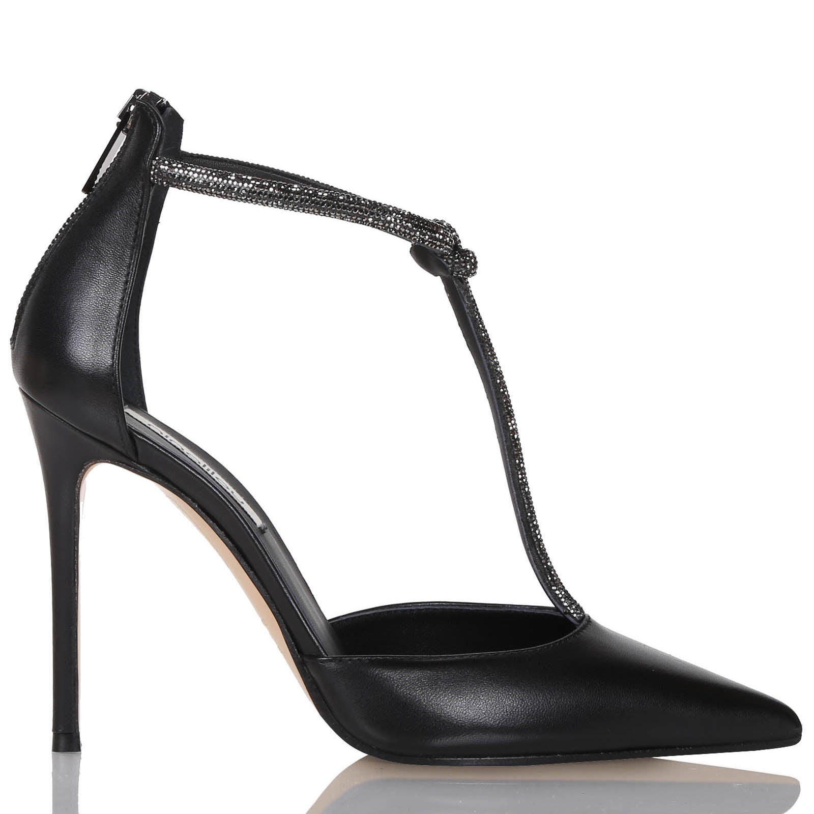 DÉCOLLETÉ IN MORBIDA NAPPA CON CINTURINO ALLA CAVIGLIA E APPLICAZIONE DI STRASS. SUOLA IN CUOIO. TACCO 10,5 CM.