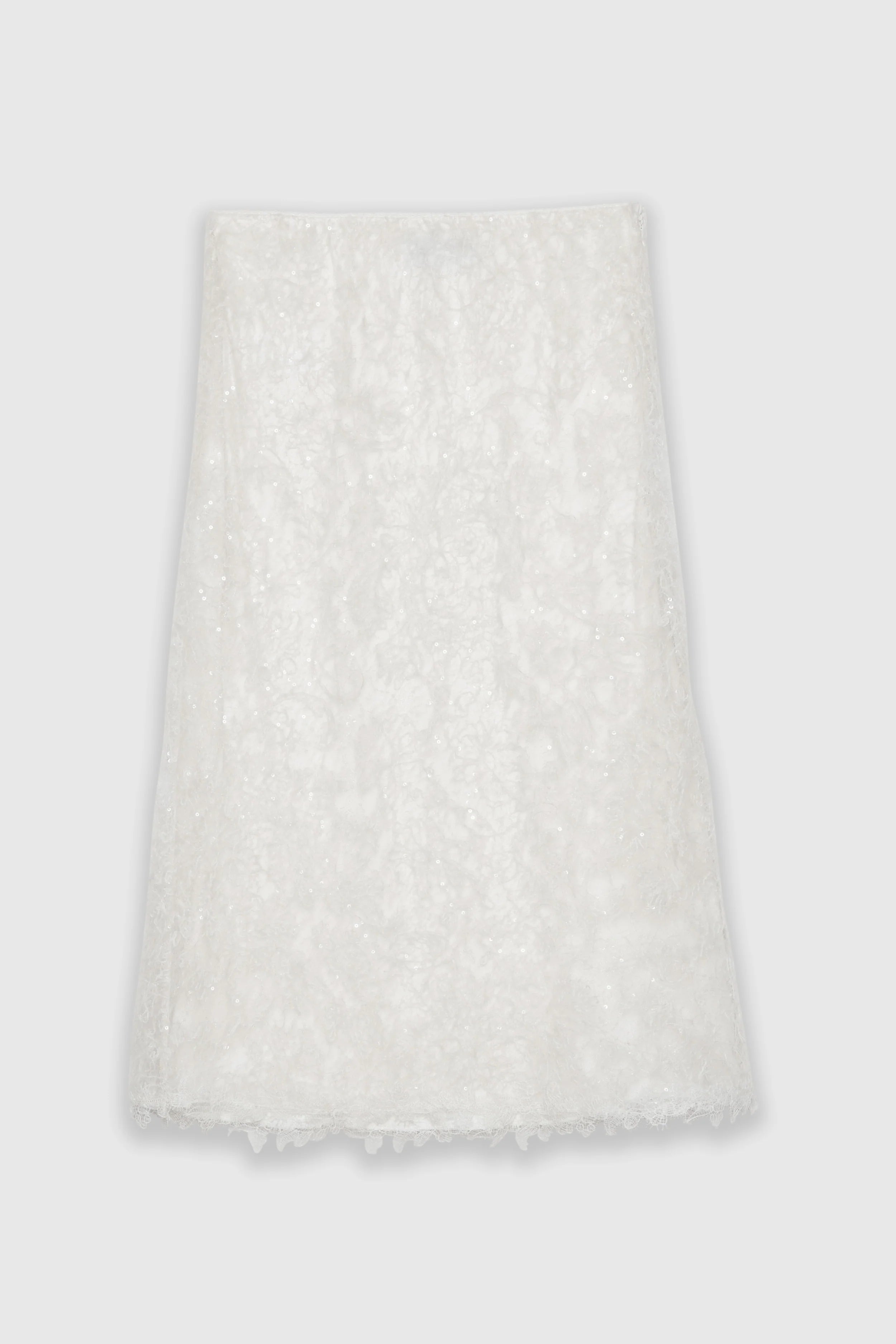 Longuette svasata di pizzo ricamato con paillettes. Orlo smerlato, foderata e con elastico in vita. La vestibilità di questo capo è regolare, si consiglia di acquistare la taglia abituale.