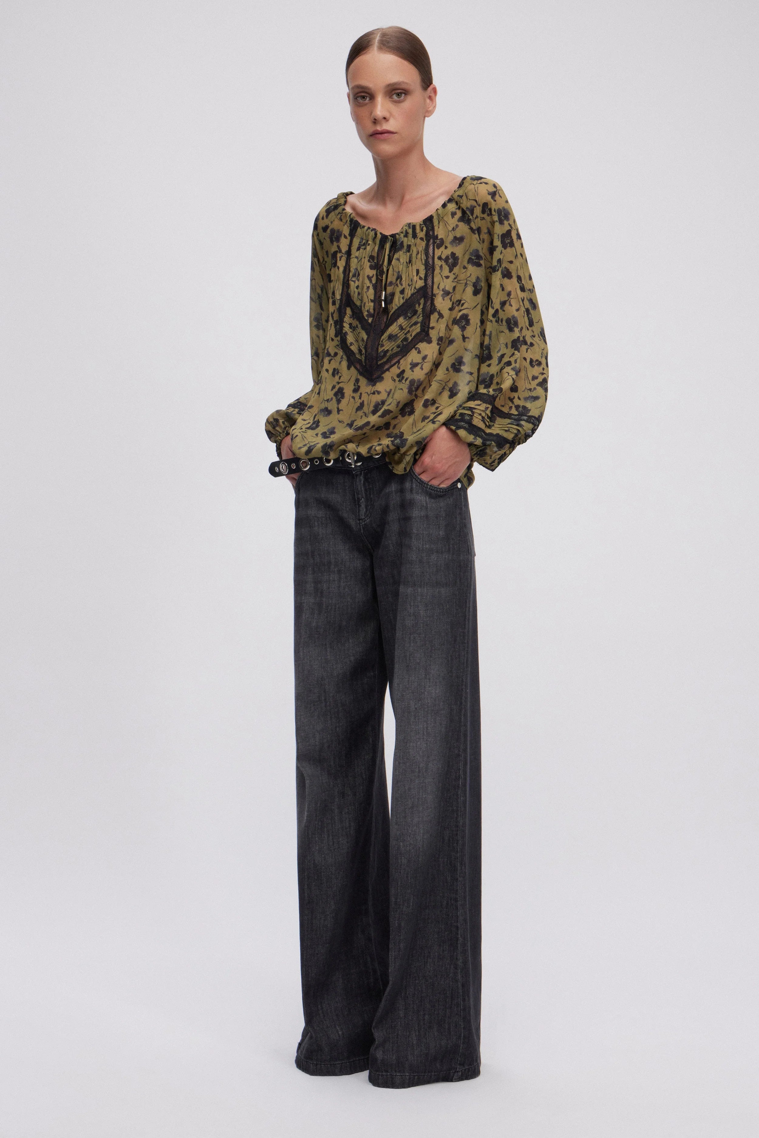 Jeans flare in denim grigio con lavaggio stone wash leggero. Vita bassa. Piega stirata. La vestibilità di questo capo è regolare, si consiglia di acquistare la taglia abituale.