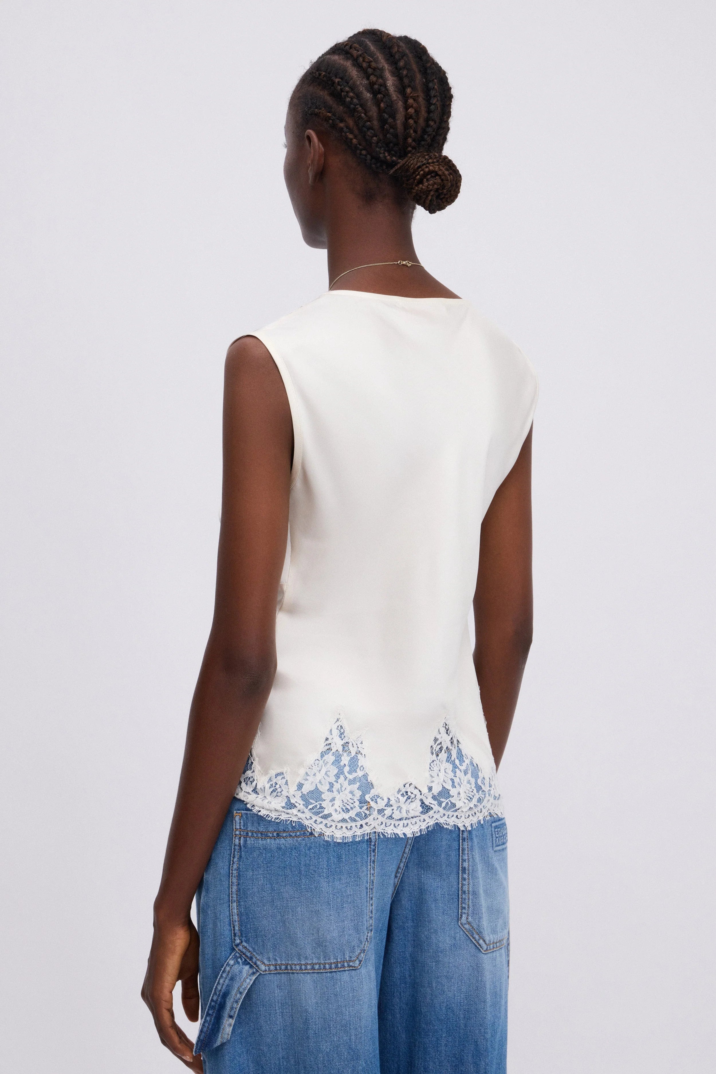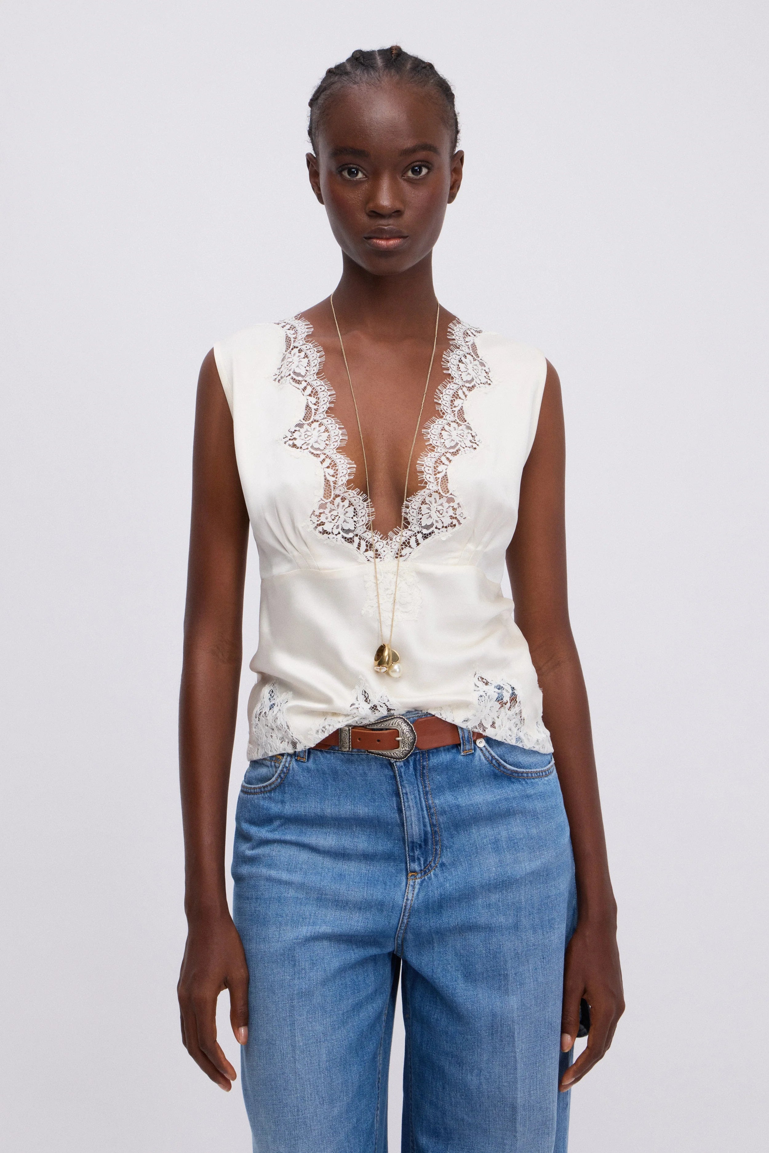 Top in raso di viscosa in sbieco con ampio scollo davanti e taglio sotto al seno. Pizzo ricamato allo scollo e al fondo. La vestibilità di questo capo è regolare, si consiglia di acquistare la taglia abituale.