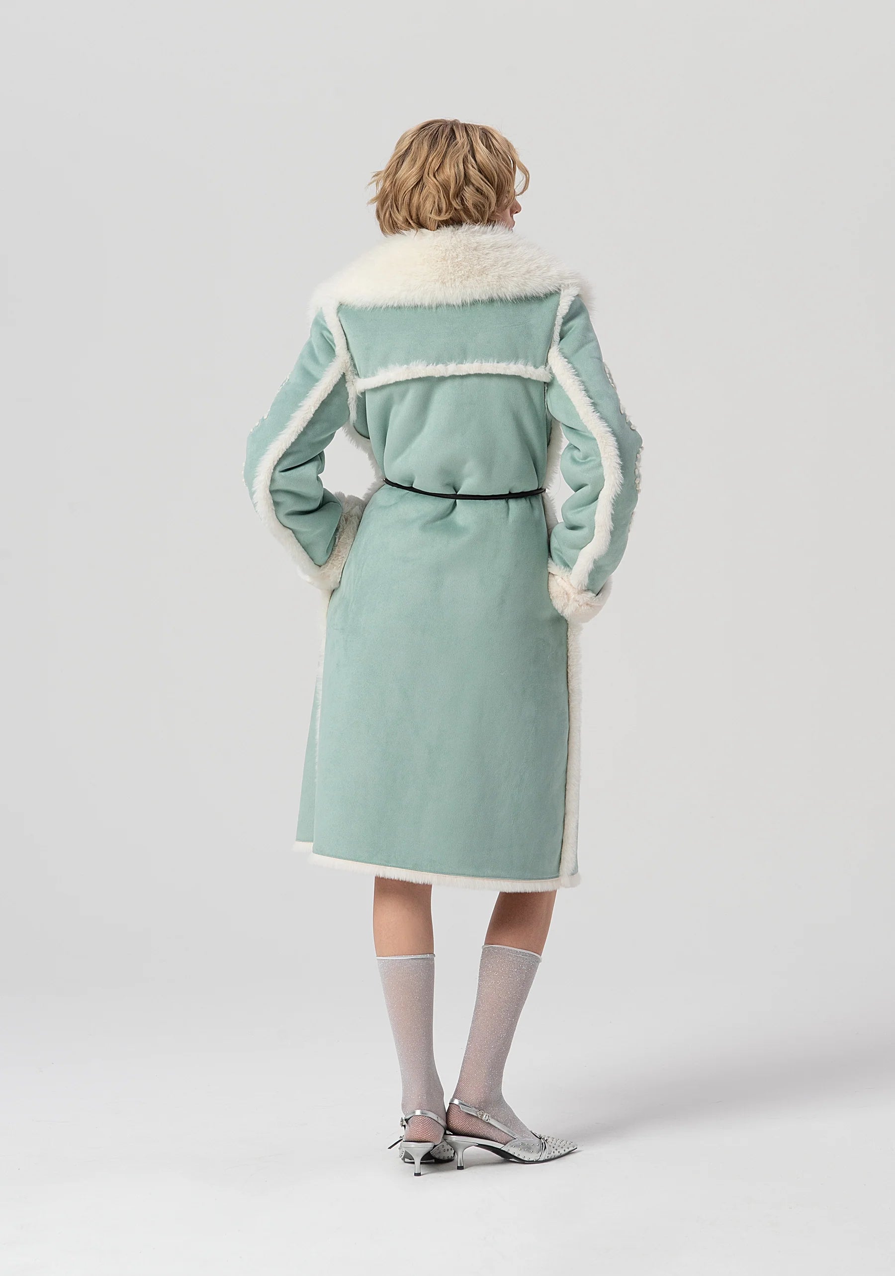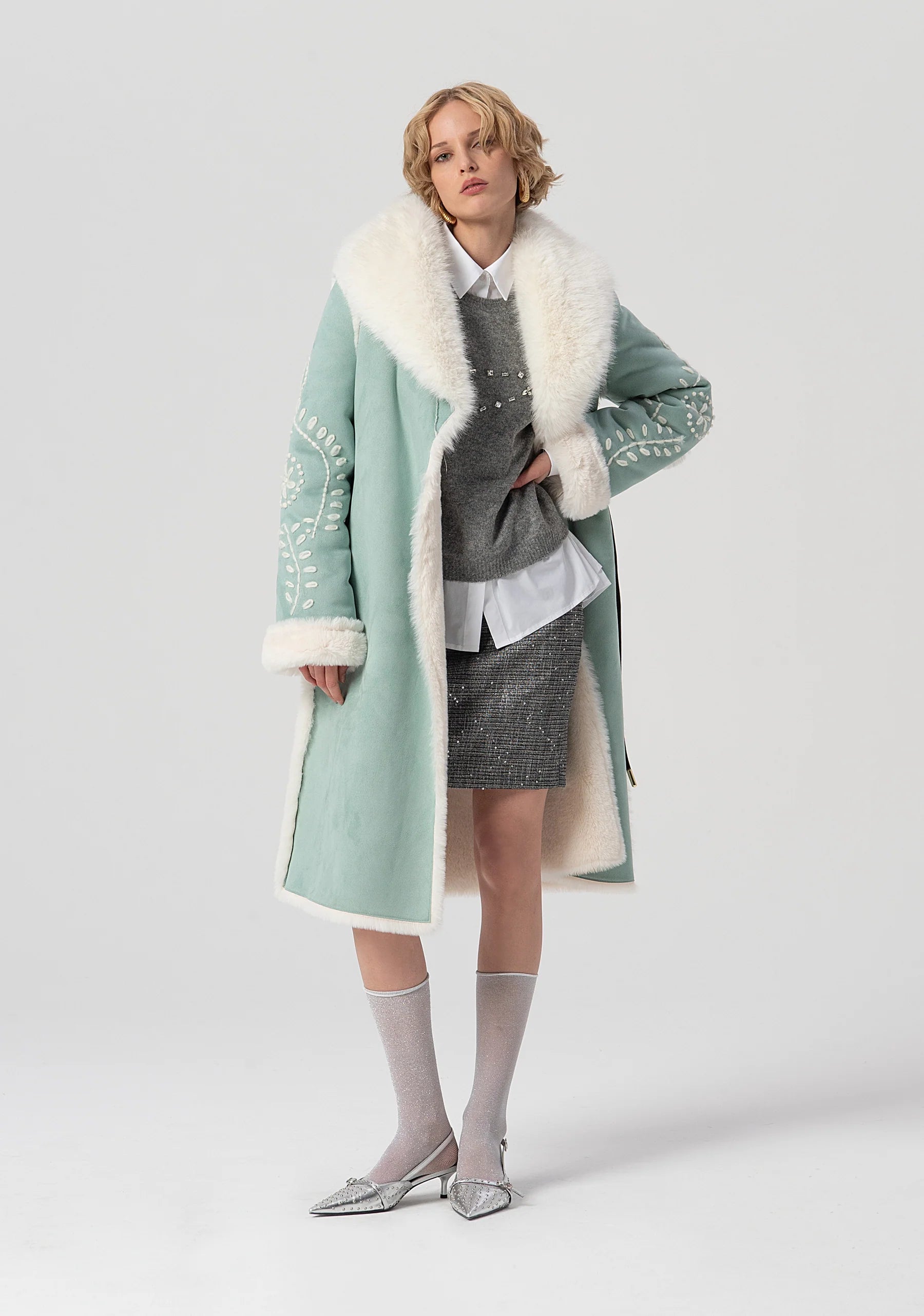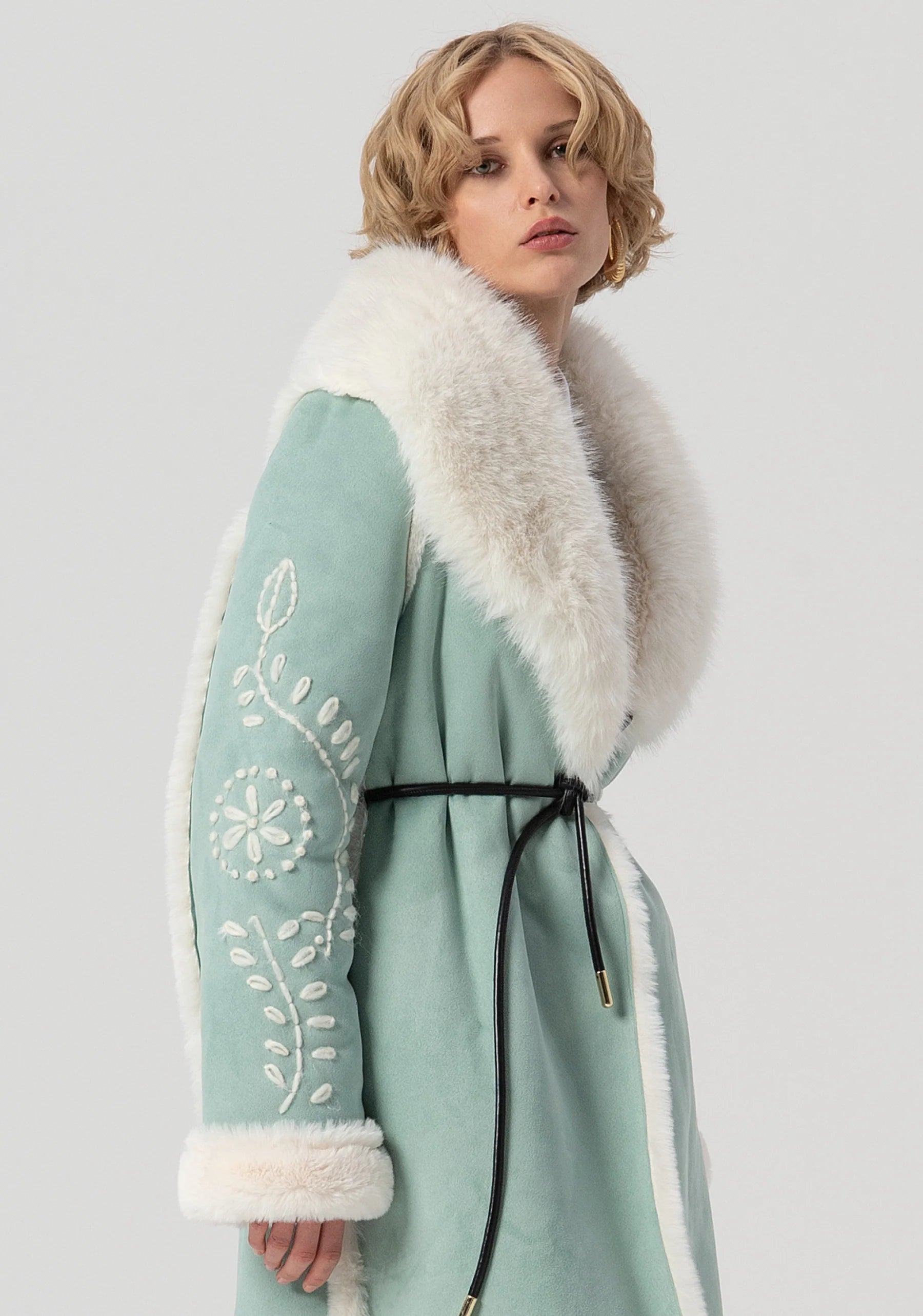 Cappotto over con rever sciallato in finta pelliccia, tasche laterali, cintura abbinata, ricami sulle maniche, interno in finta pelliccia, e con maniche lunghe.