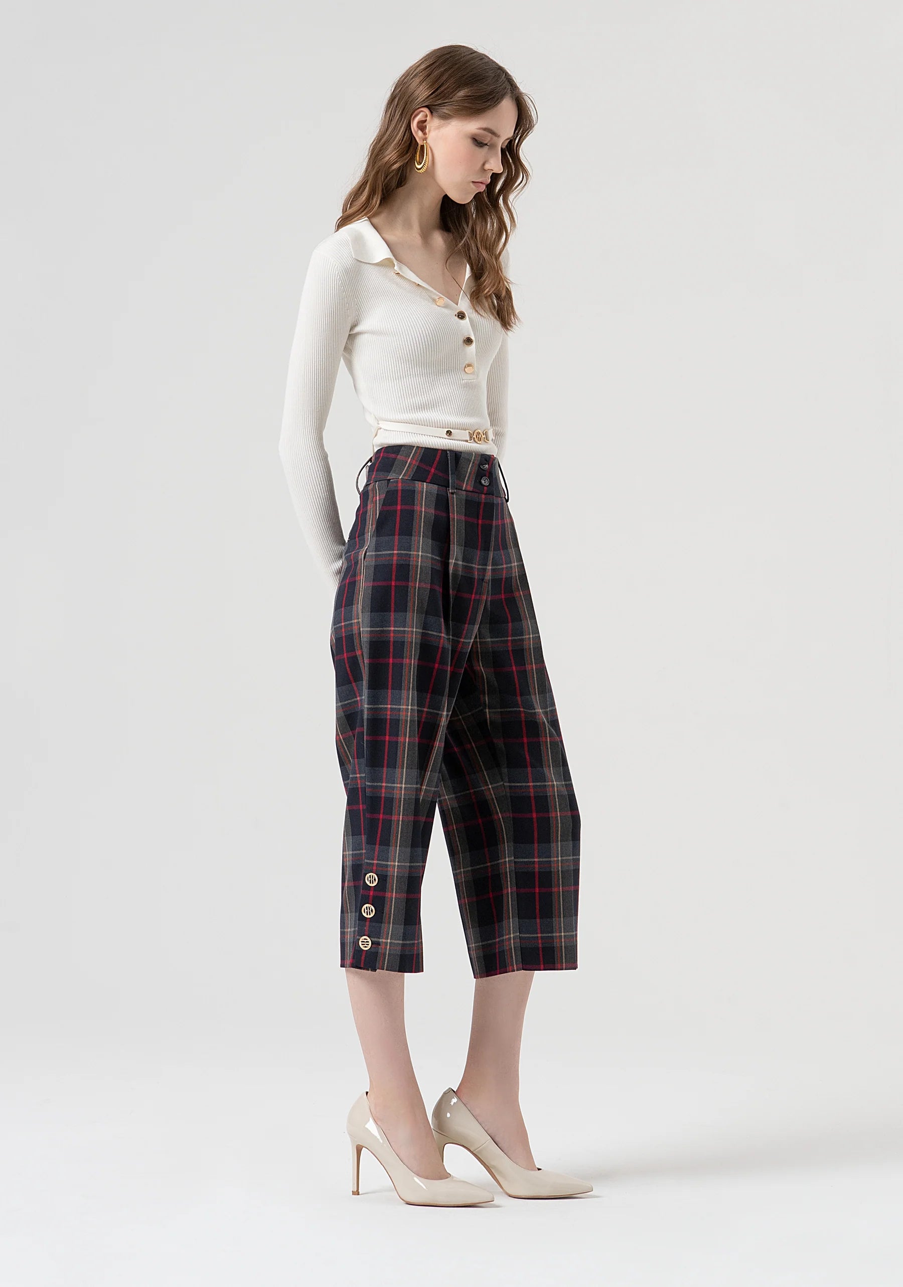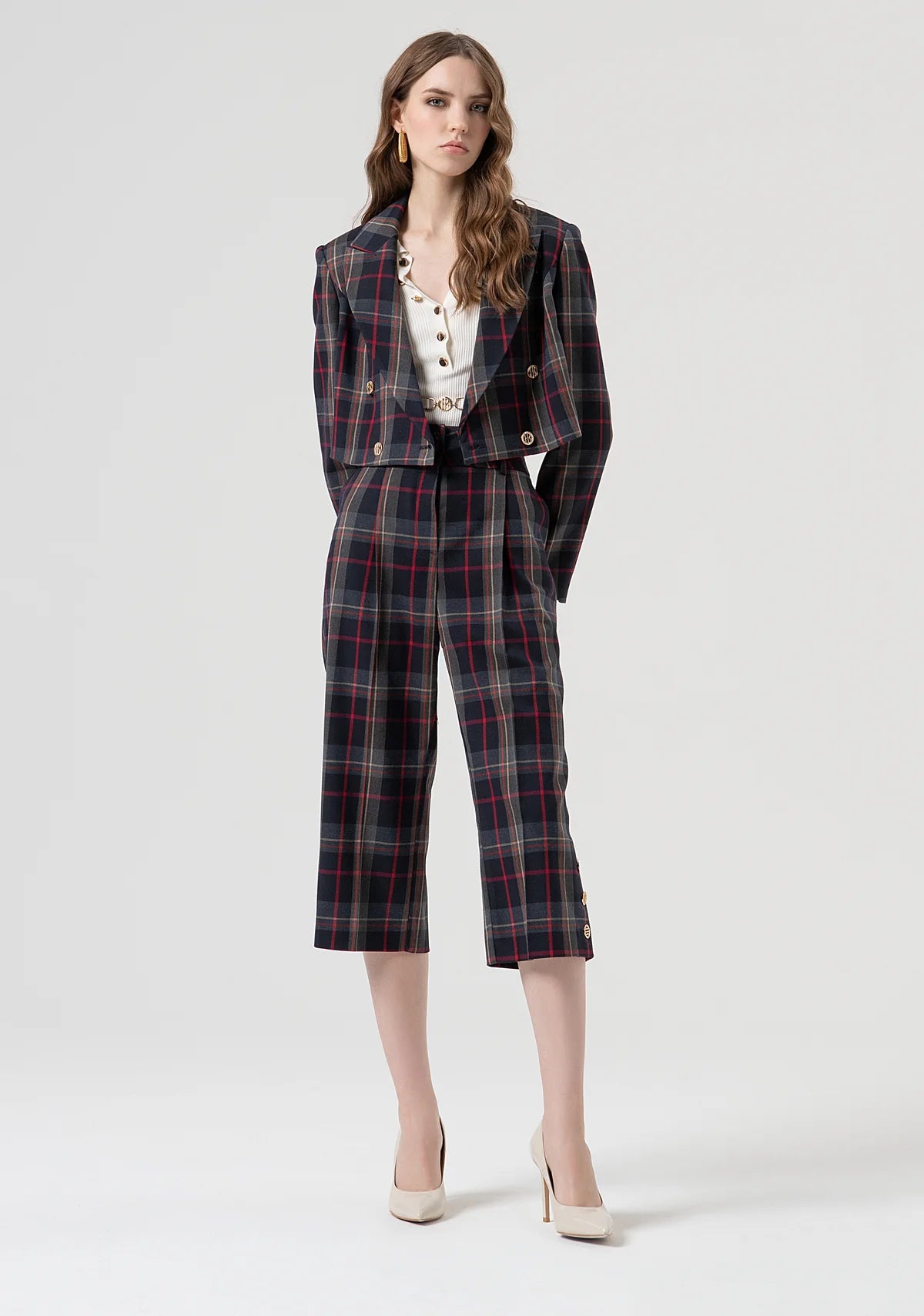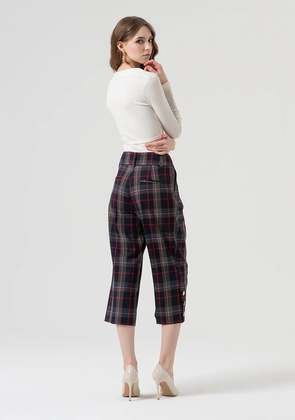 Pantalone carrot cropped in tessuto tartan, vita alta, pences, tasche alla francese, filetti sul dietro, e con fondo dritto con bottoni. SKU: FR25WV9006W45995-T62-FP