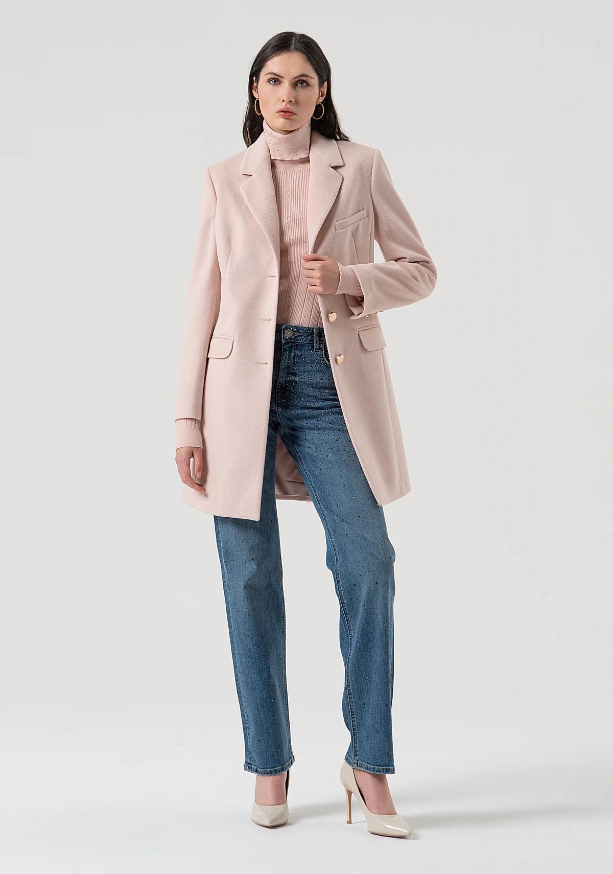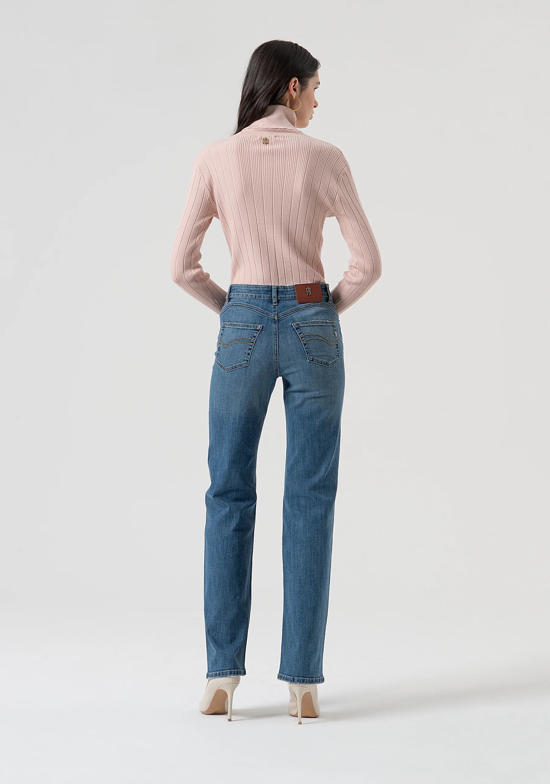 Jeans wide leg in denim con lavaggio medio e strass, vita regolare, 5 tasche, e con fondo largo.