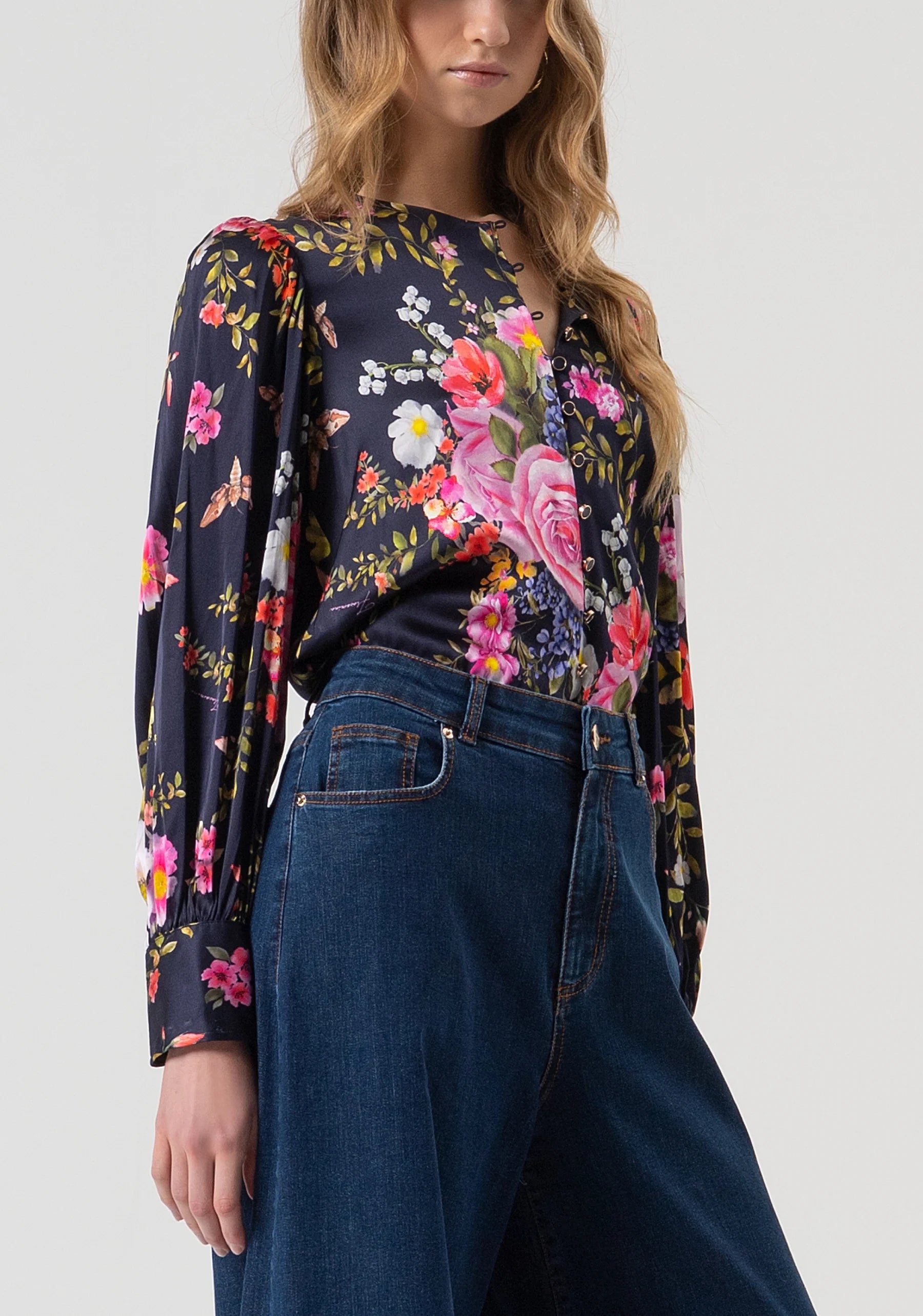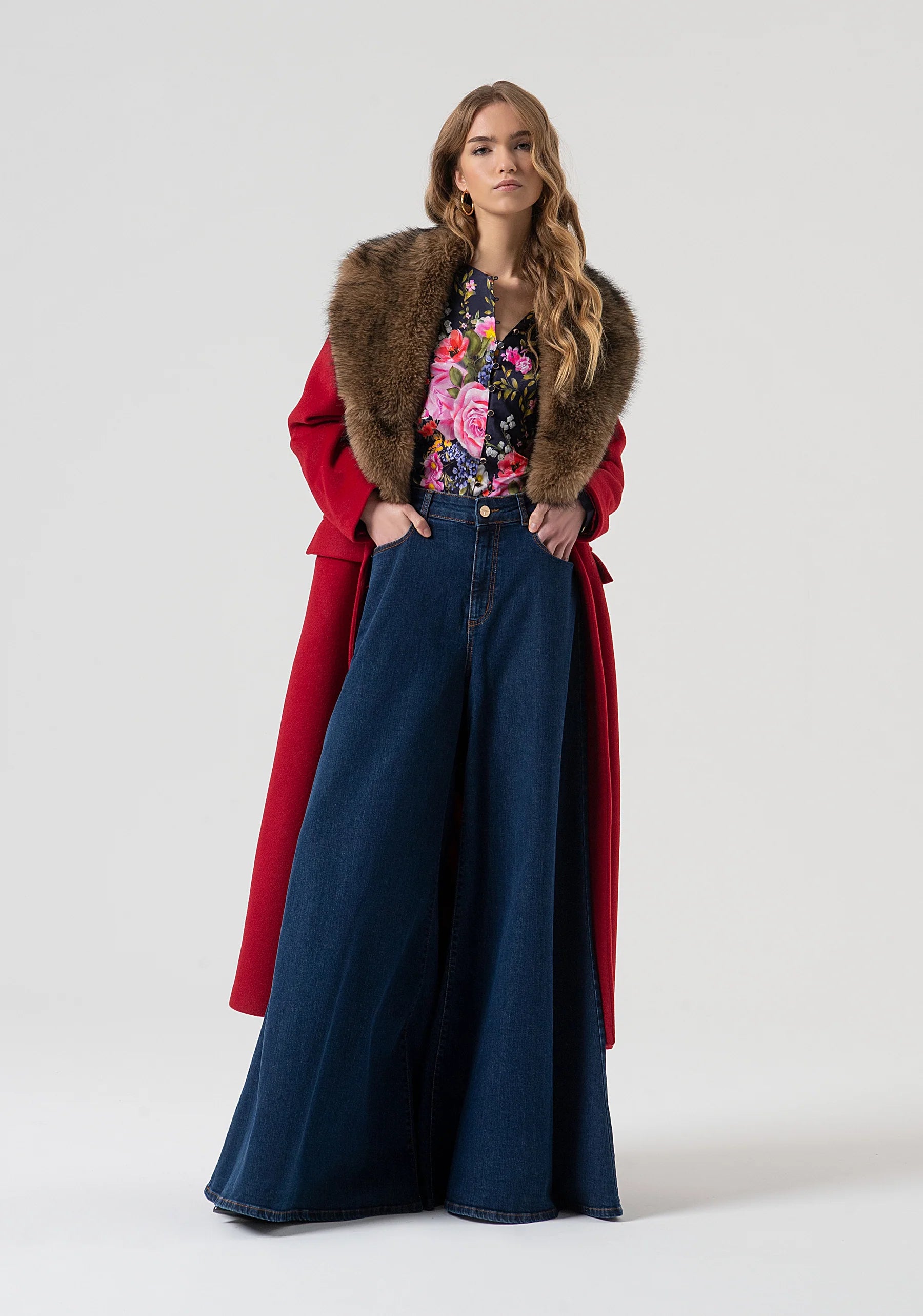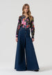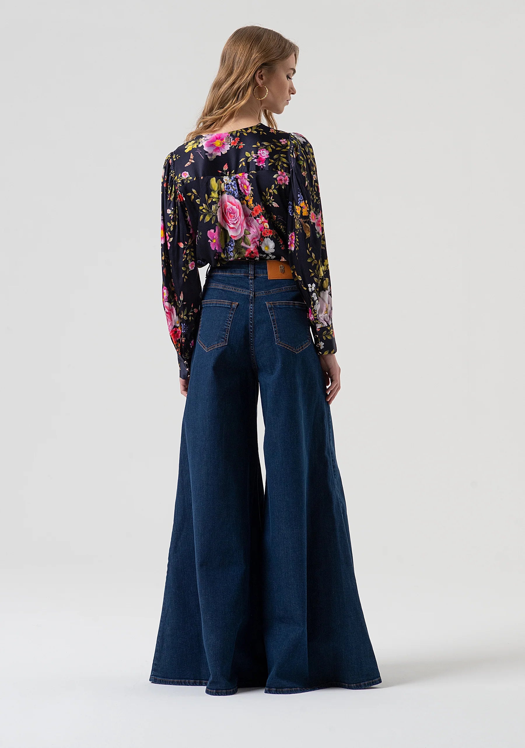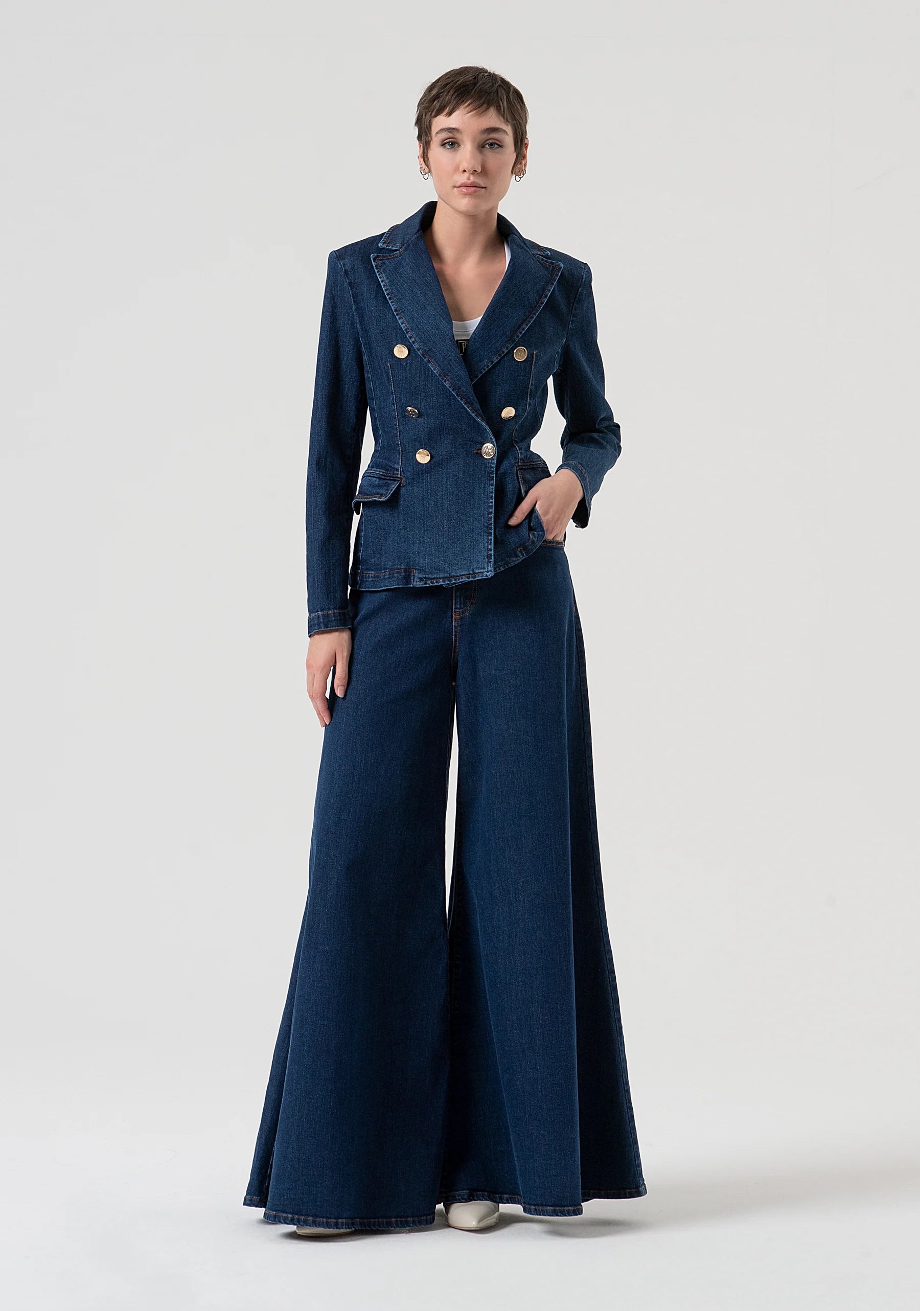 Jeans super flare in denim con lavaggio scuro, vita regolare, 5 tasche, e con fondo ampio.