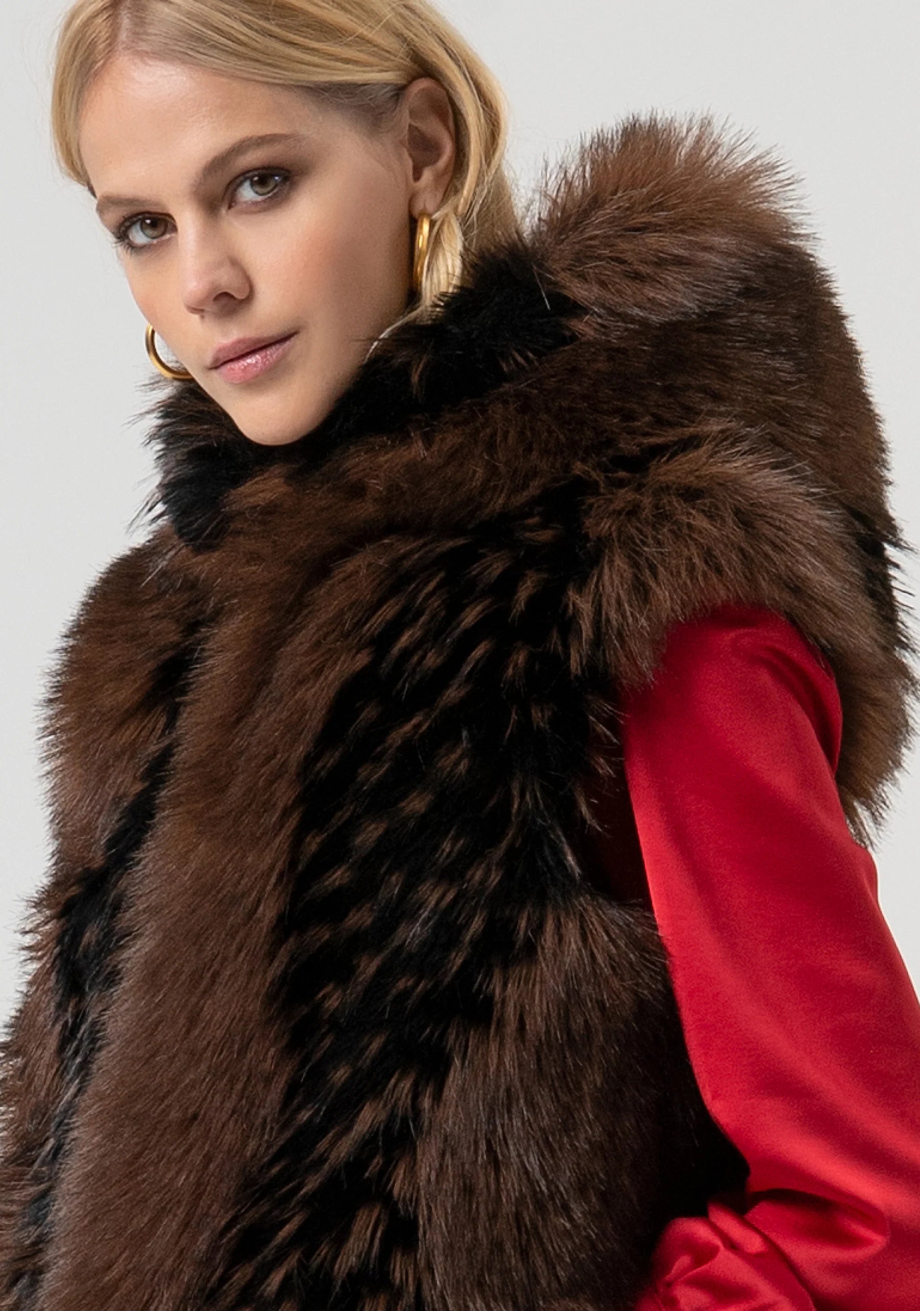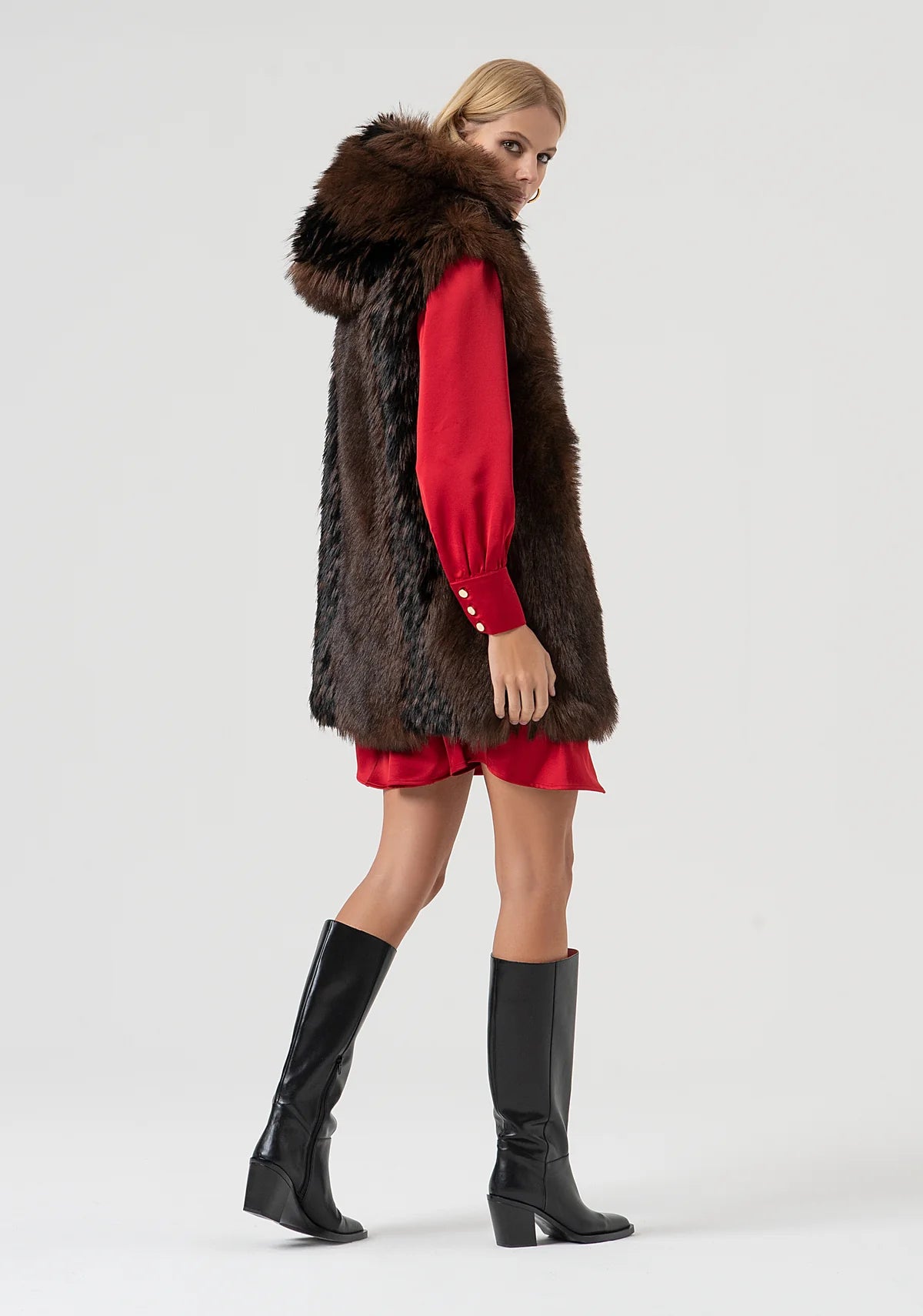 Smanicato regular lungo con cappuccio, in finta pelliccia, e con apertura centrale.