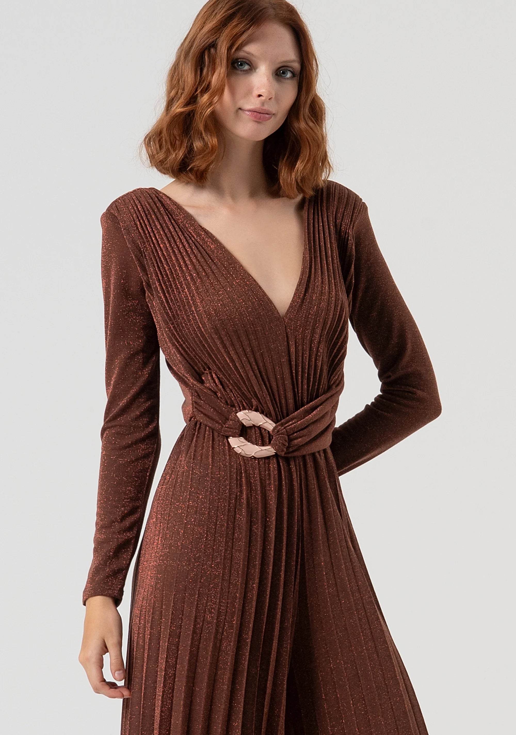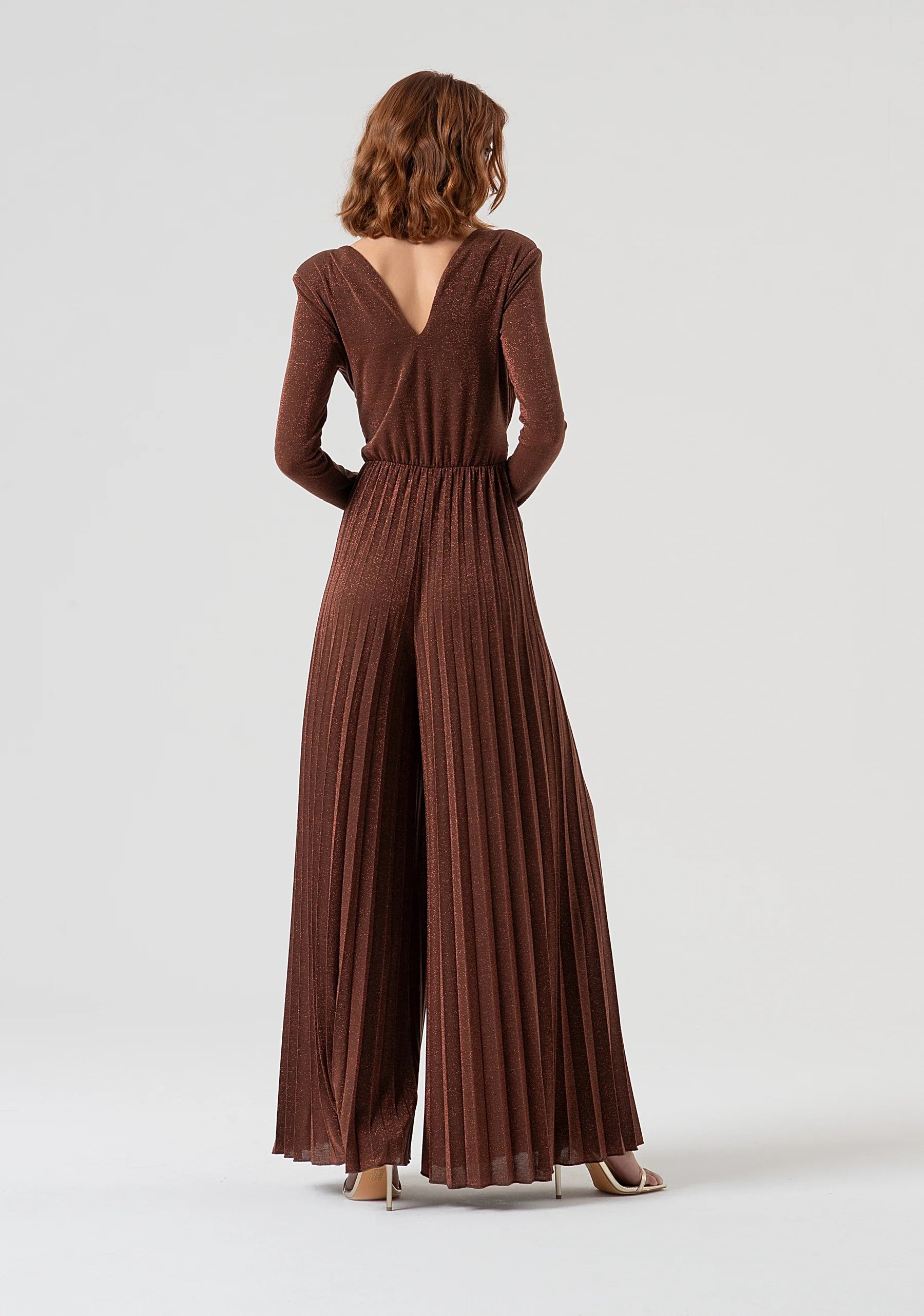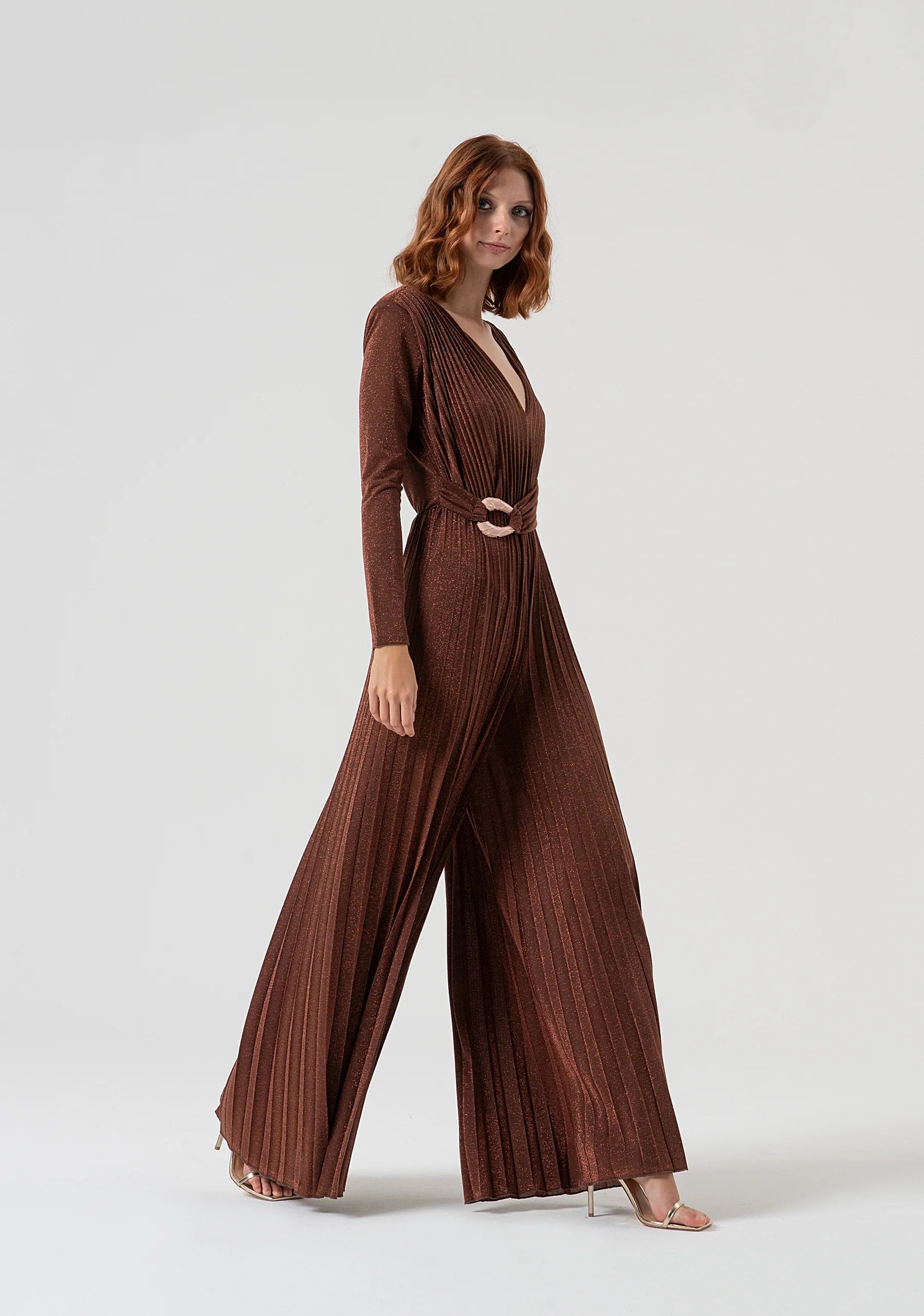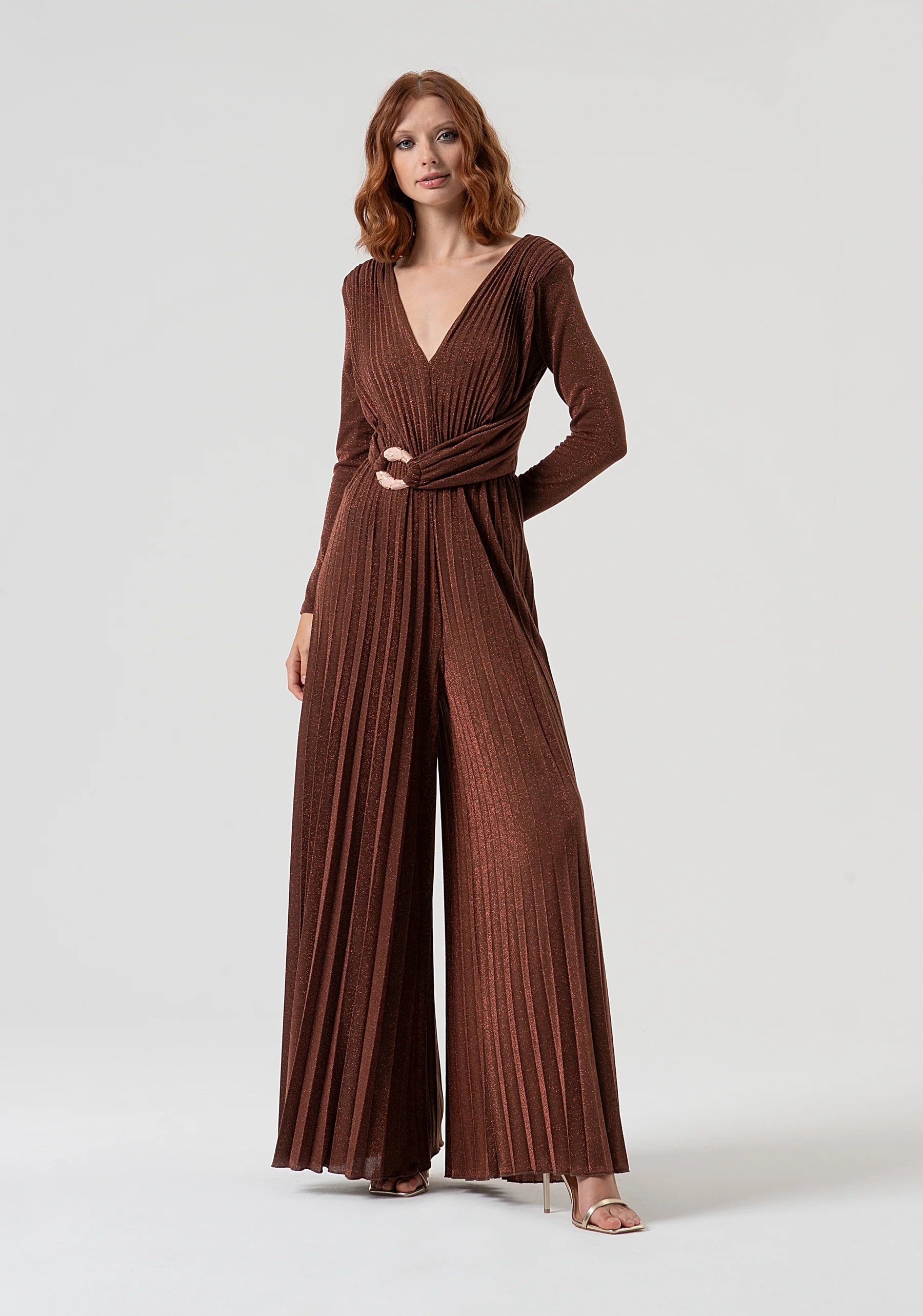 Tuta regular in tessuto plissettato, scollo a V, maniche lunghe, fusciacca in vita con accessorio metallico, e con pantalone a palazzo.