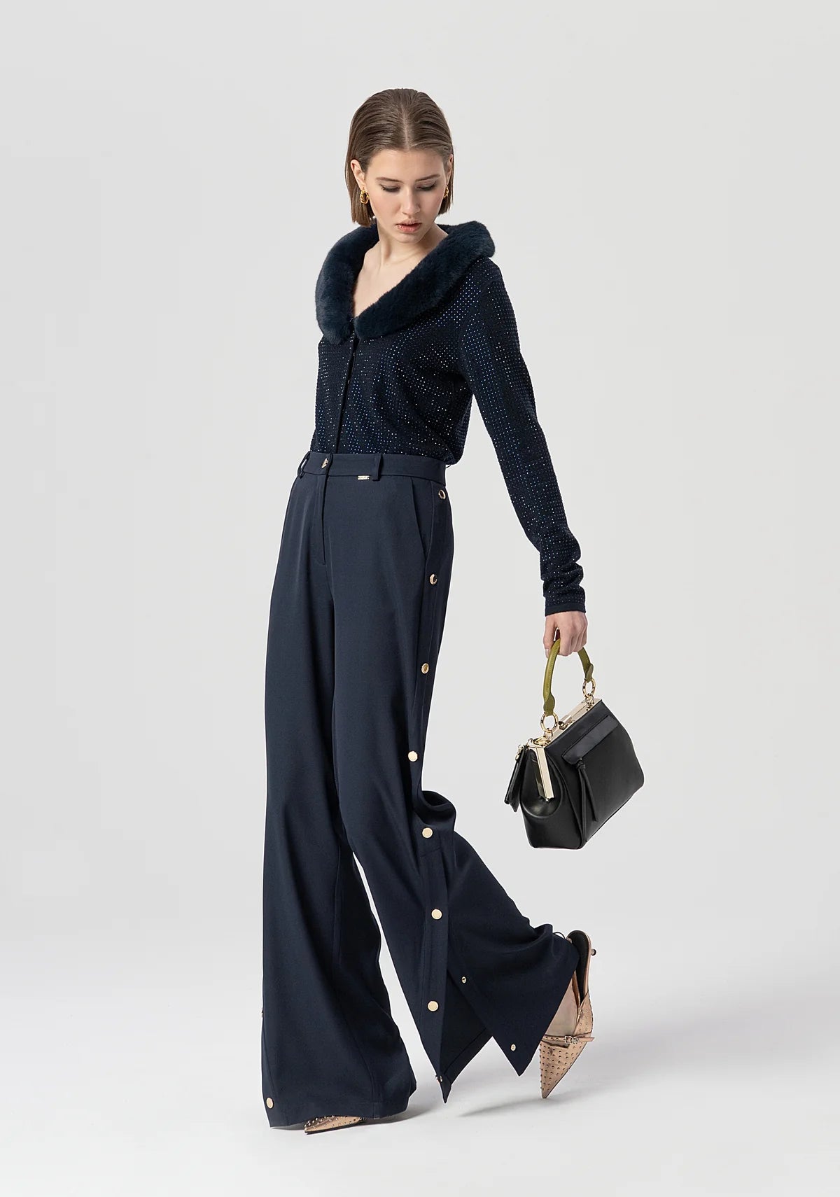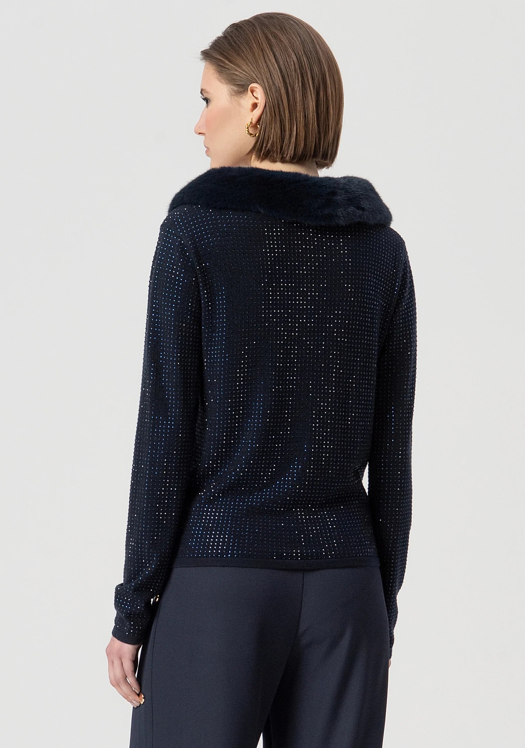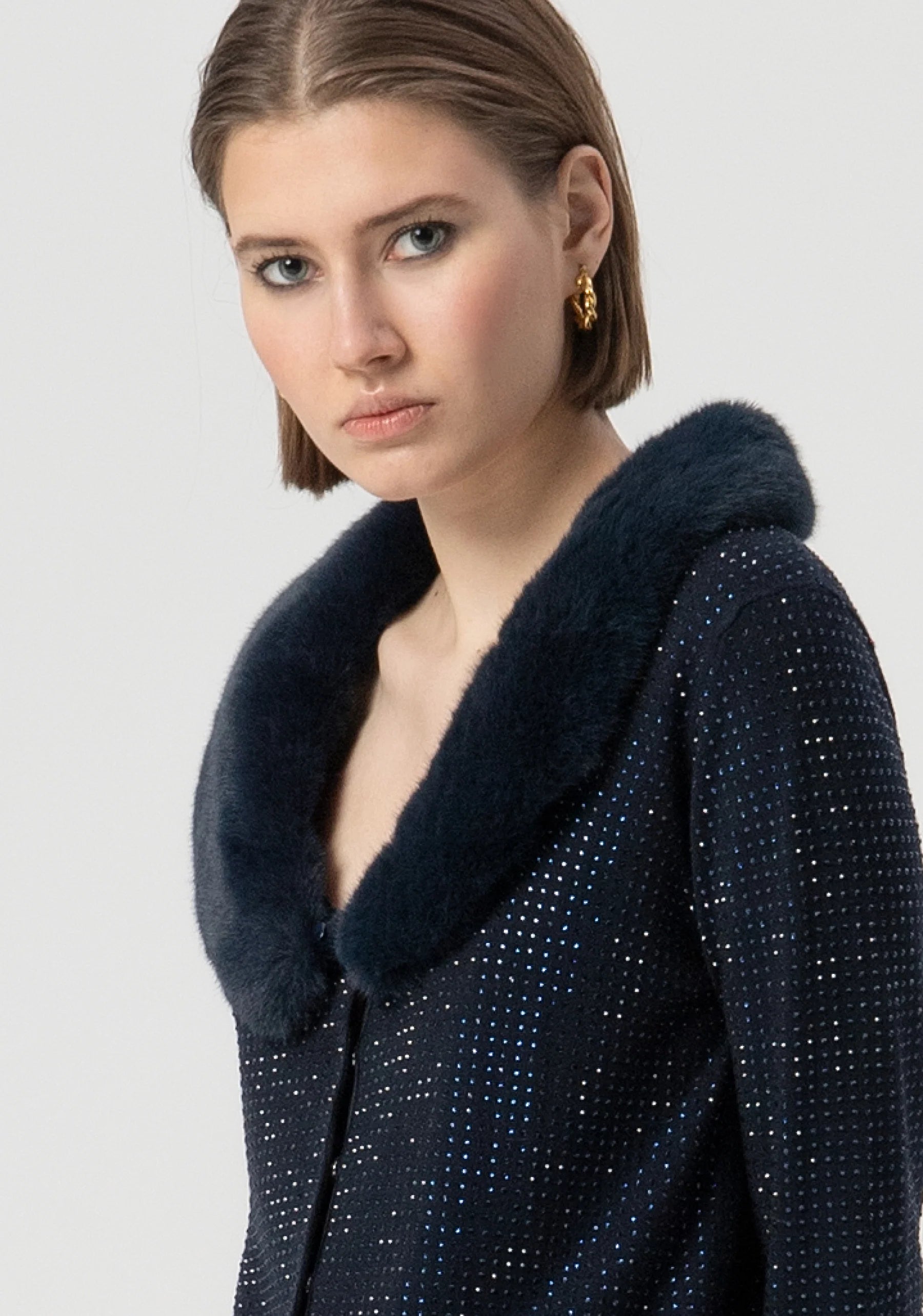 Cardigan regular con strass luminosi, scollo a V con collo in pelliccia finta, apertura centrale, e con maniche lunghe.