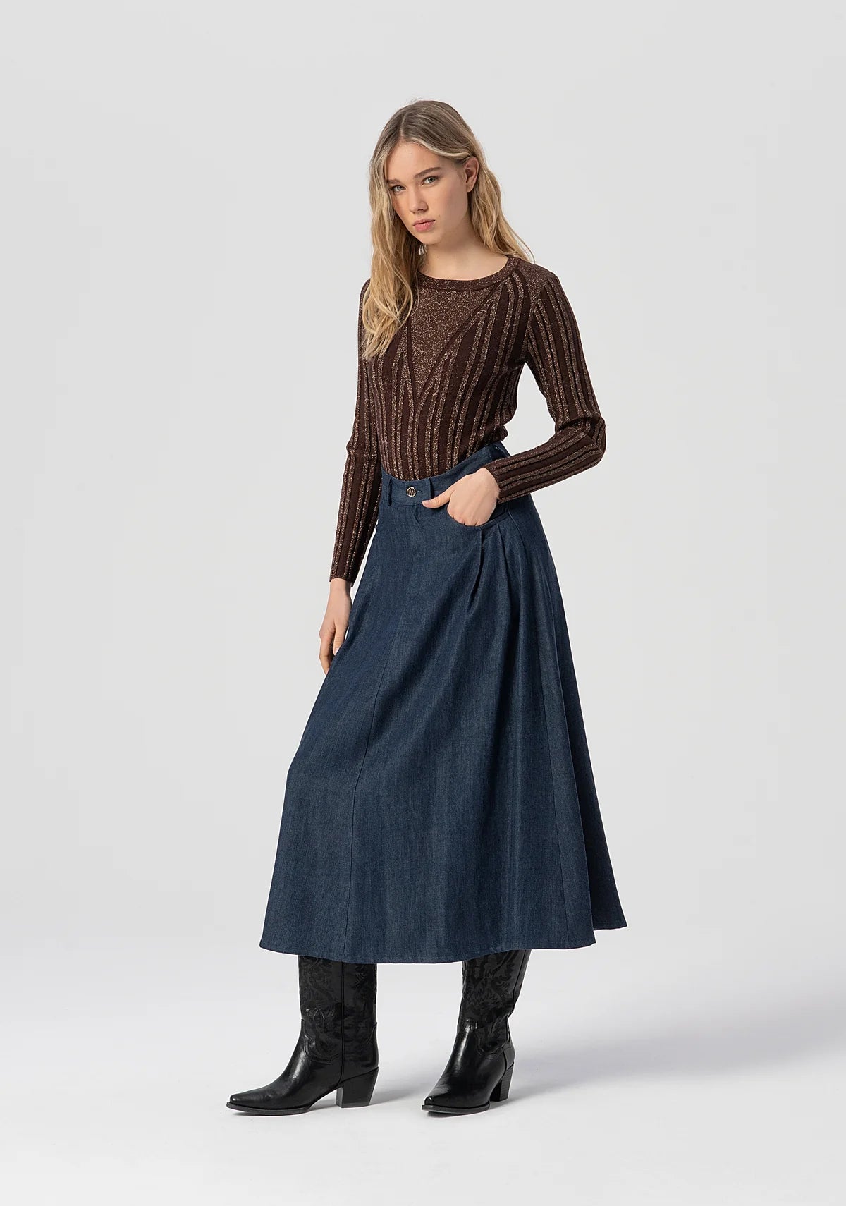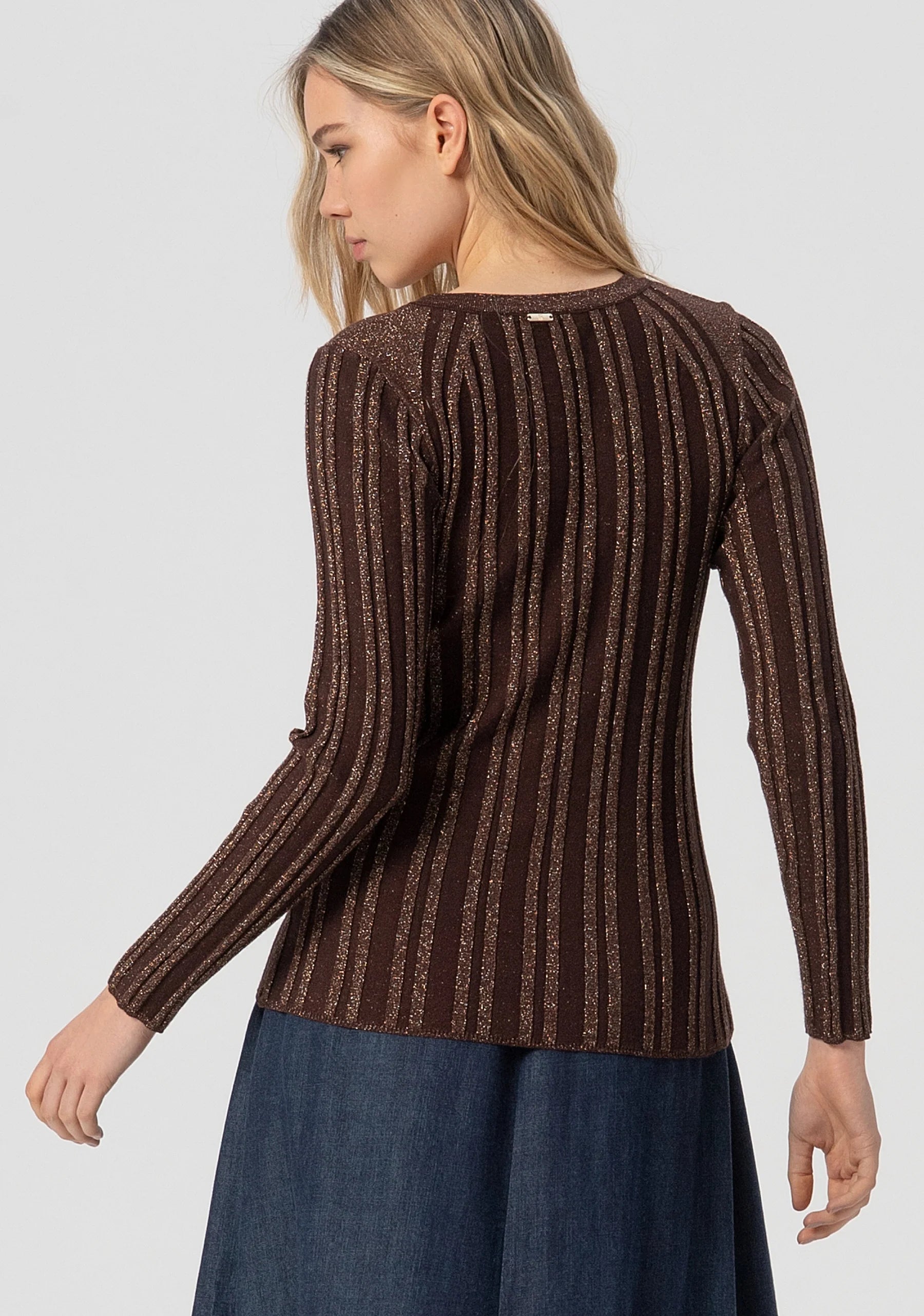 Maglia aderente con lurex, girocollo, jacquard geometrico, e con maniche lunghe.