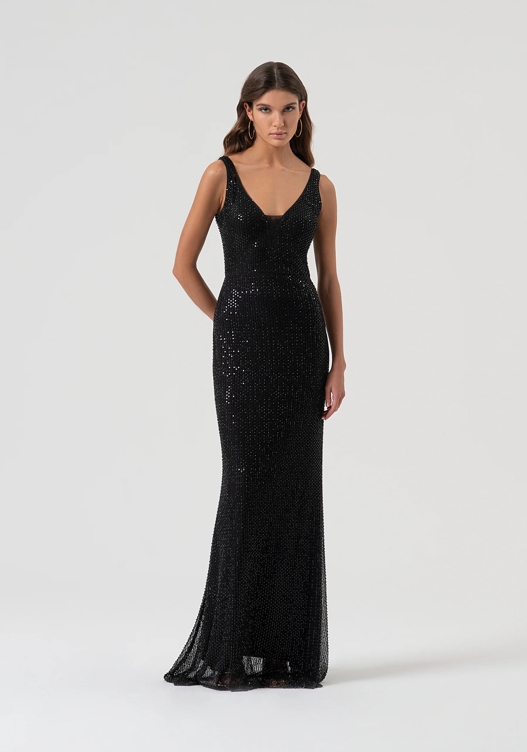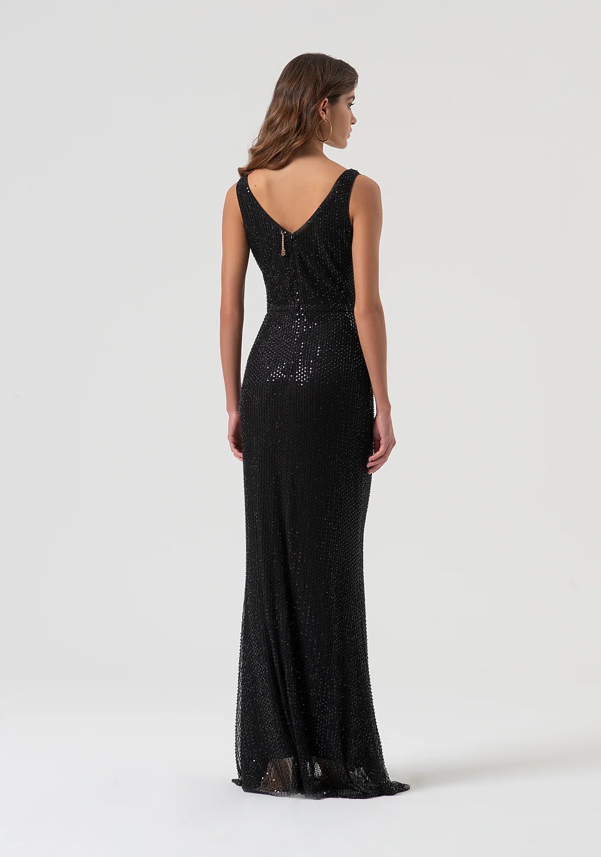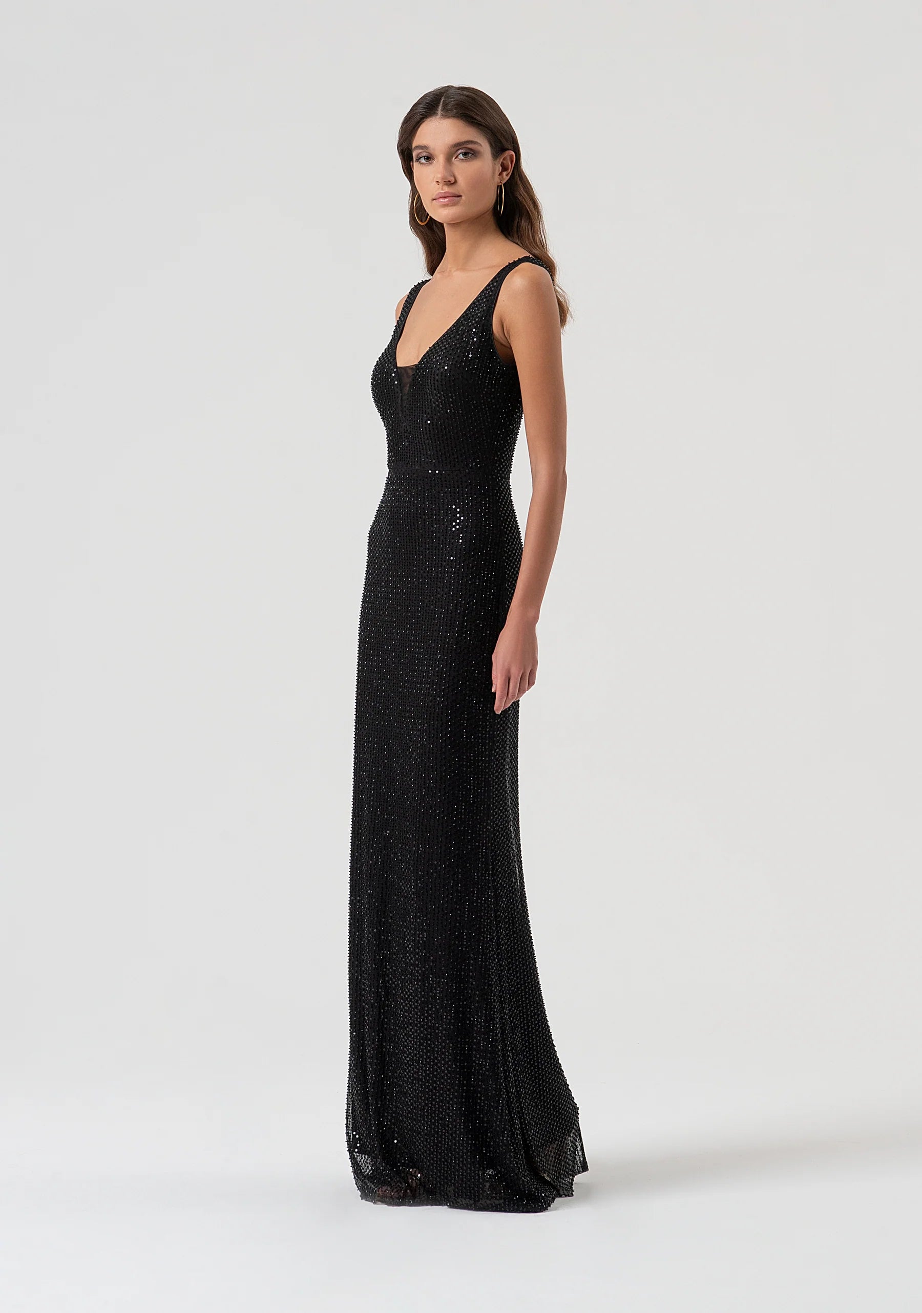 Abito senza maniche lungo con paillettes, e con scollo a V sia sul davanti che sul retro.