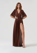 Abito lungo slim in tessuto plissettato, scollo a V, fusciacca in vita con fibbia, maniche corte, e con spacco sul davanti.