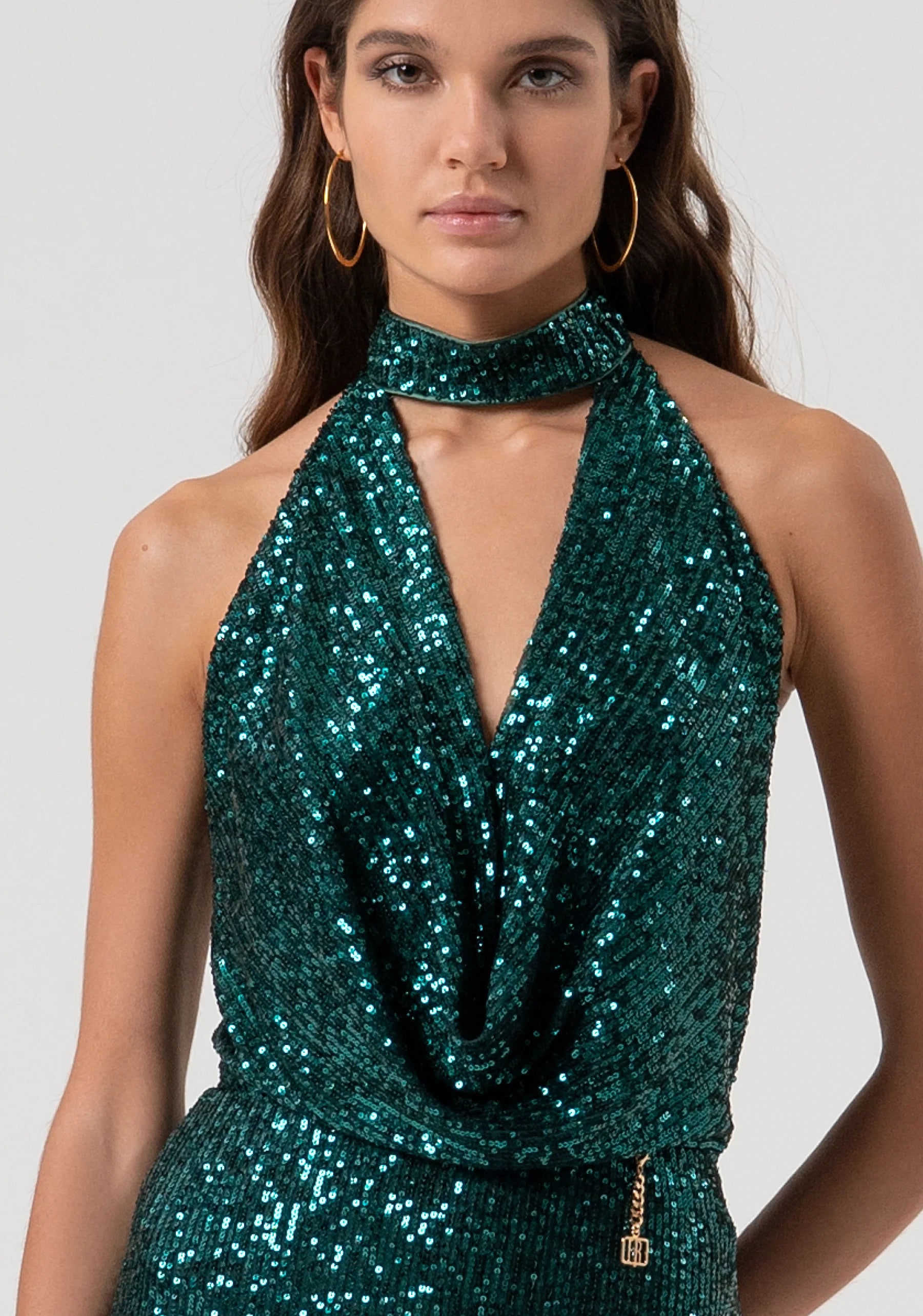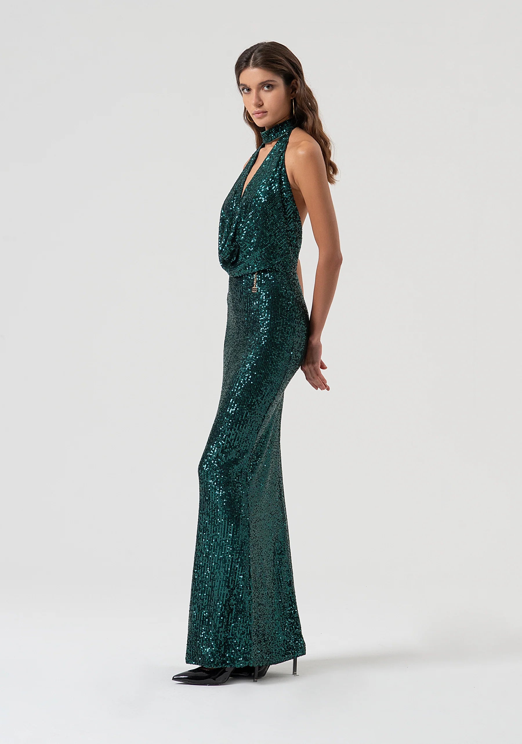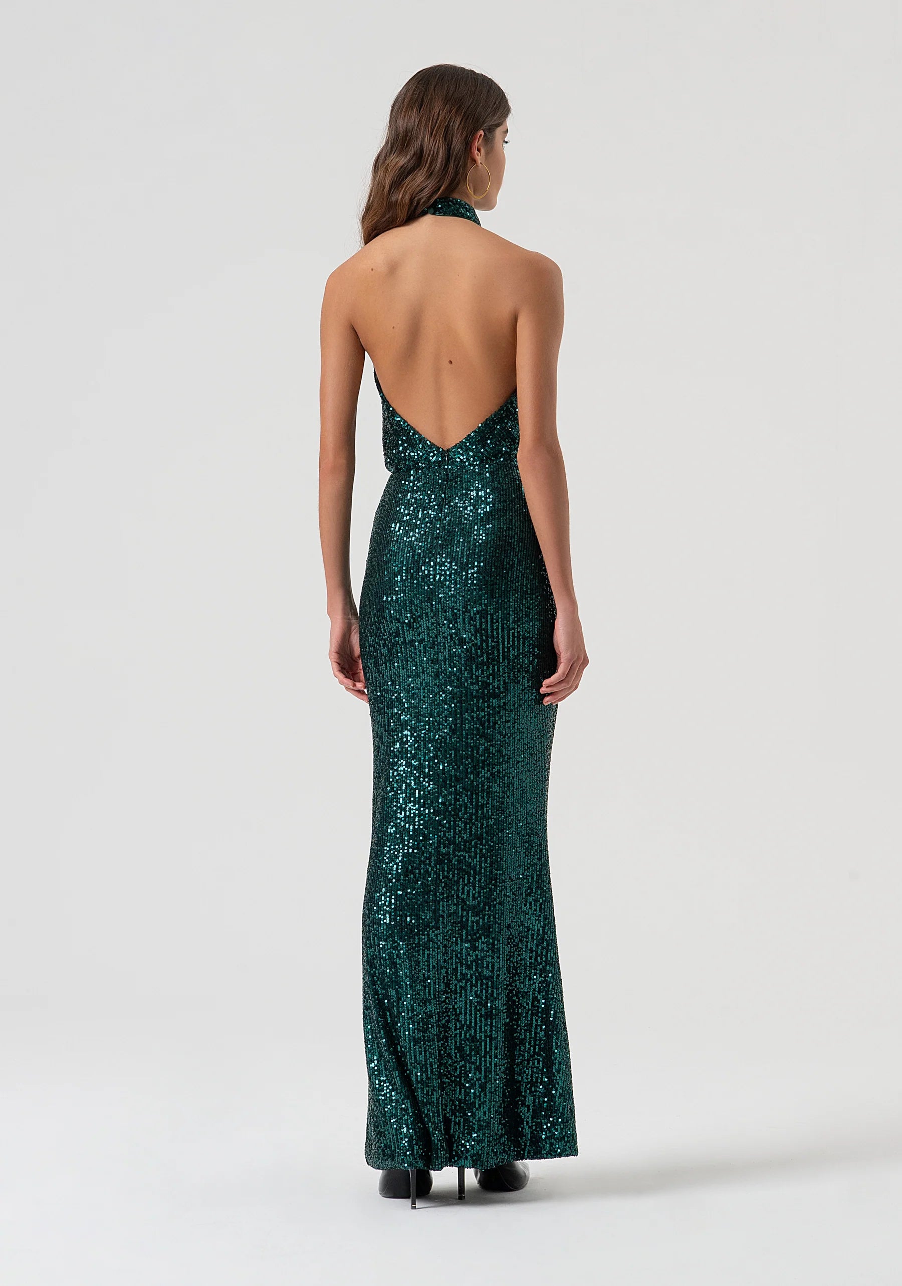 Abito senza maniche con paillettes, scollo a V con allacciatura al collo, schiena nuda, e con gonna a sirena lunga.