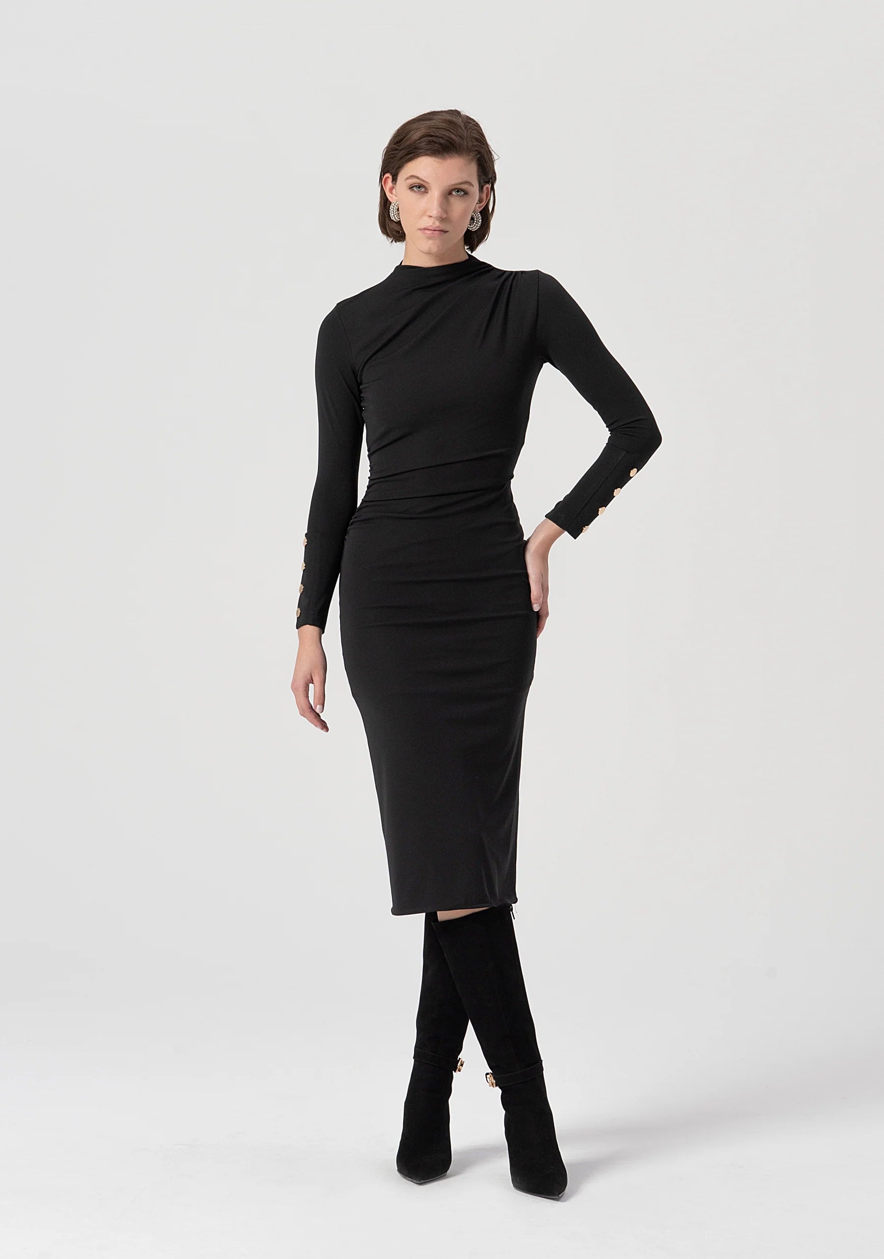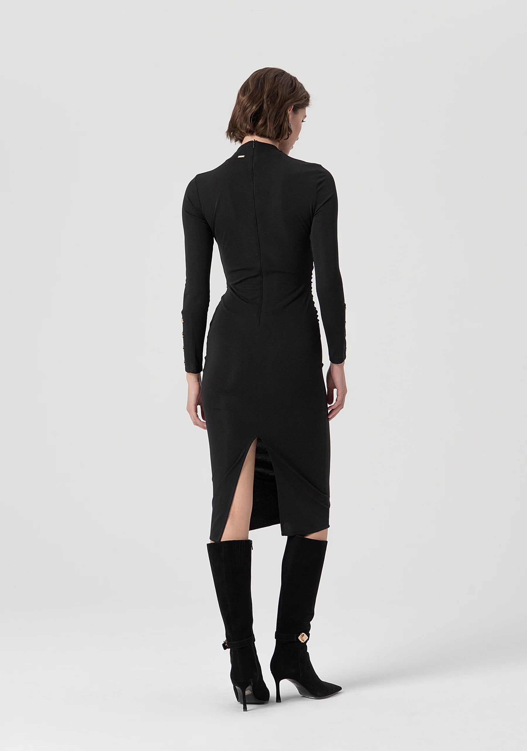 Abito slim midi in tessuto stretch, collo alto, zip sul retro per apertura, maniche lunghe, e con spacco sul fondo dietro.