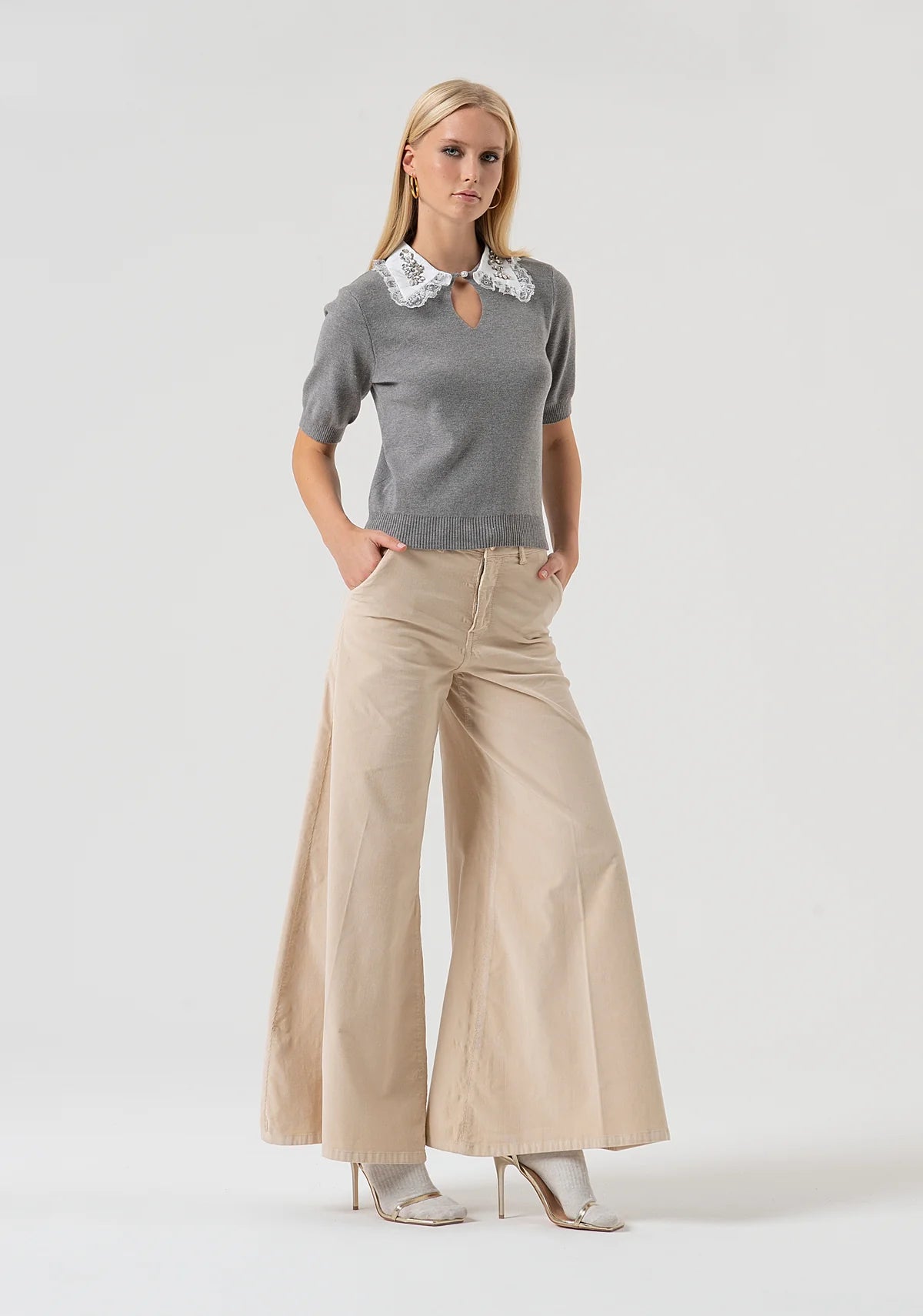 Maglia regular con maniche corte, colletto applicato con pizzo e pietre luminose, ed apertura a goccia.