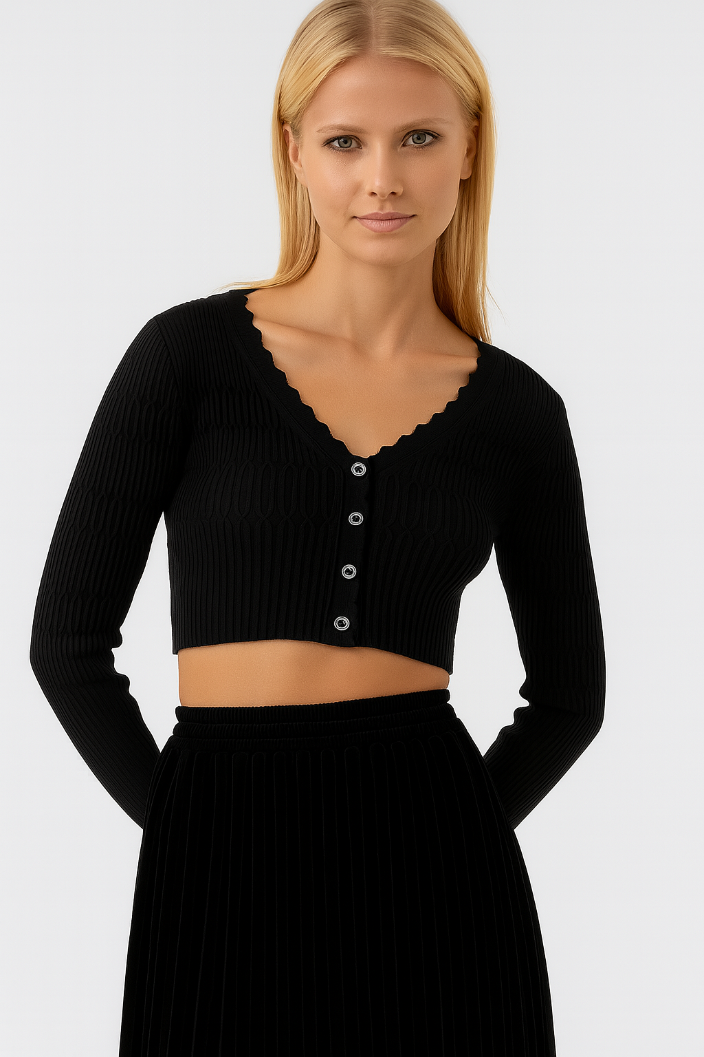 Cardigan slim cropped a costine, scollo a V, bottoni centrali per apertura, e con maniche lunghe.