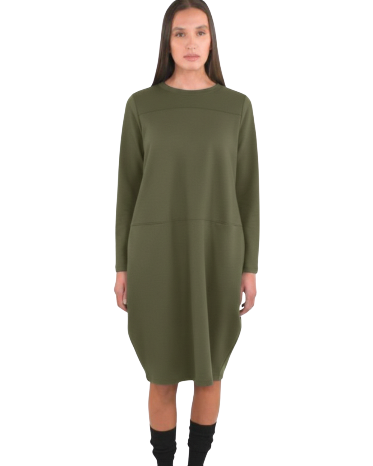 Abito midi dal design pulito e contemporaneo, caratterizzato da una silhouette morbida che accompagna il corpo senza costringerlo. Il taglio lineare è valorizzato da discrete cuciture orizzontali che definiscono la struttura del capo, mentre il girocollo e le maniche lunghe ne fanno un modello versatile e senza tempo. Ideale da indossare da solo o abbinato a capispalla sartoriali per un look raffinato e moderno.