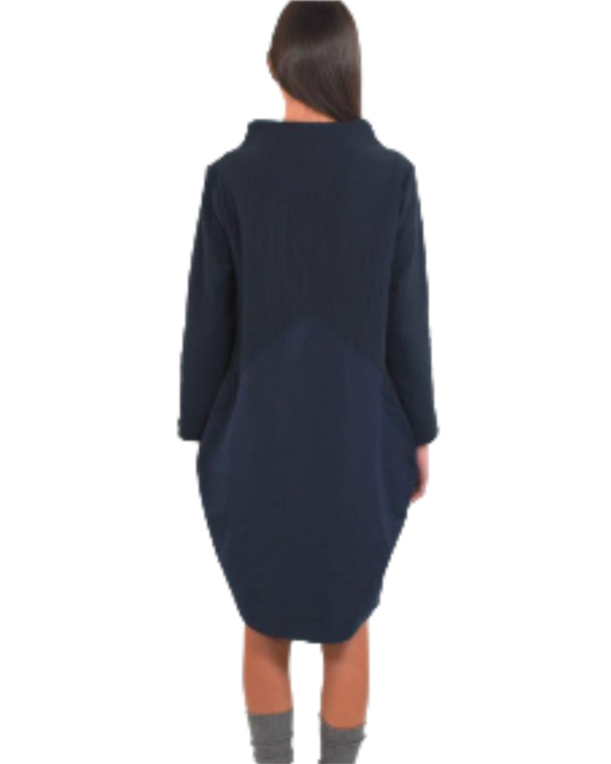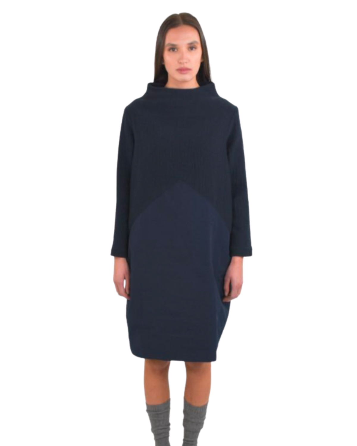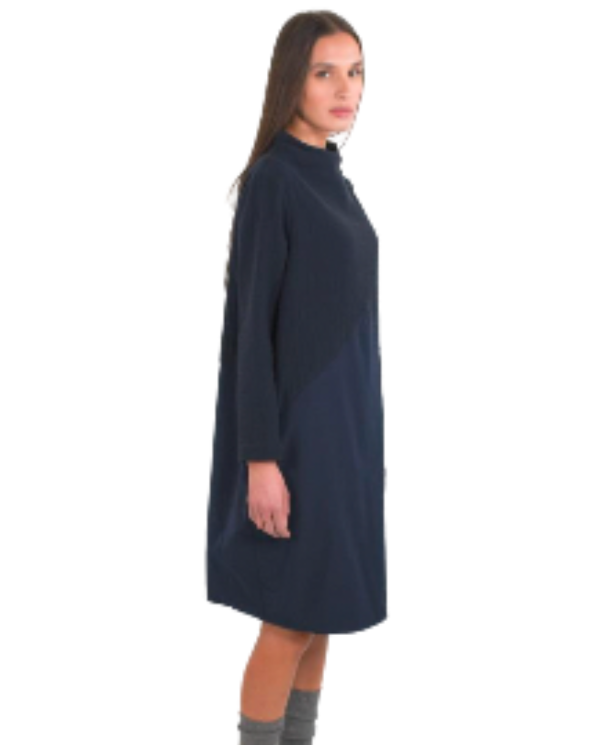 Abito midi in doppio tessuto blu, con parte superiore strutturata e pannello inferiore fluido che crea un effetto geometrico. Collo alto morbido, maniche lunghe e silhouette cocoon. Comfort e stile si uniscono in un design minimal e contemporaneo.