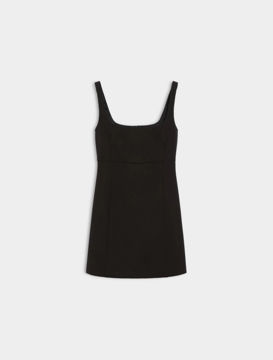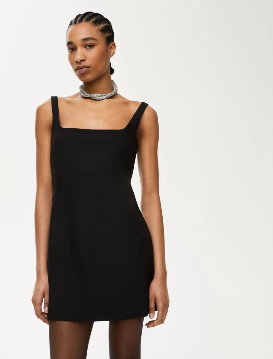 Presenta uno scollo squadrato, spalline sottili e chiusura con zip invisibile dietro.