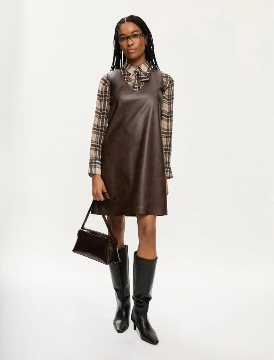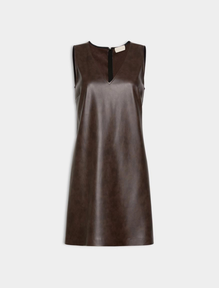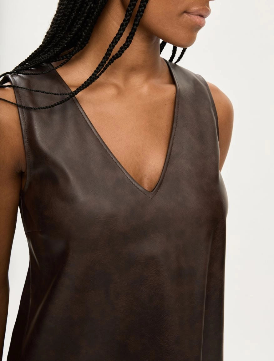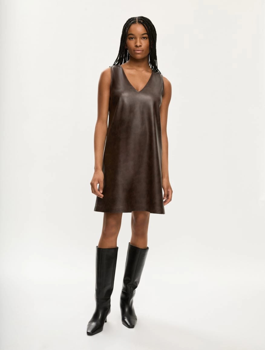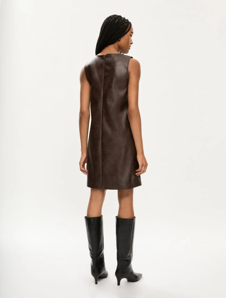 Scollo a V, senza maniche e chiusura con zip invisibile dietro.
