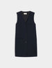 Abito corto in tessuto stretch dalla linea semiaderente e scollo a V senza maniche. Chiusura con bottoni centrali davanti lungo tutto l'abito, presenta inoltre tasche a filetto e finto taschino sul torace. Cinturino regolabile sul retro, capo foderato.
