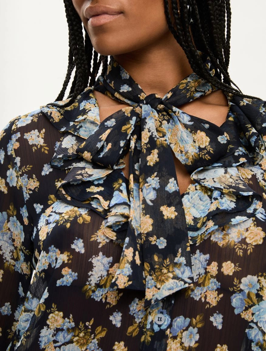 Scollo a V con fiocco e volant e con polsini arricciati.