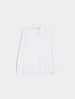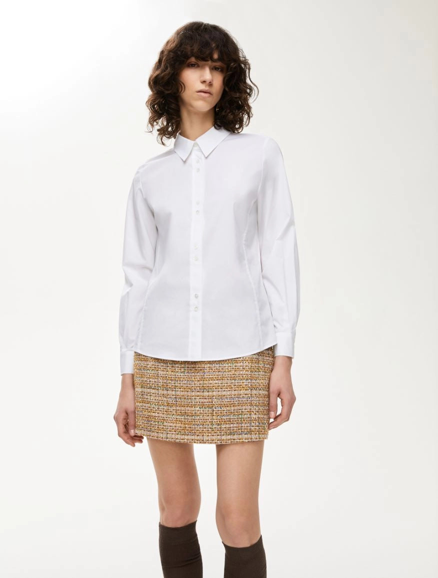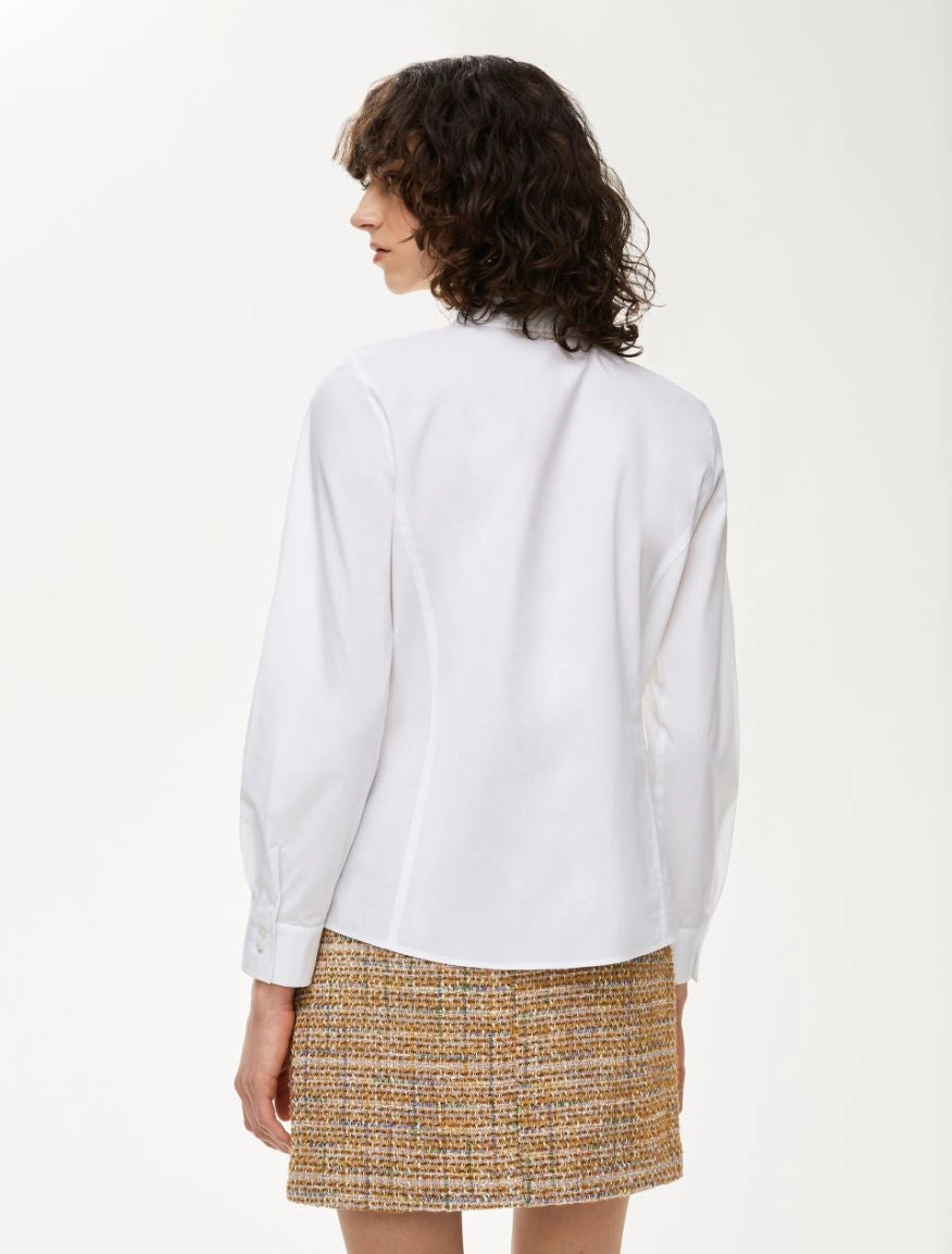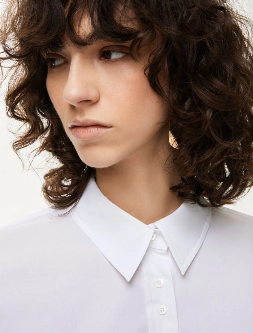 Fondo stondato e chiusura con bottoni posizionati a coppia. Presenta inoltre, colletto e maniche lunghe con polsini.