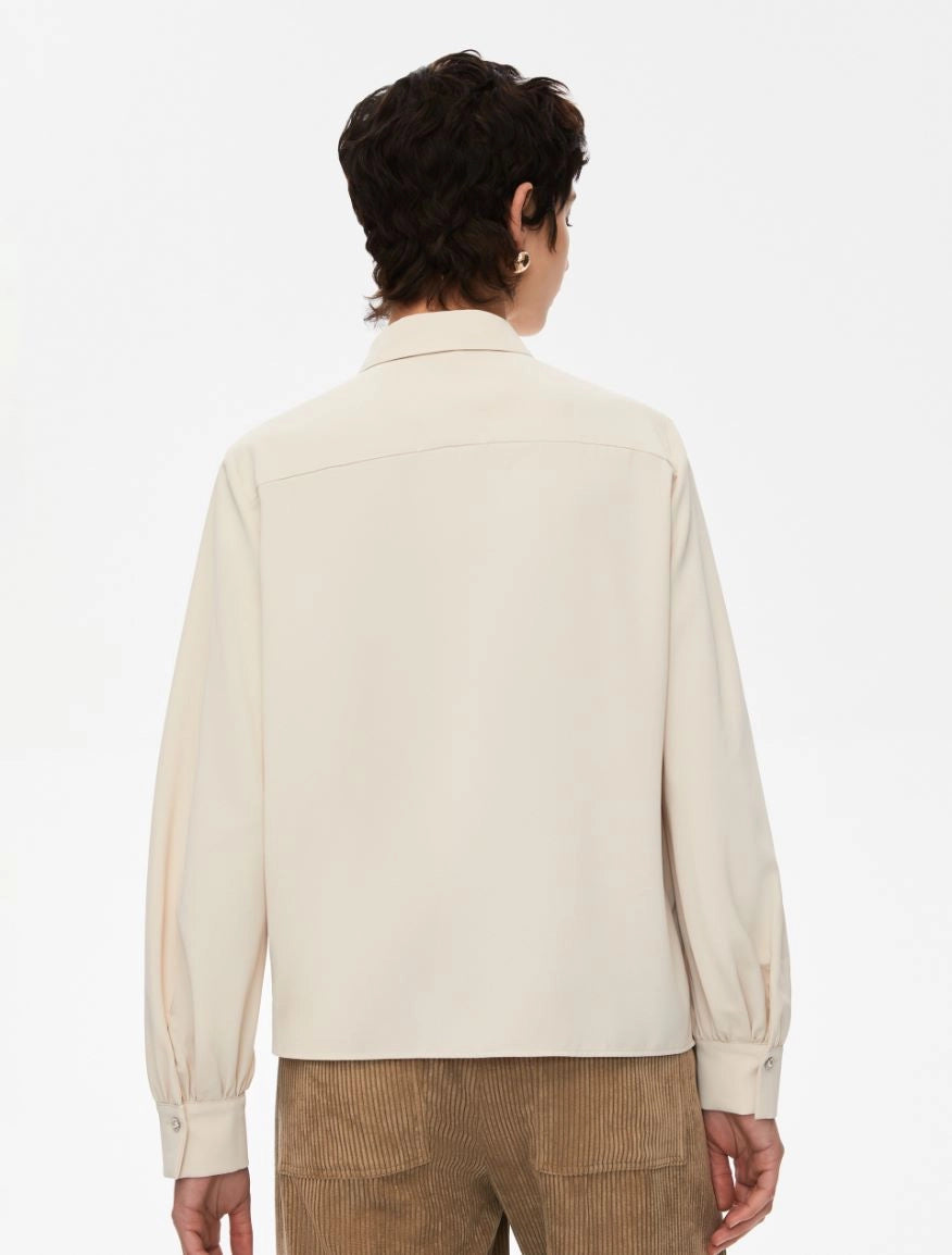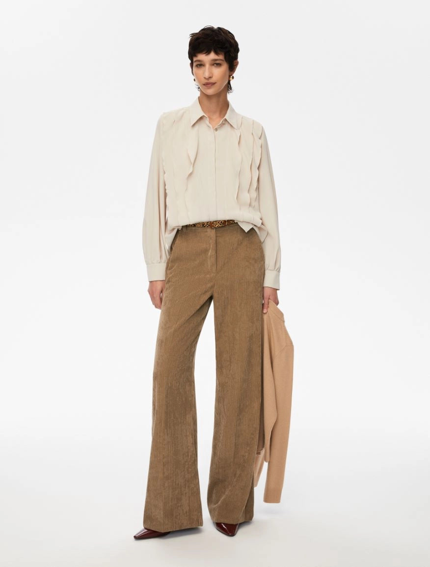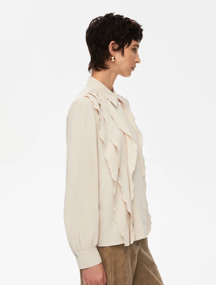 Camicia in georgette doppia dalla linea morbida. Presenta ruches sul davanti come elemento decorativo.