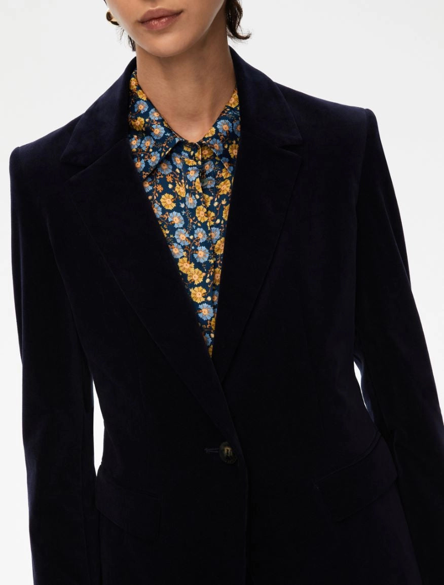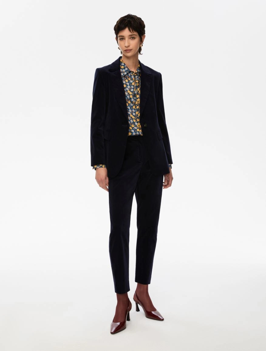 Blazer monopetto in velluto misto cotone stretch dalla vestibilita' aderente e linea sfiancata. Capo foderato con collo a rever e tasche a patta.