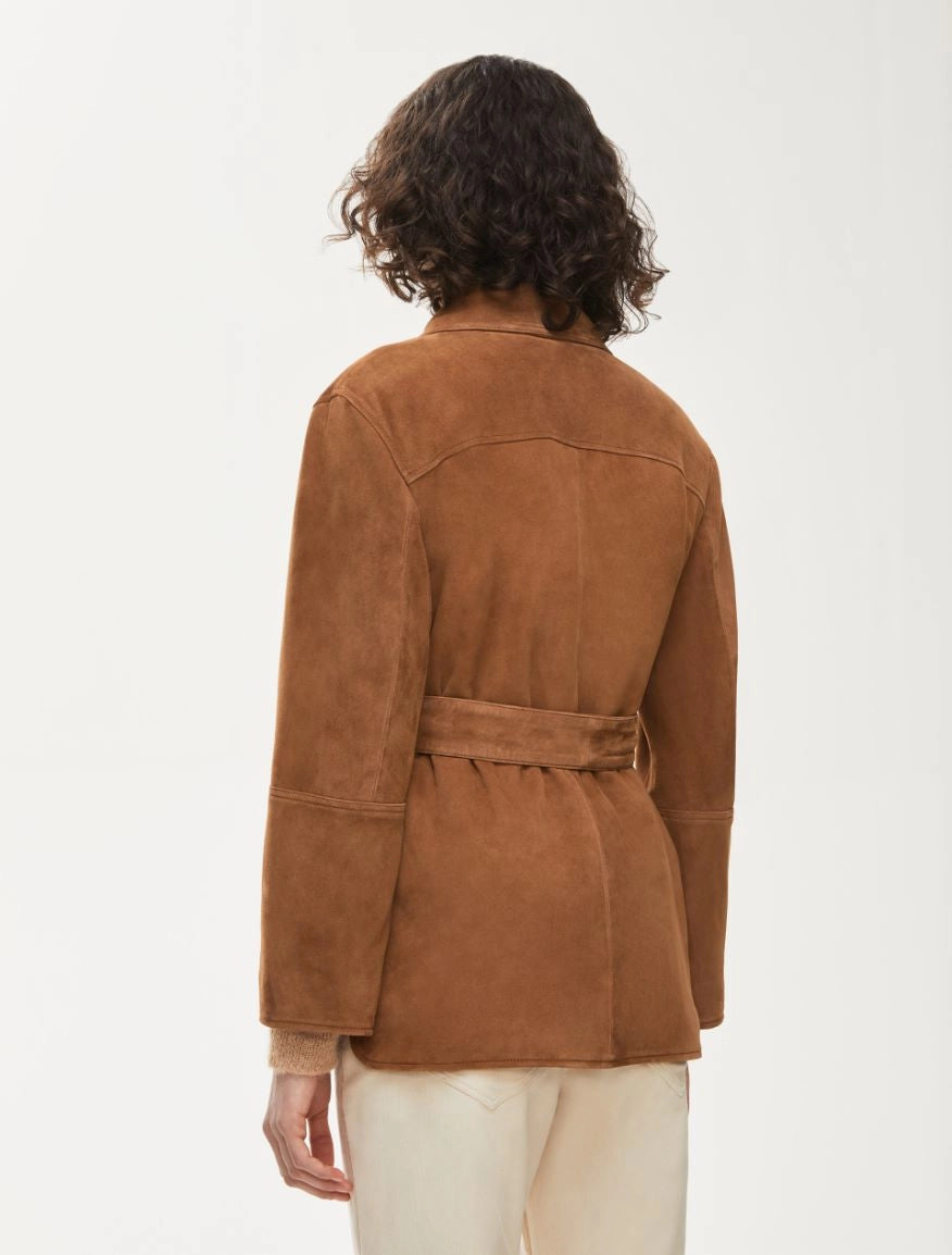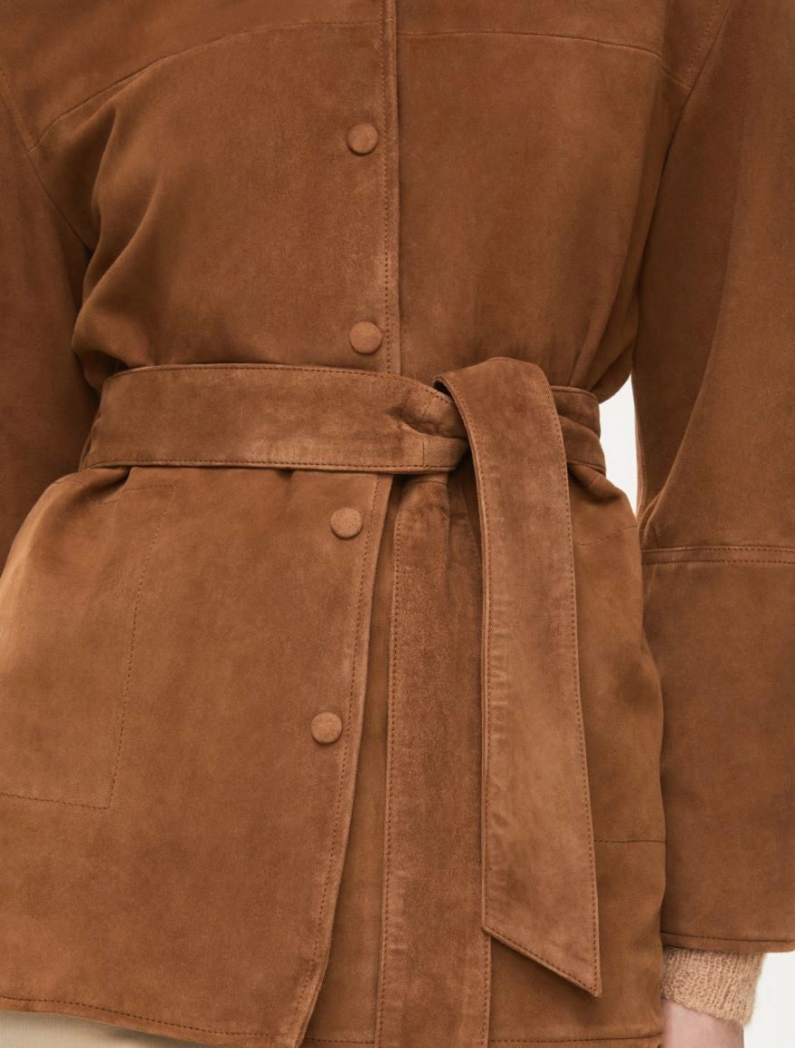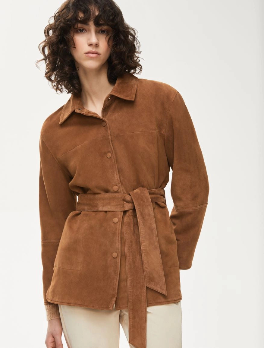 Giacca camicia in pelle scamosciata. Linea dritta e vestibilità regolare. Presenta colletto, maniche lunghe, tasche laterali, spacchetti stondati sul fondo e fodera interna. Chiusura con bottoni a pressione ricoperti in pelle e cintura abbinata.