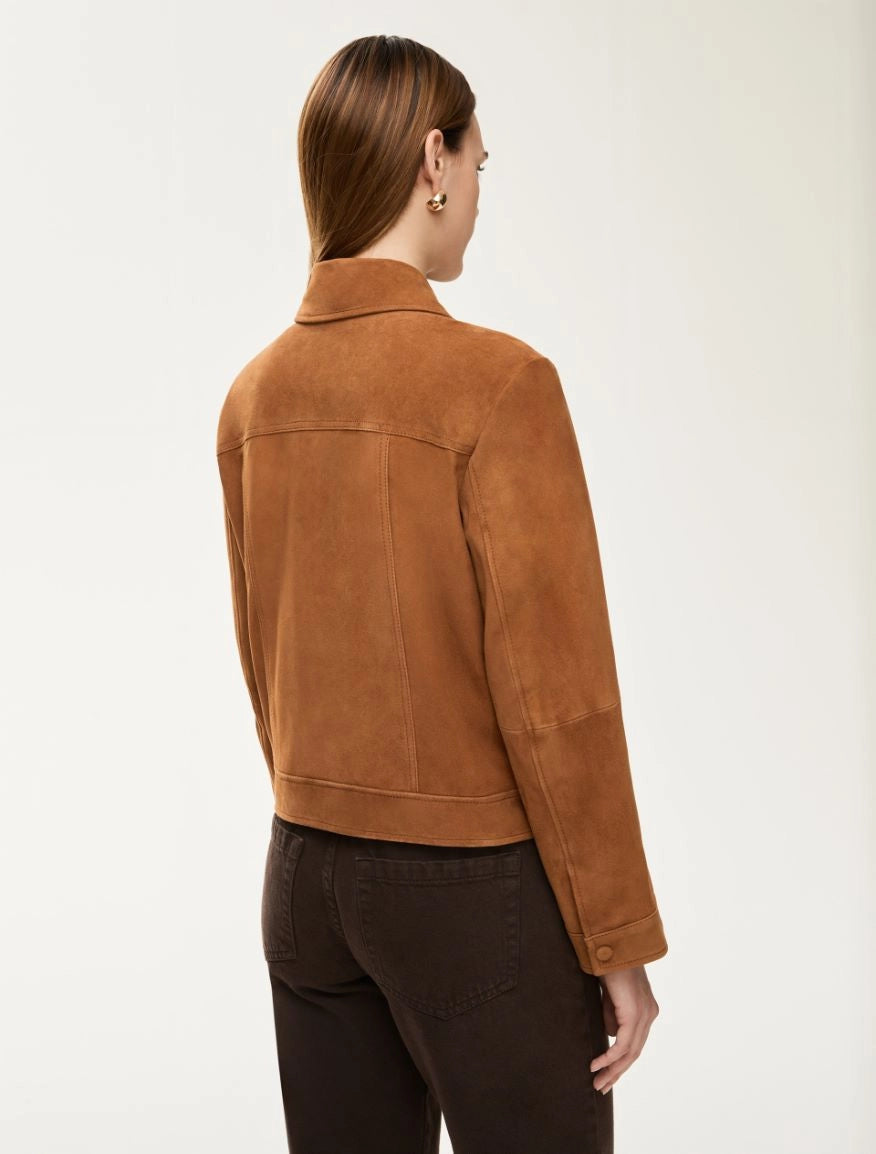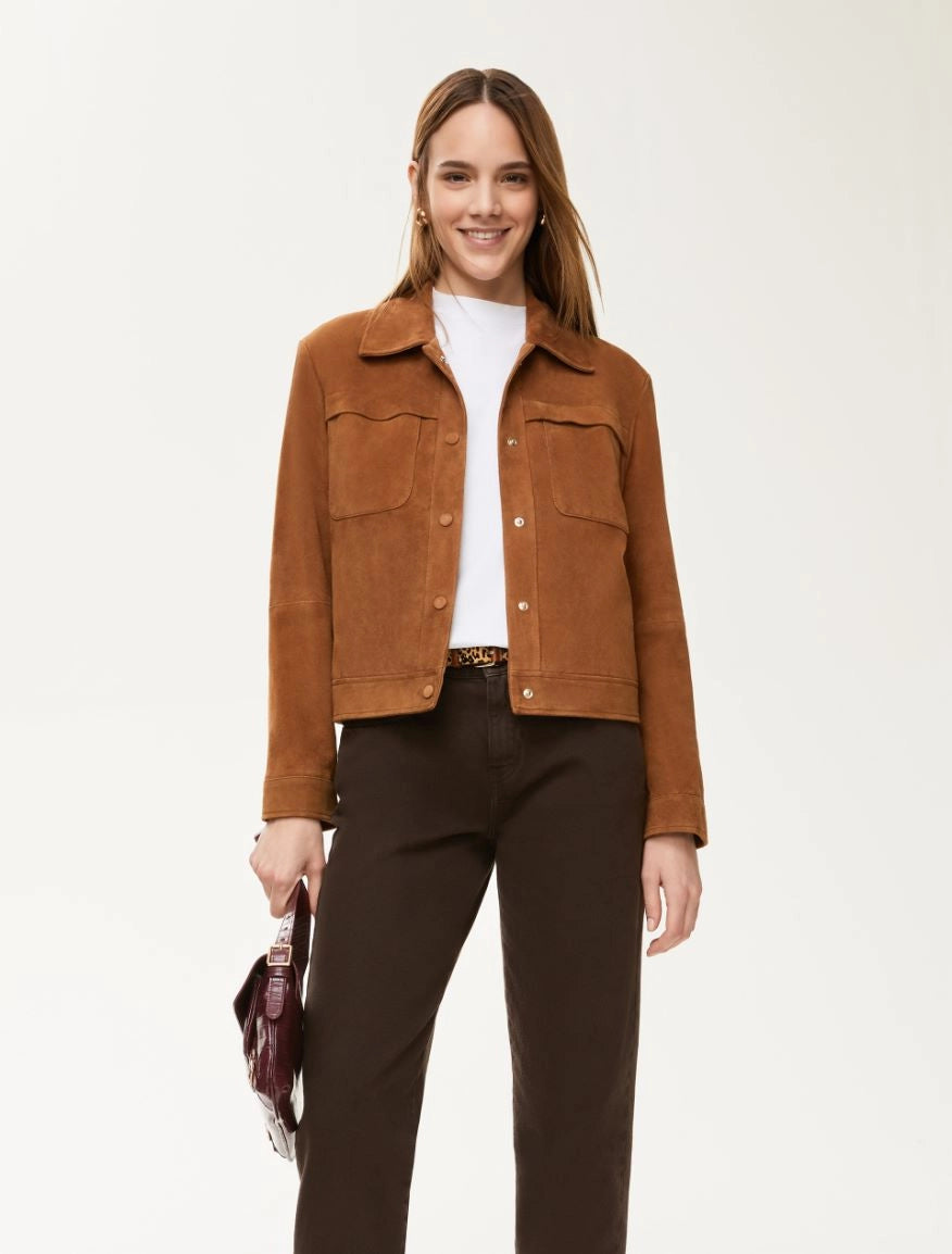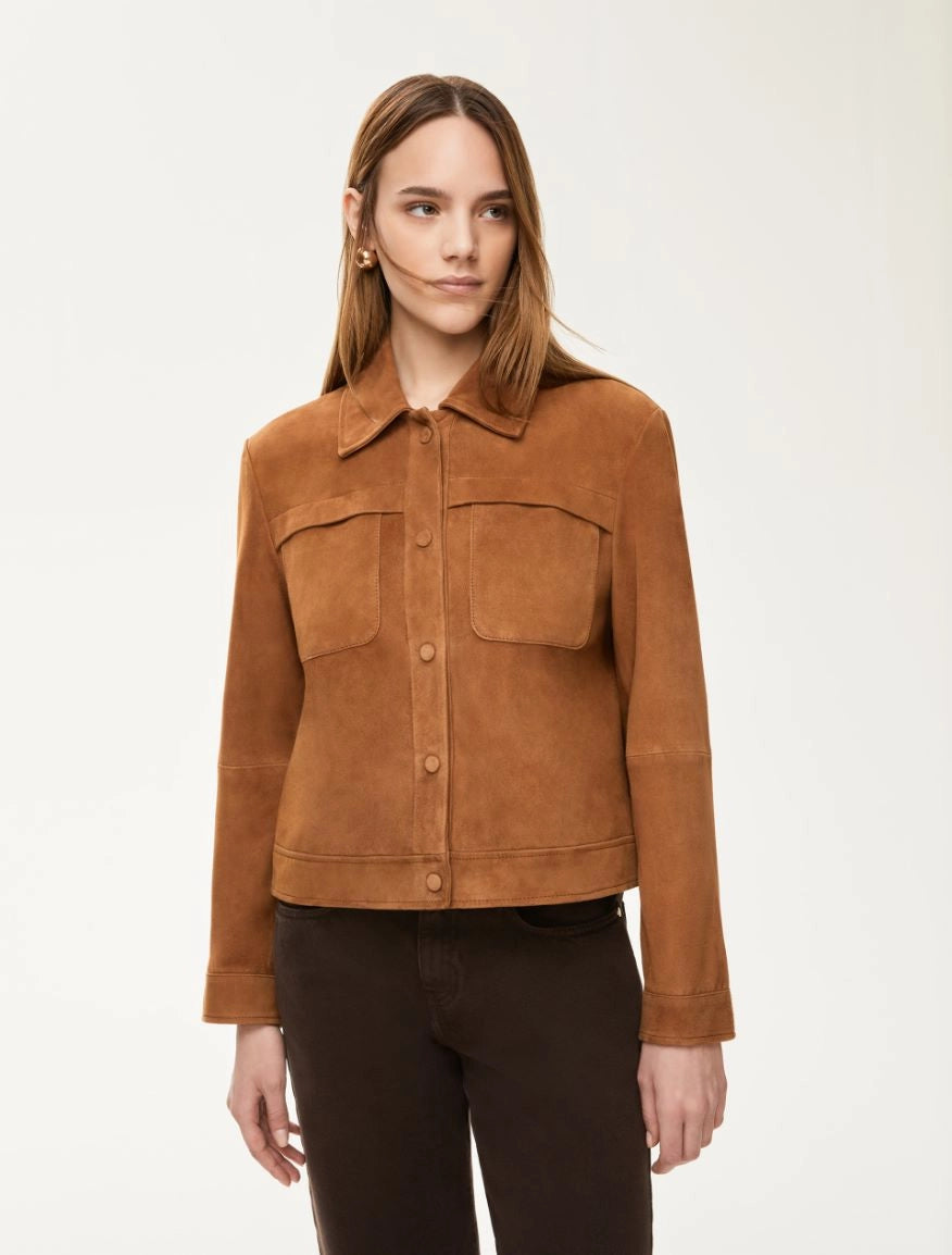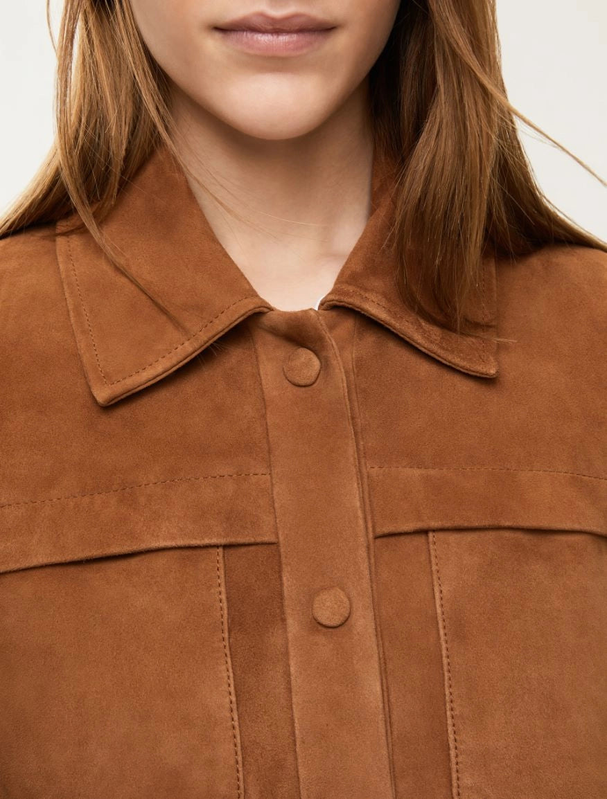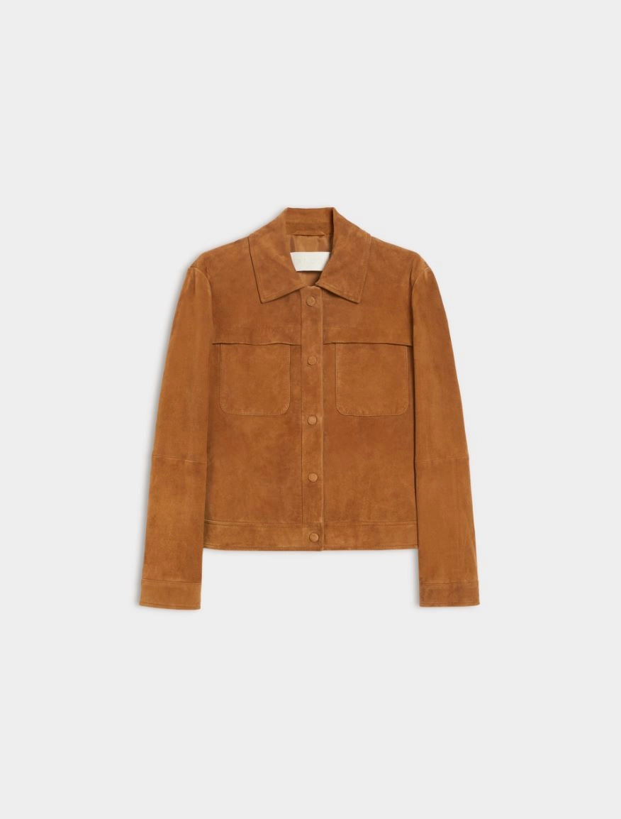 Giacca in pelle scamosciata dalla linea boxy e vestibilita' regolare. Presenta colletto a camicia, maniche lunghe con bottoni a pressione sul fondo e davanti ricoperti in pelle. Sul petto troviamo tasche applicate. Capo foderato
