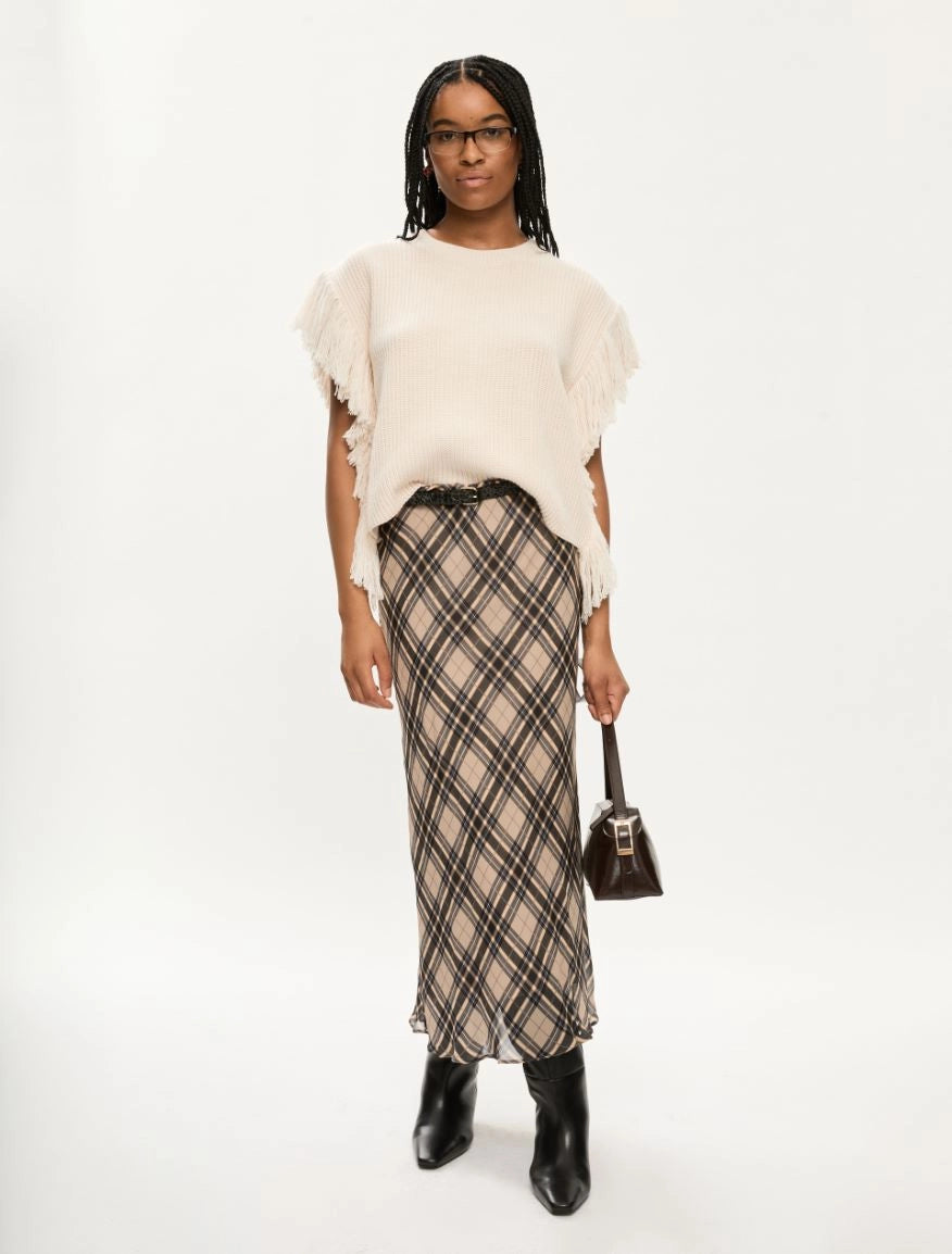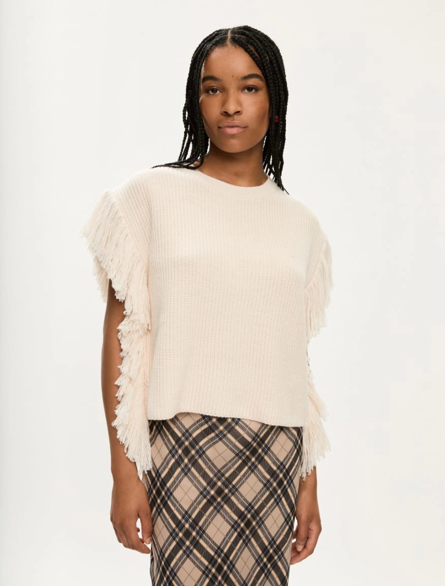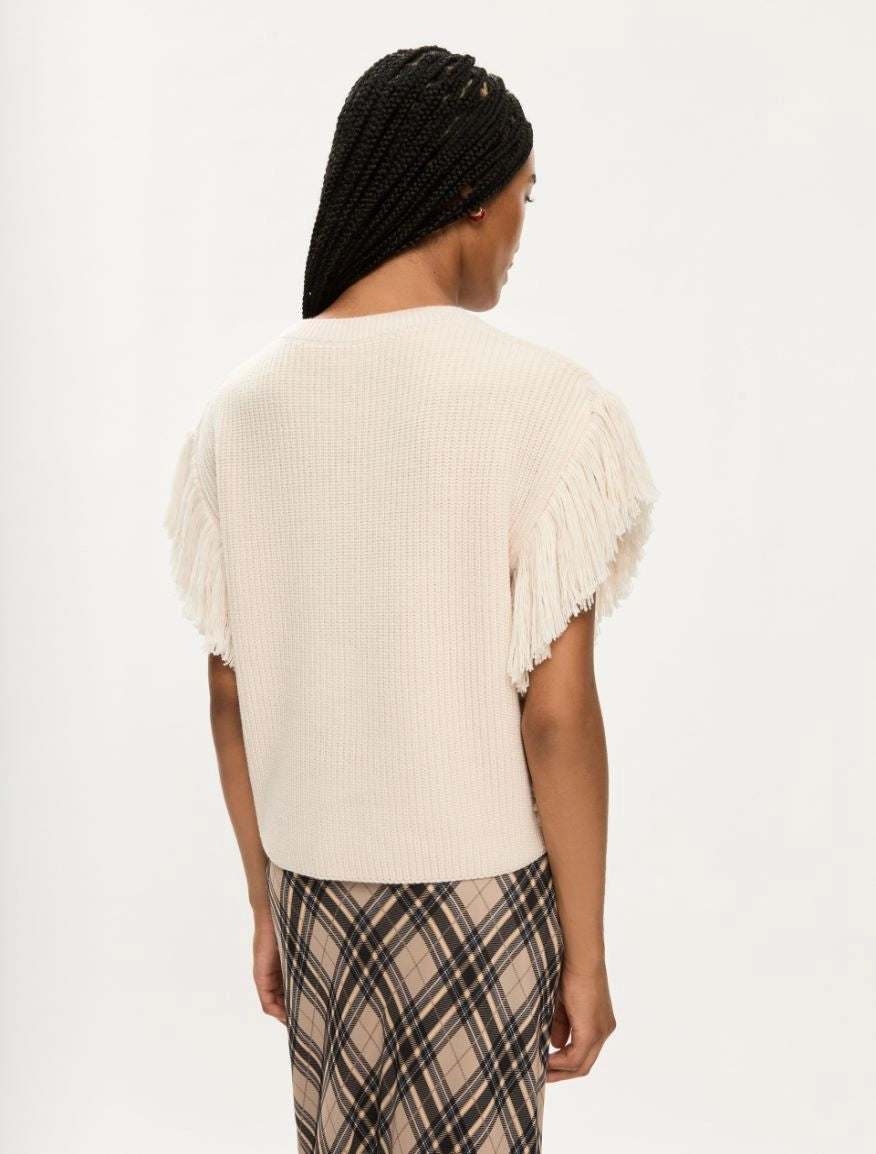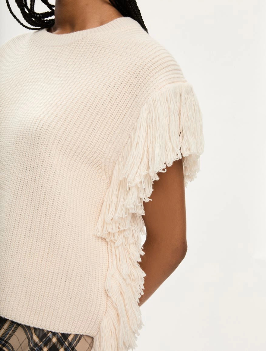 Presenta una scollatura tonda e frange su giro manica e fianchi. Senza maniche