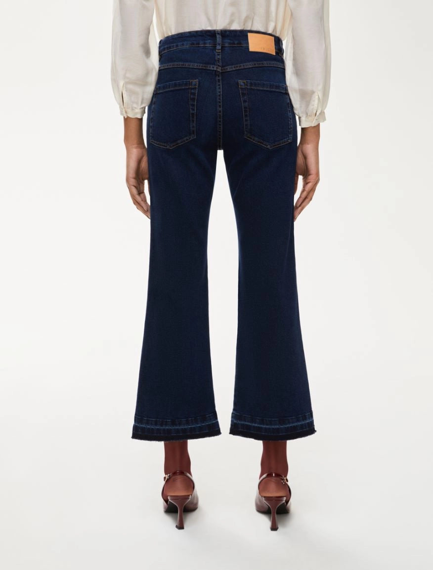 Jeans Flare in denim di cotone stretch con cinque tasche e orlo sfrangiato.