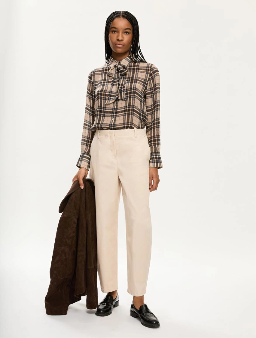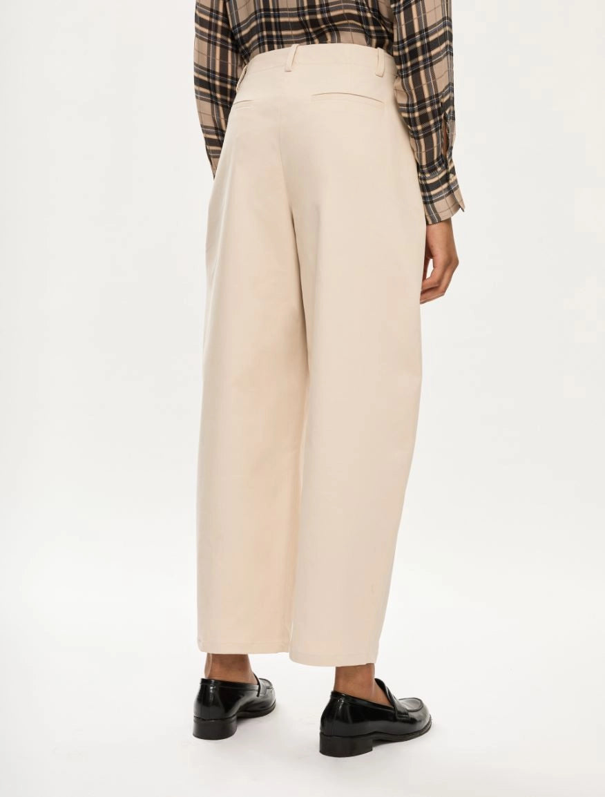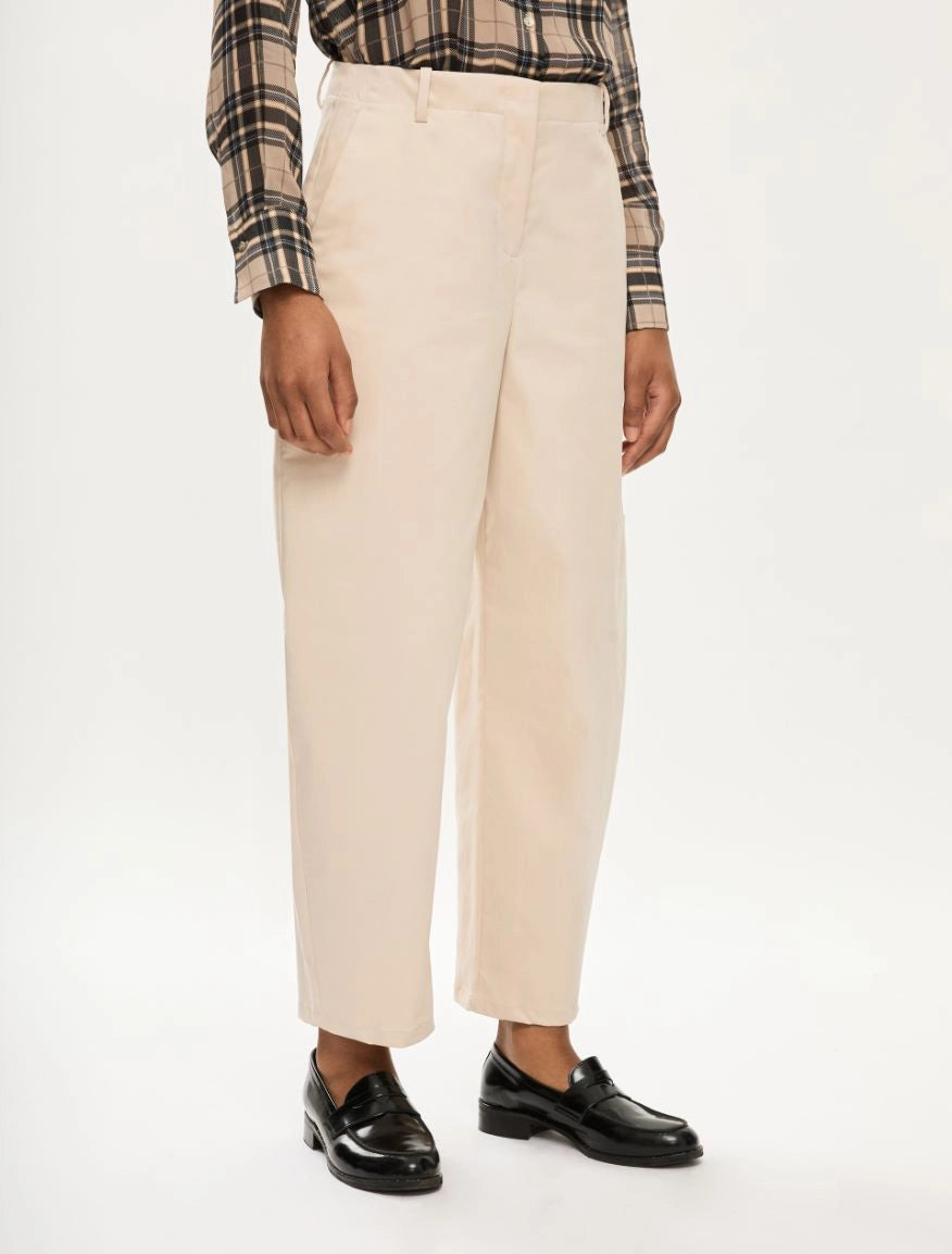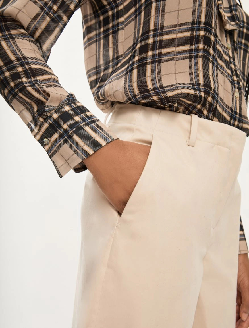 Tasche alla francese davanti, a filetto dietro. Chiusura con bottone e zip nascosta.