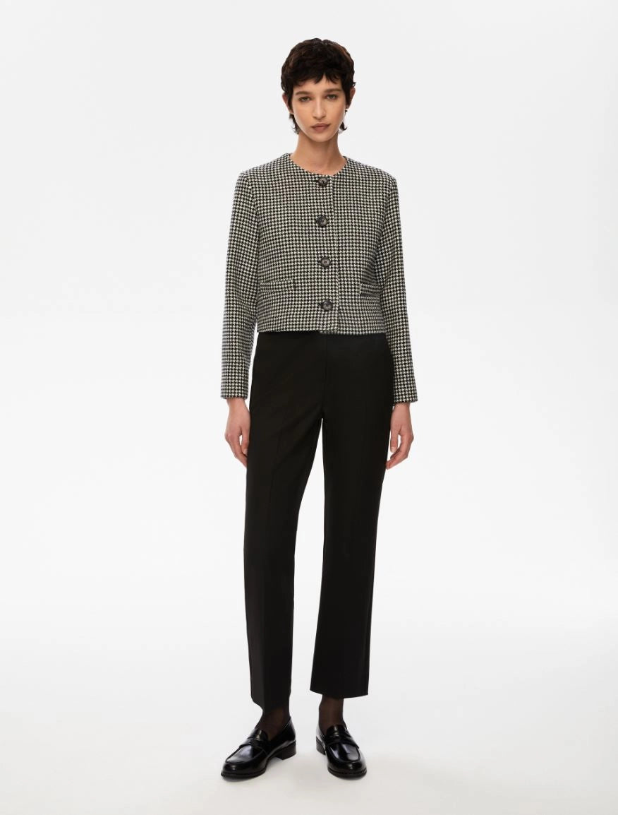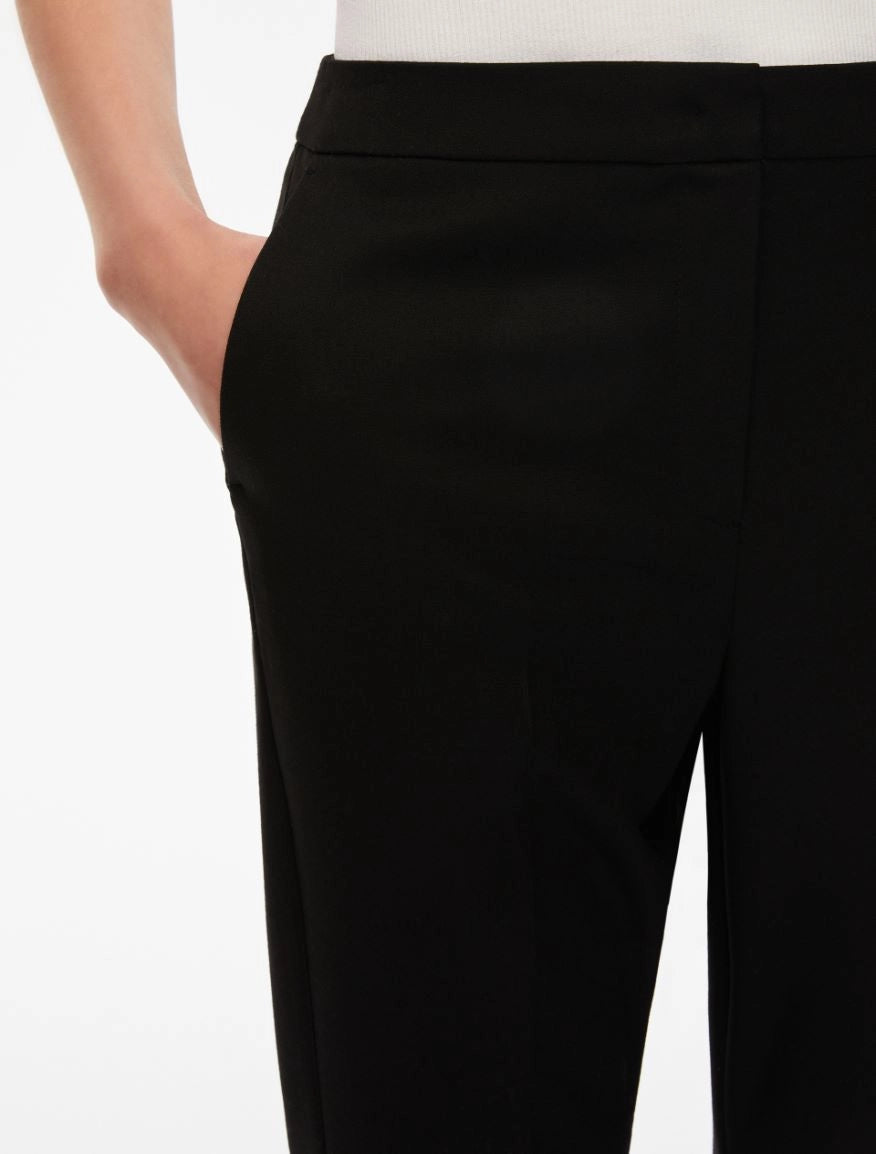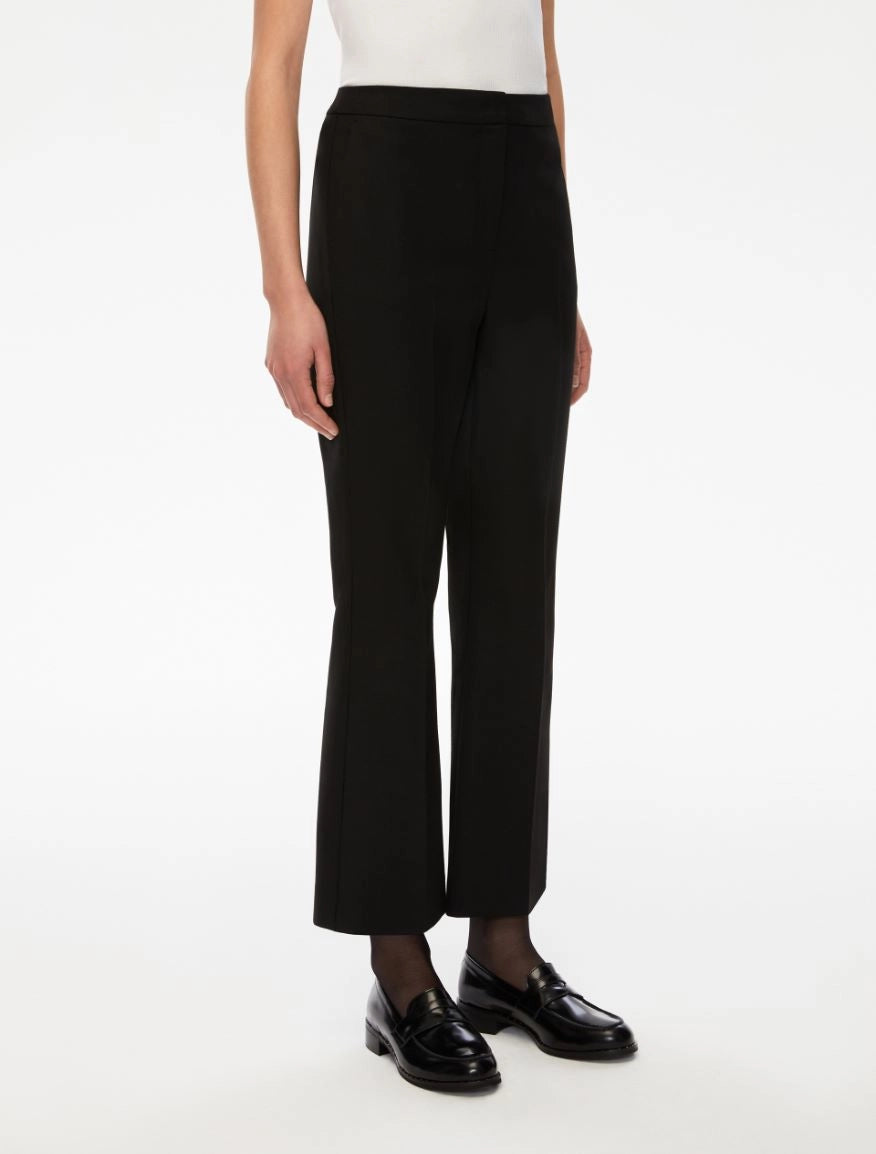 Pantaloni dal design flare dall'attitudine rétro, realizzati in tessuto stretch. Linea a zampa, con doppie pinces sul retro e tasche alla francese davanti mentre a filetto sul retro. Chiusura con zip nascosta e gancio.