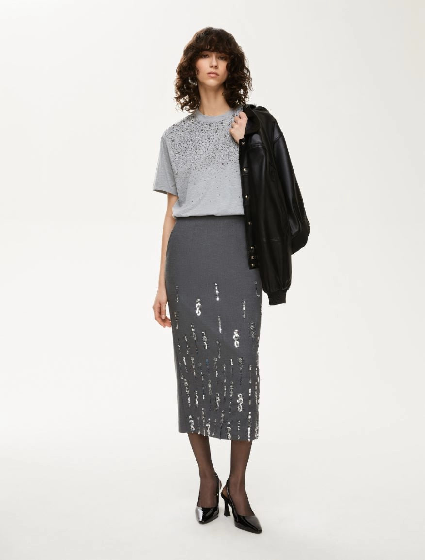 Linea morbida e scollo tondo dal taglio classico ma impreziosita sul davanti da applicazioni e strass ton sur ton.
