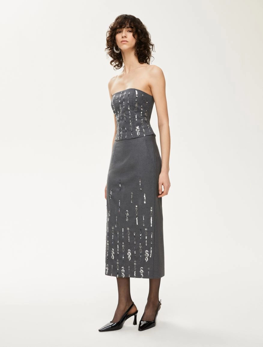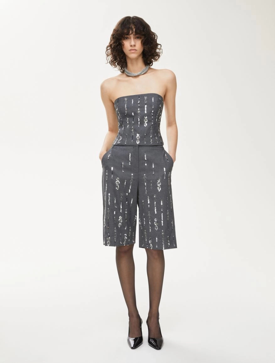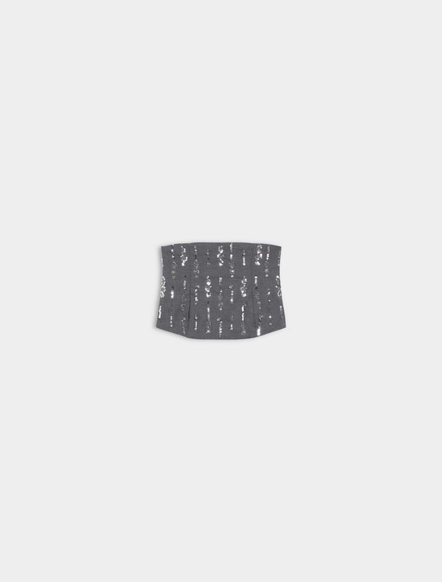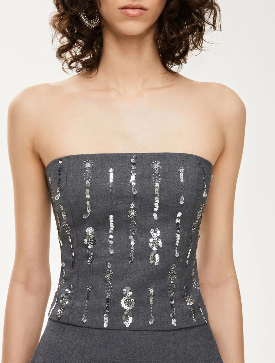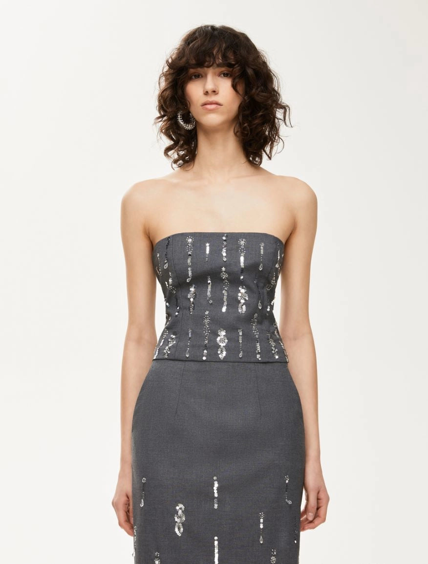 Top a bustier senza spalline in tessuto ricamato a mano con paillettes e applicazioni davanti. Presenta una fodera interna sul davanti ed uno scollo stondato.