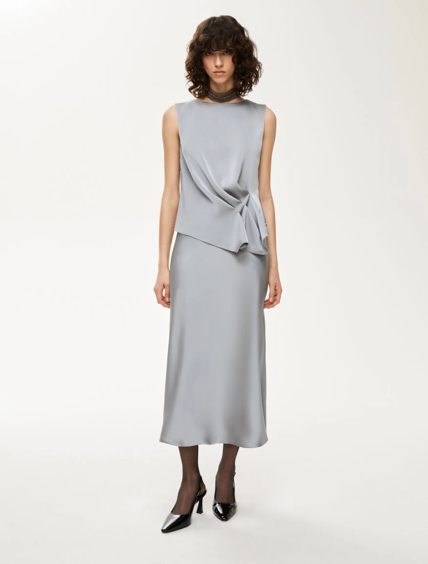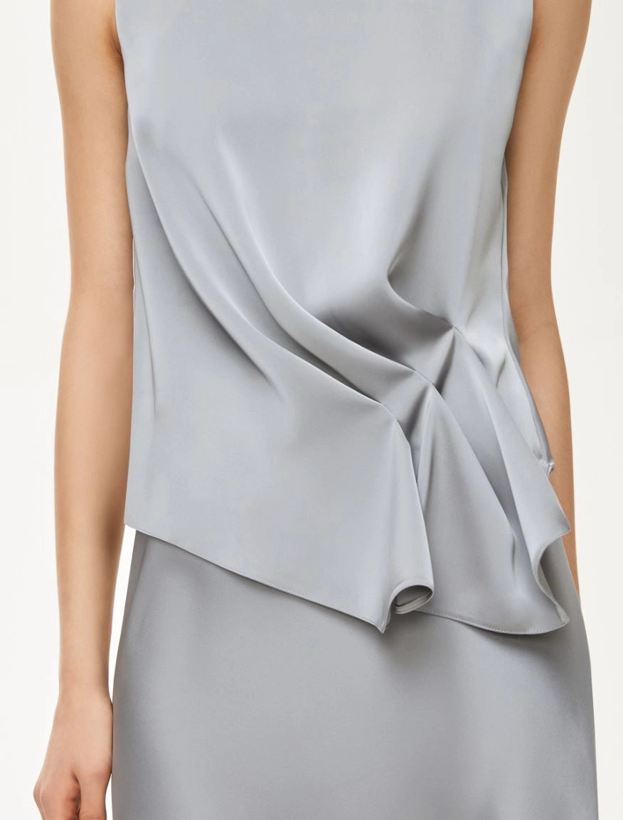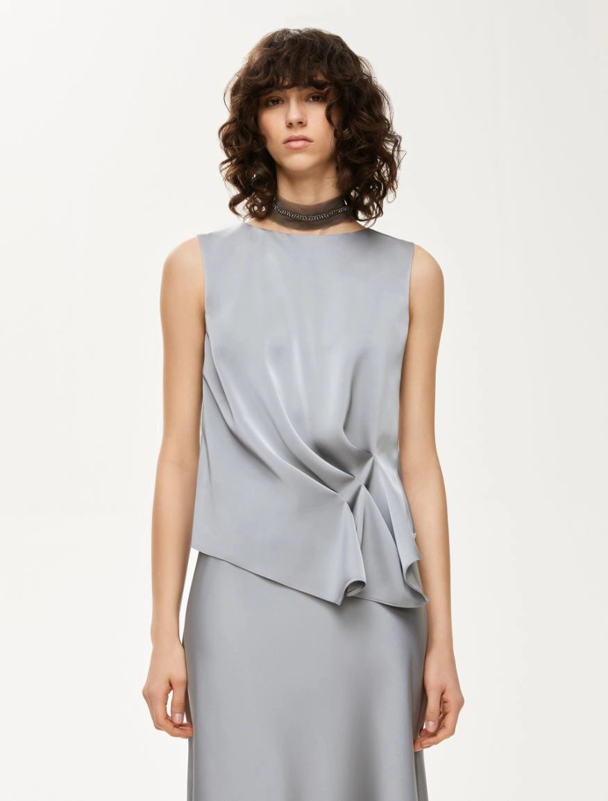 Top in raso fluido dalla linea morbida e vestibilita' ampia. Scollo tondo con goccia e bottone dietro, senza maniche. Motivo di pieghe drappeggiate che enfatizzano il punto vita.