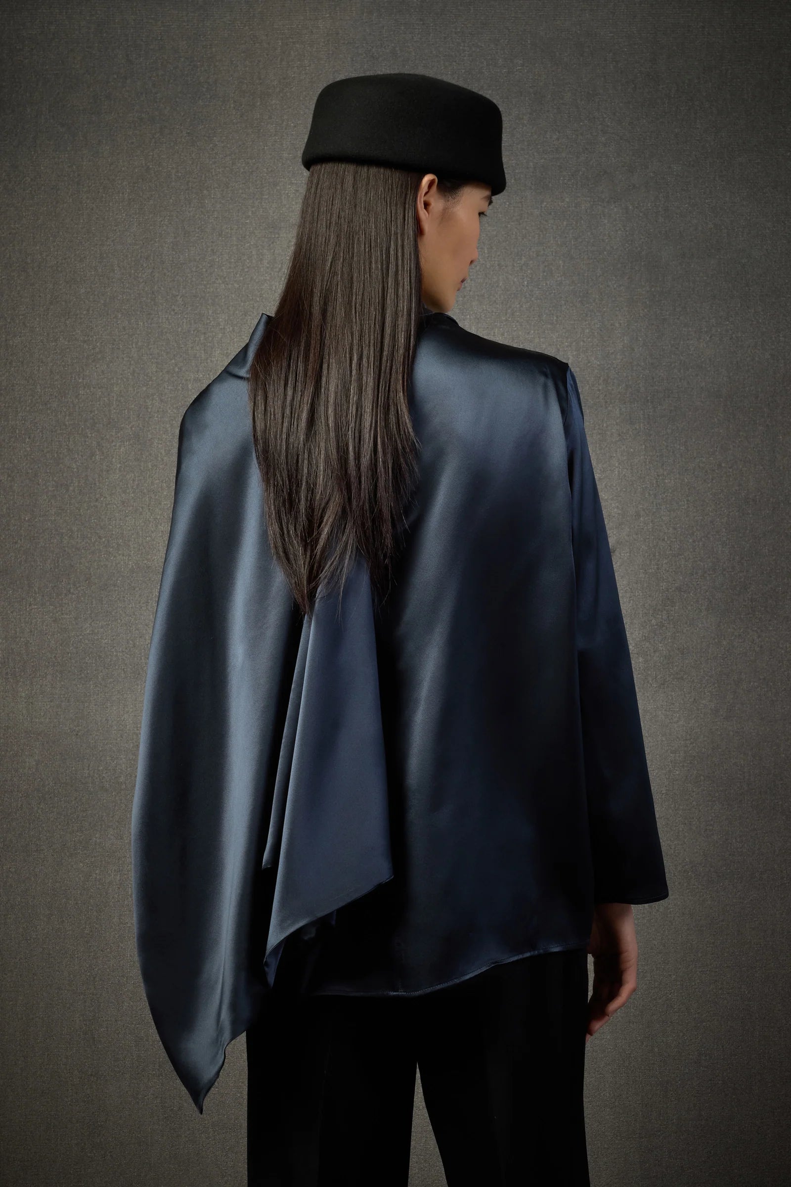 BLUSA DRITTA IN 100% RASO DI SETA CARATTERIZZATA DA UN DRAPPEGGIO CHE ATTRAVERSA IL PETTO, CON TAGLIO ELEGANTE E FLUENTE E MANICHE LUNGHE. Articolo: L5WS60