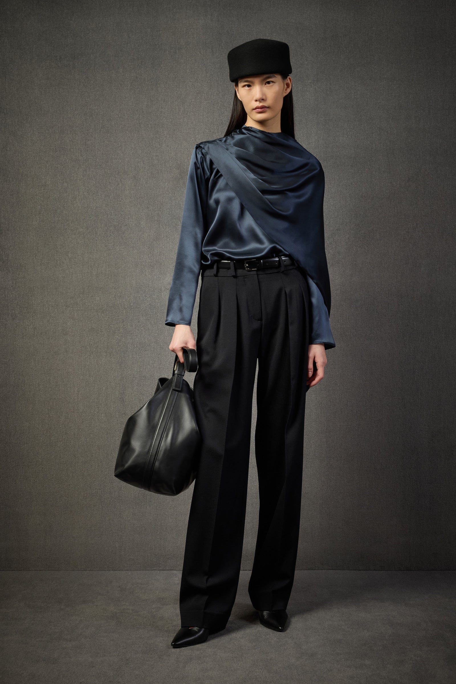 BLUSA DRITTA IN 100% RASO DI SETA CARATTERIZZATA DA UN DRAPPEGGIO CHE ATTRAVERSA IL PETTO, CON TAGLIO ELEGANTE E FLUENTE E MANICHE LUNGHE. Articolo: L5WS60