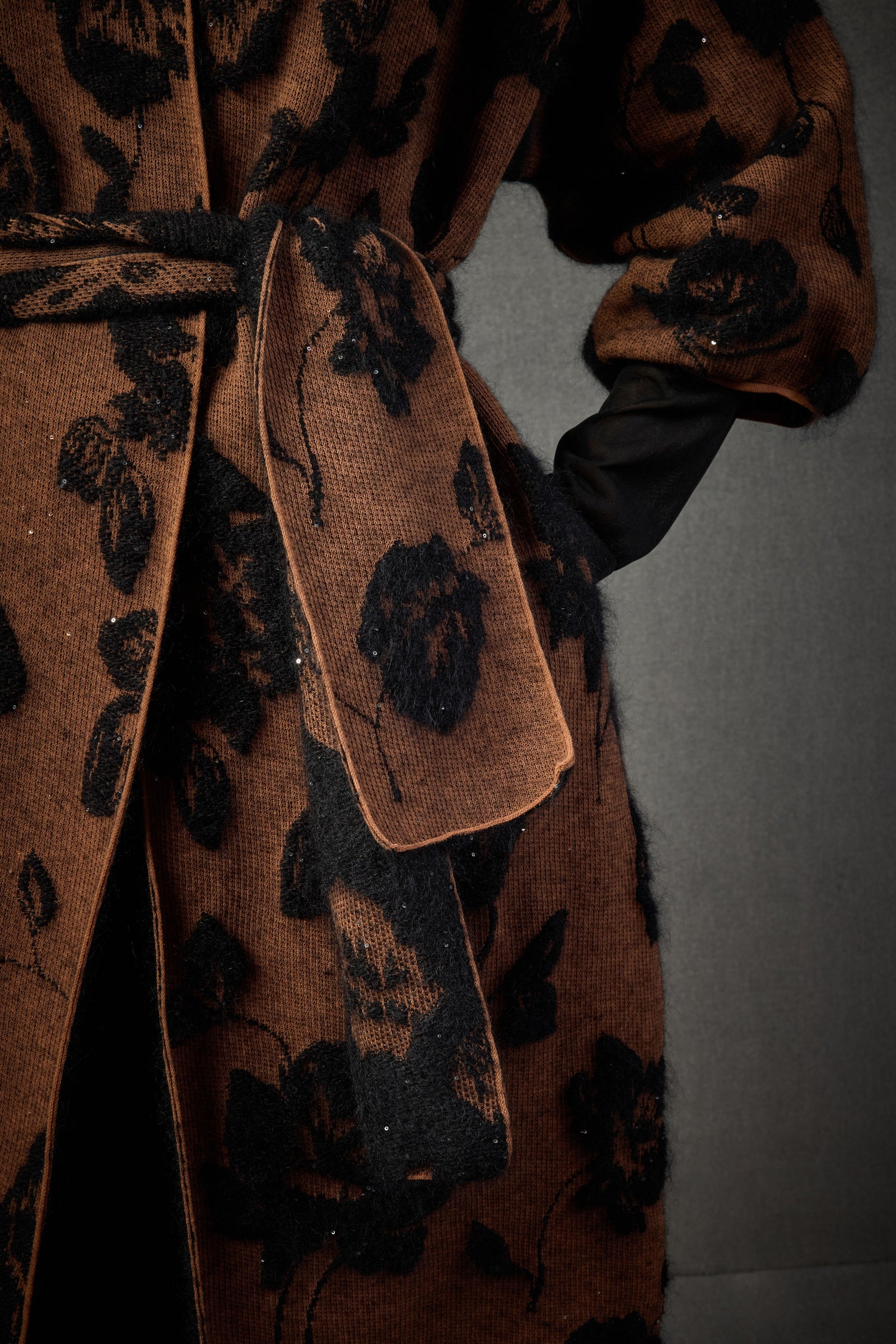 CAPPOTTO IN MOHAIR GRIGIO CON ROSE TRAMATE COLOR CAMMELLO E PICCOLE PAILLETTES IRIDESCENTI. SCOLLO A BARCHETTA E MANICHE LUNGHE. CHIUSURA POSTERIORE CON FIOCCHI IN RASO.