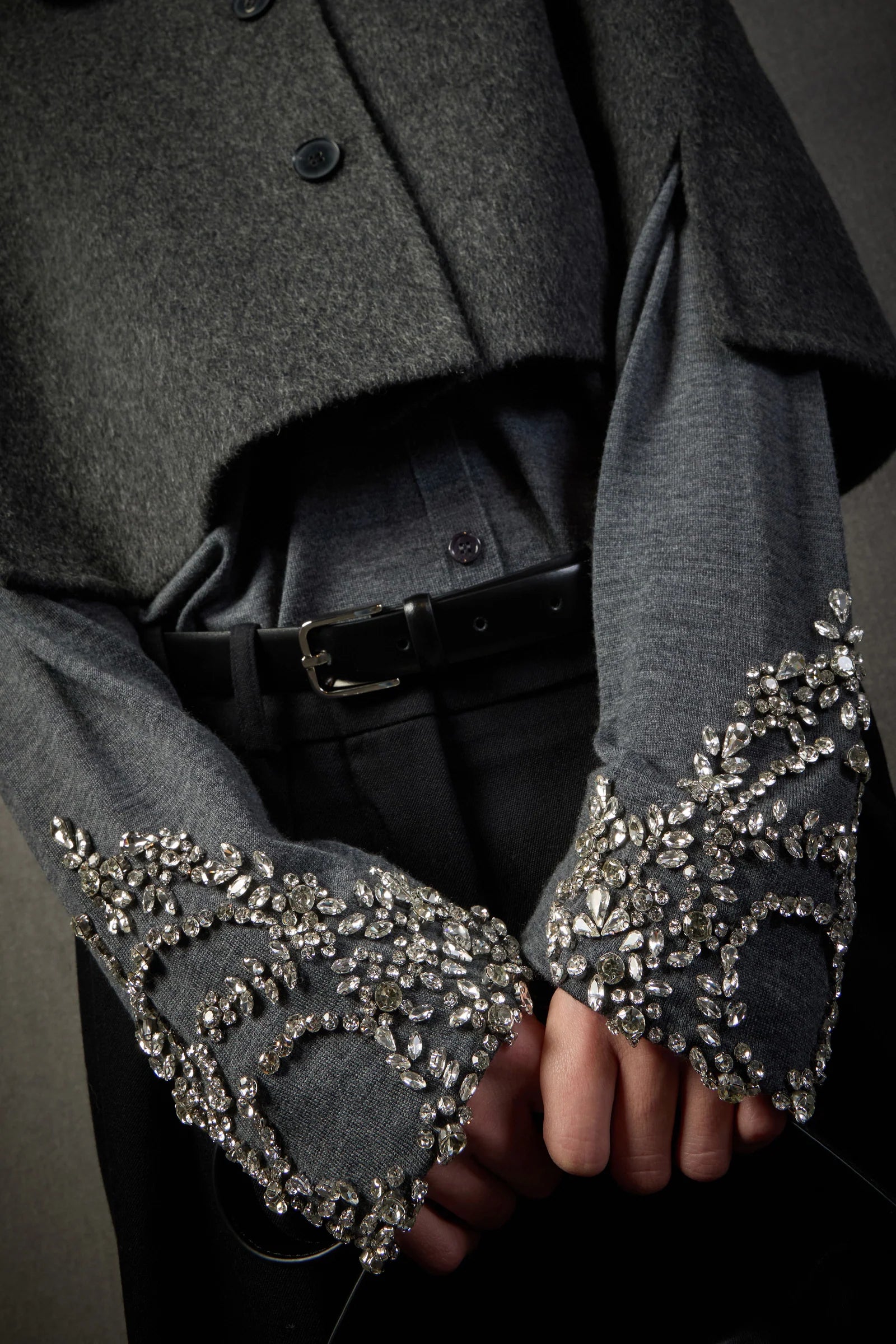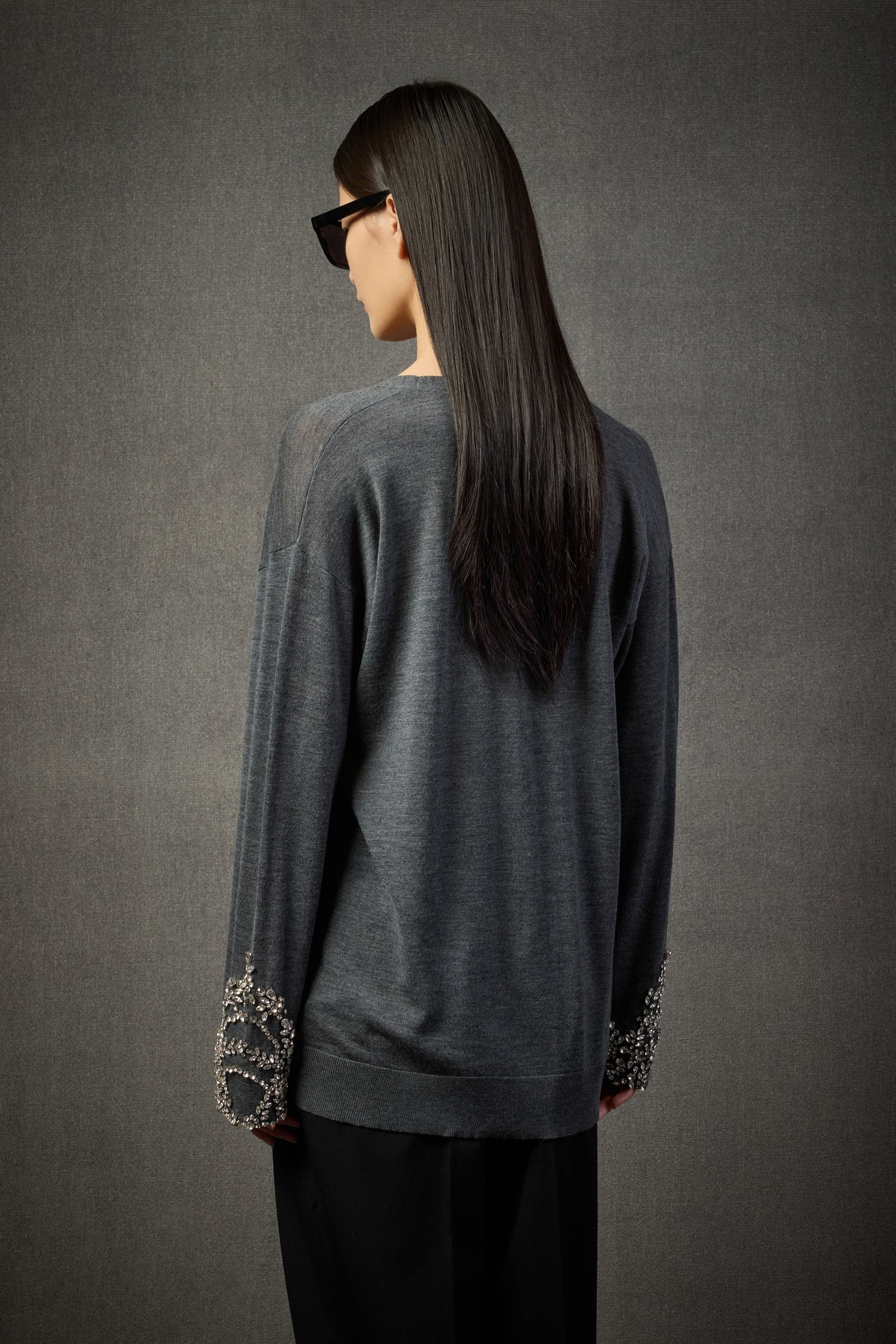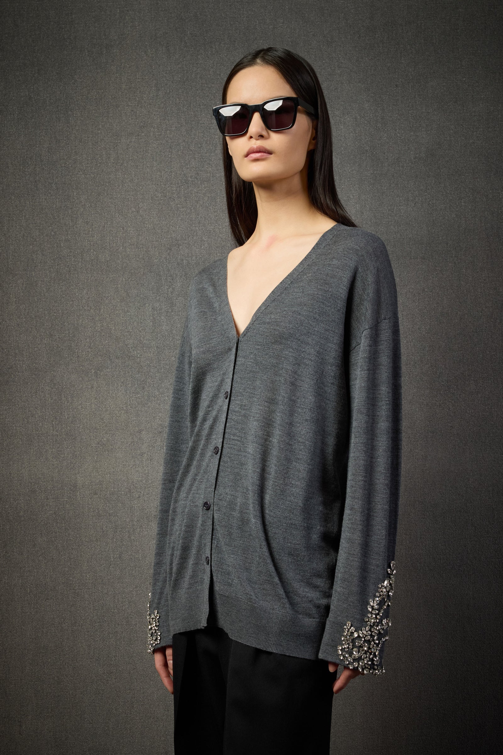 CARDIGAN IN 100% LANA. CHIUSURA FRONTALE CON BOTTONI A PRESSIONE NASCOSTI. DECORATO CON RICAMO DI STRASS TONO SU TONO LUNGO IL PROFILO DELLA CHIUSURA.