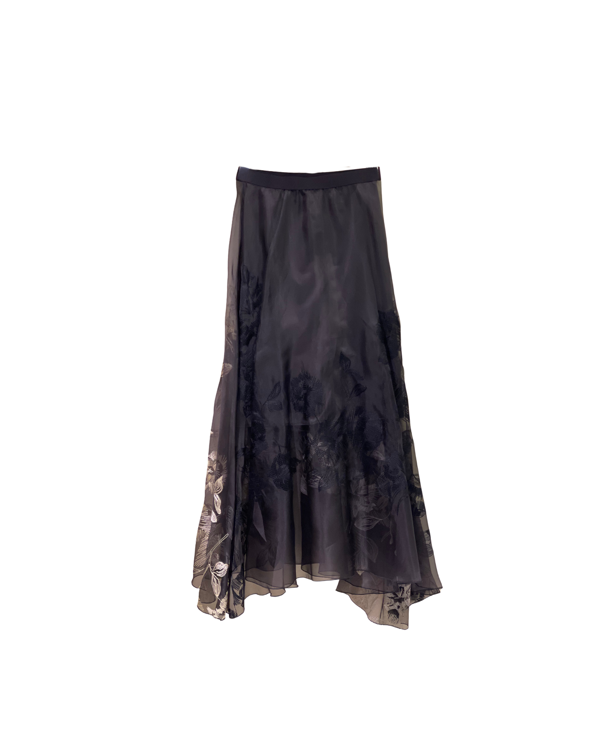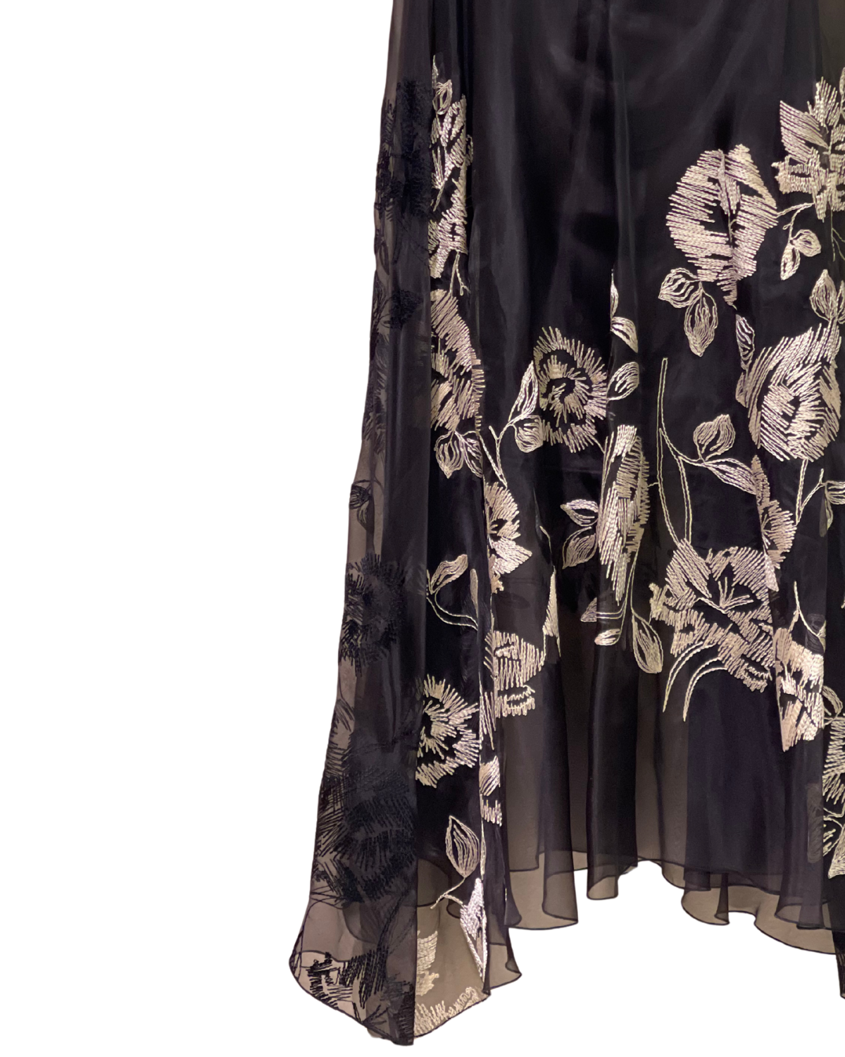 GONNA LUNGA E AMPIA IN ORGANZA DI SETA CON RICAMI FLOREALI IN ORO, CON VITA ALTA E ABBINATA A SOTTOVESTE.