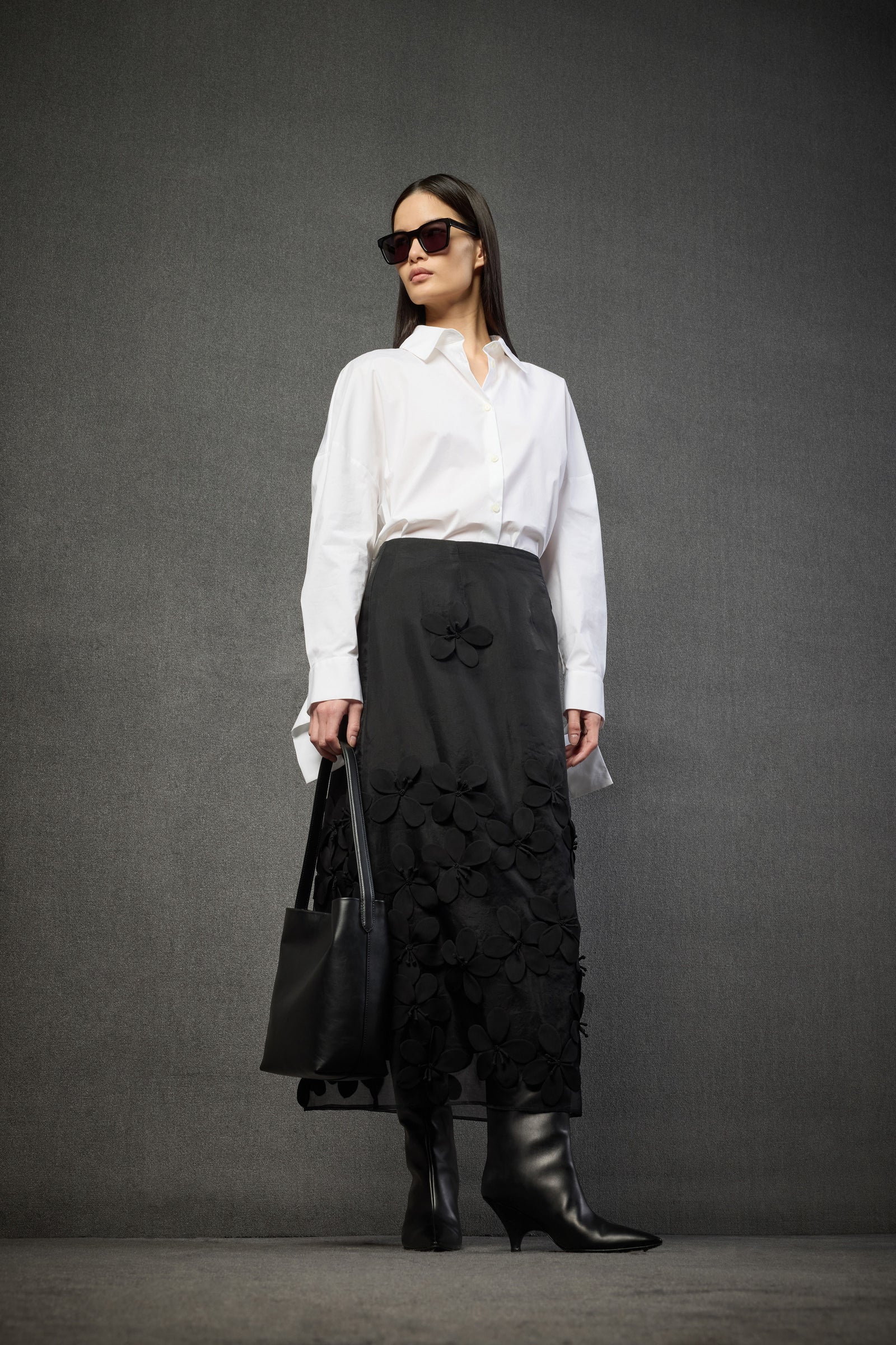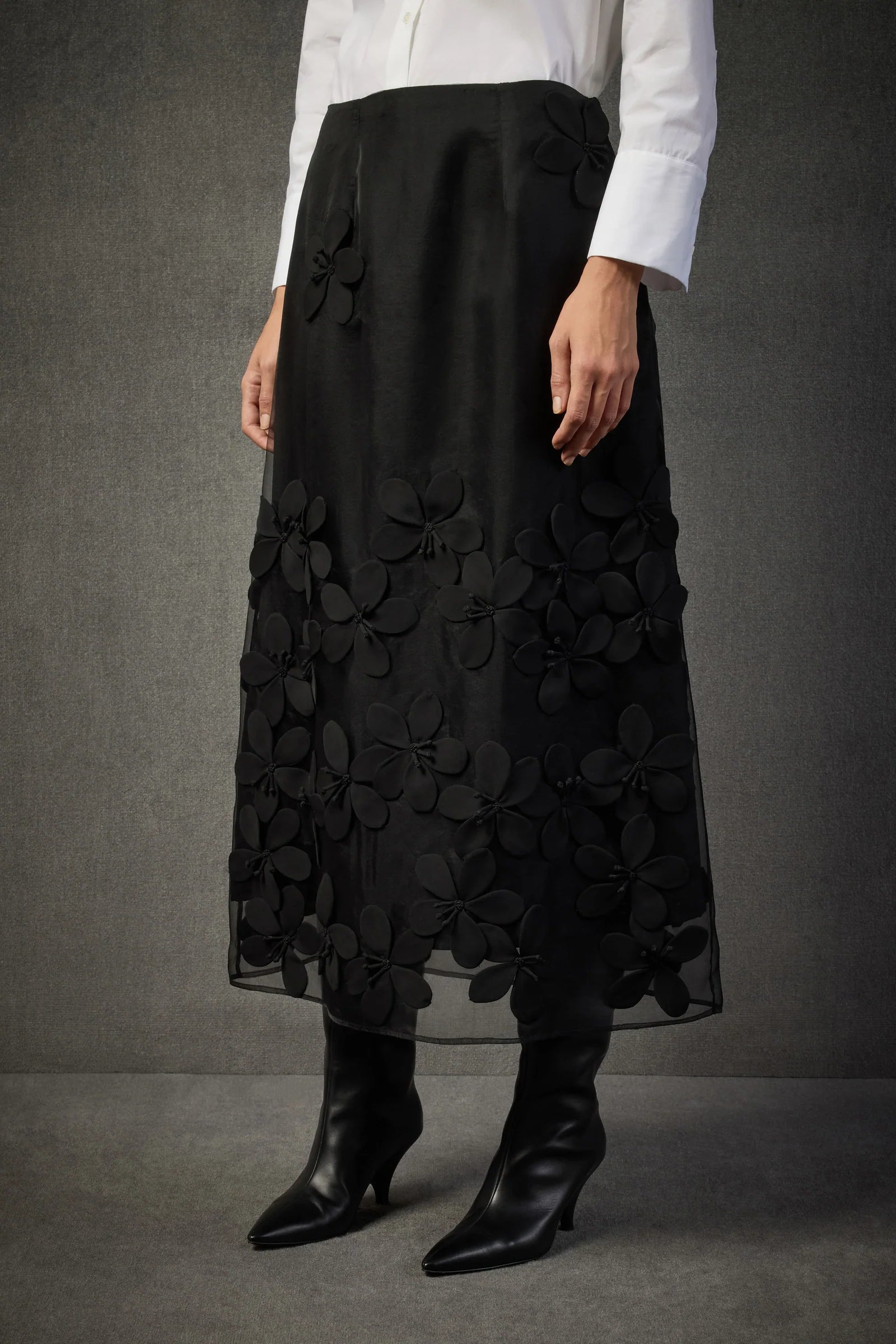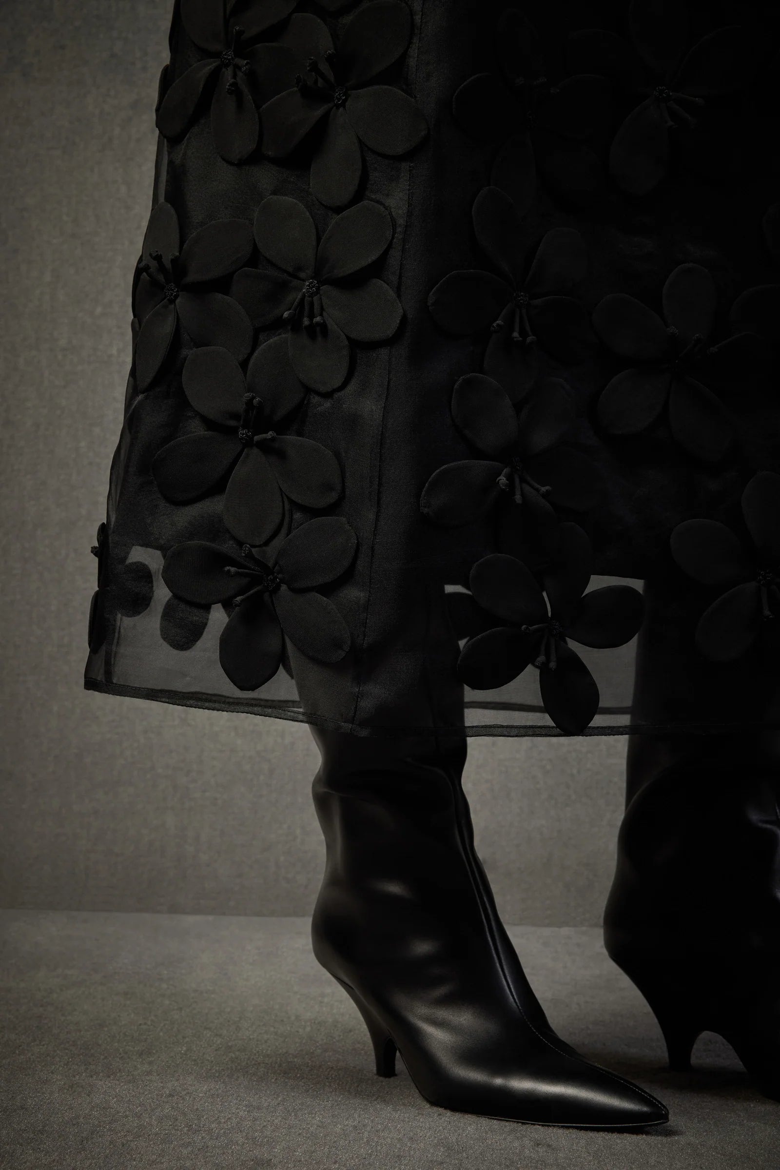 GONNA LUNGA IN ORGANZA DI SETA RICAMATA A MANO CON APPLICAZIONI FLOREALI E PARTE FINALE TRASPARENTE.