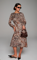 Abito midi in viscosa co stampa leo e dalla linea dritta leggermente svasata sul fondo gonna. Presenta maniche lunghe e una scollatura tonda.