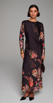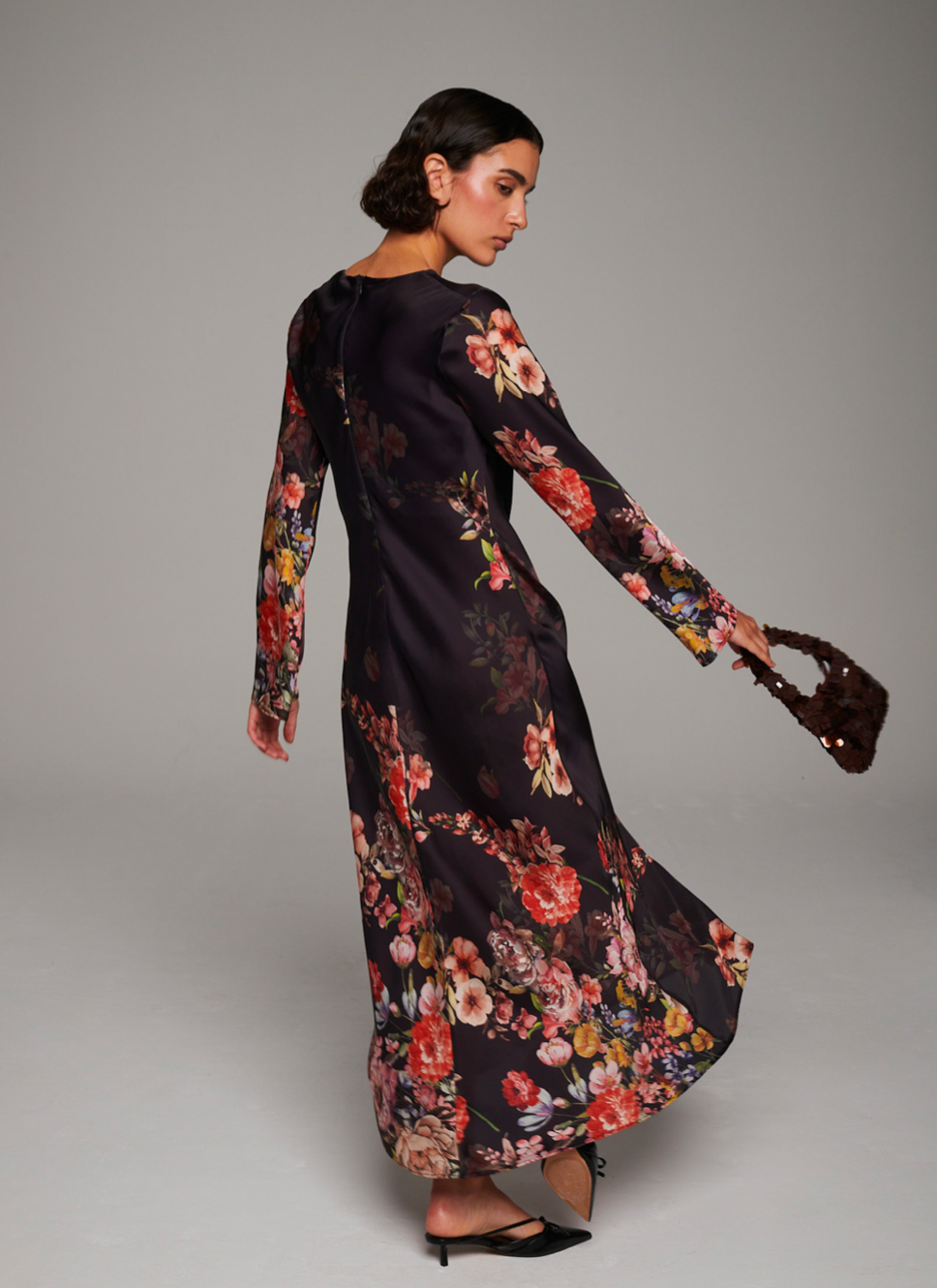 Abito dritto lungo in viscosa con stampa floreale sul fondo e sulle maniche. Presenta scollatura tonda e maniche lunghe e la chiusura è collocata sul retro tramite zip invisibile.