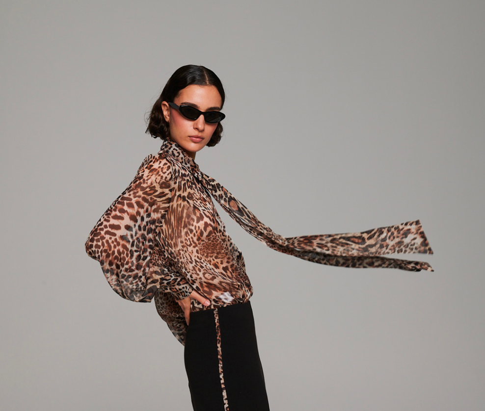Camicia in organza di viscosa con stampa leo. Dalla linea morbida e vestibilità ampia.