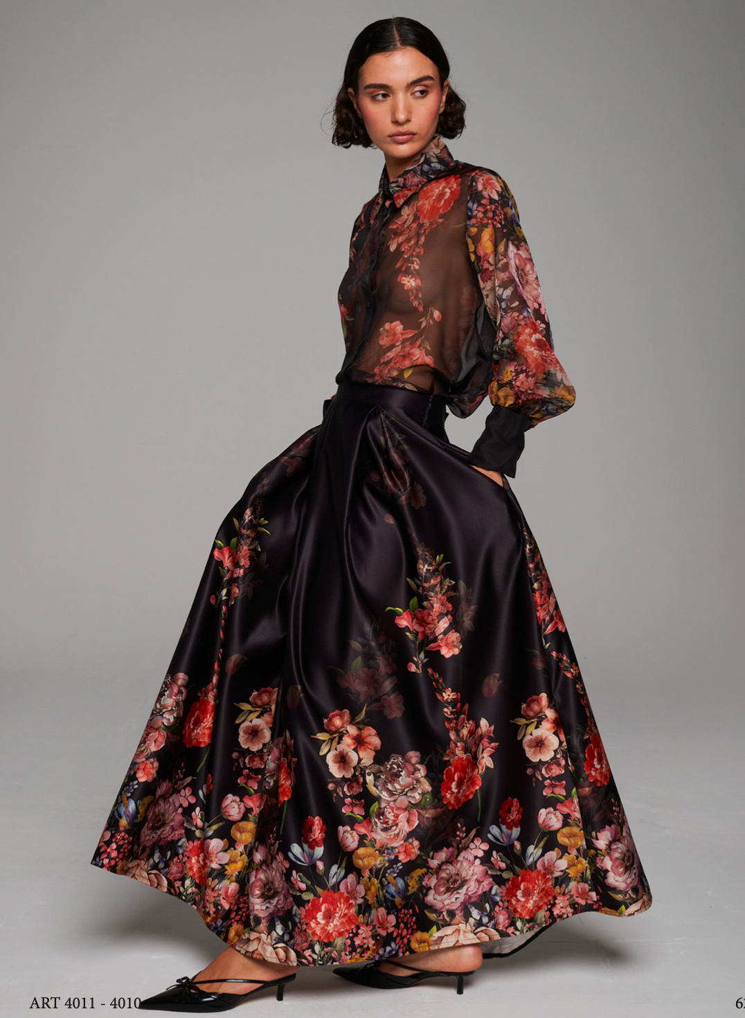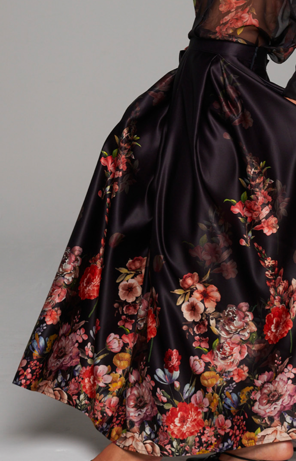 Gonna lunga dalla linea morbida e godet, fasciata in vita e con stampa floreale sul fondo. Le ampie pieghe donano volume e movimento, creando un effetto romantico ed elegante.