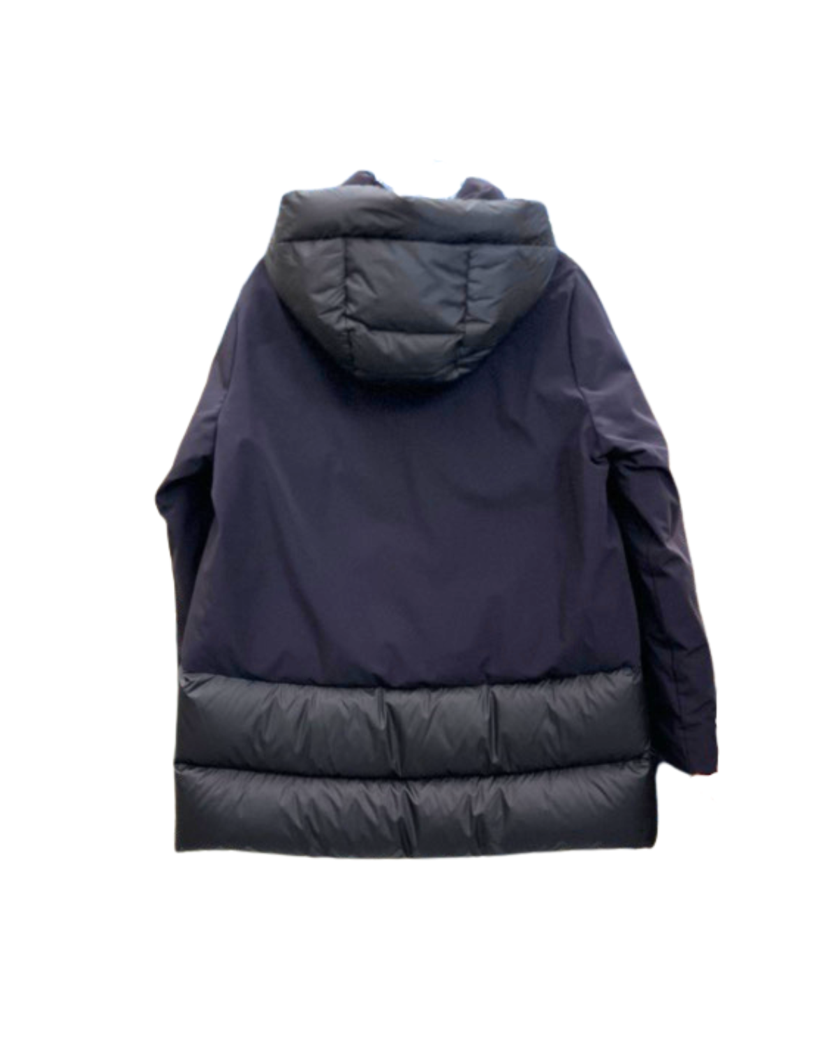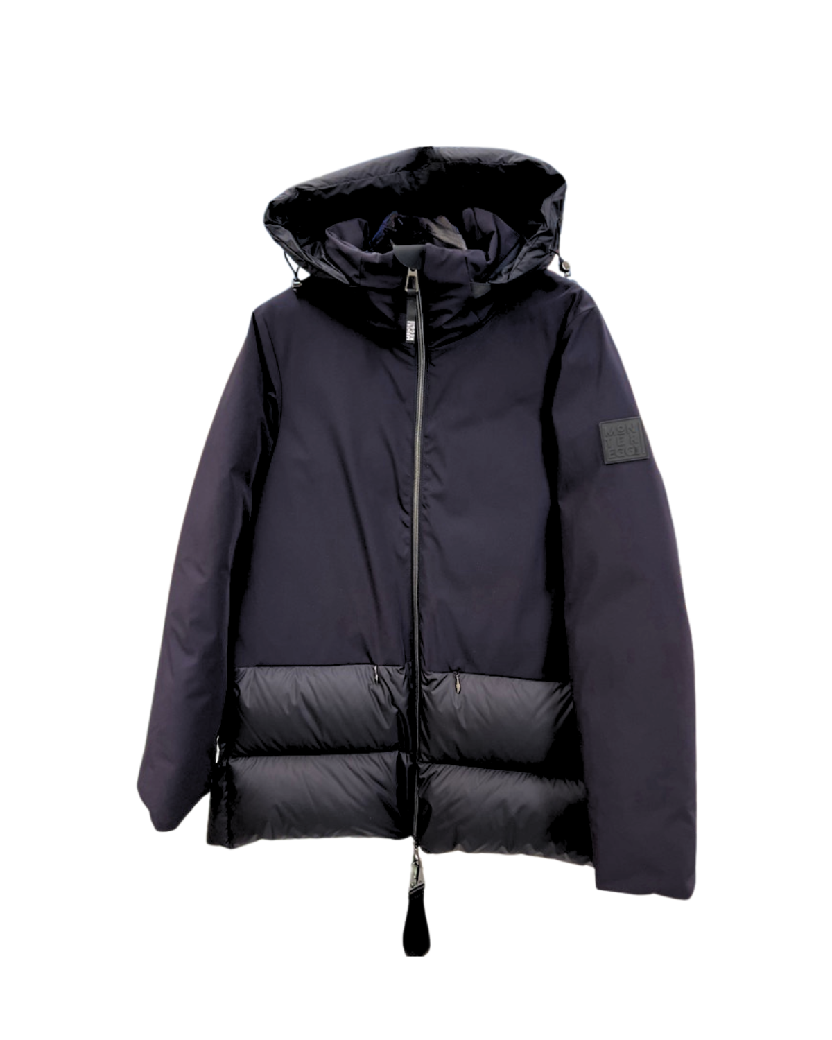 Piumino bimateriale dalla linea svasata e cappuccio staccabile integrato nel collo. Realizzato nel nuovo tessuto tecnico a 3 strati: nylon opaco elasticizzato, membrana impermeabile e antivento a maglina interna elasticizzata. Combinato con tessuto impalpabile e ultra denso 20 denari dal leggero effetto microfibrato e imbottito in piuma. Presenta una tasca a toppa interna e tasche esterne a scomparsa con entrata orizzontale, polsini in lycra antivento. Chiusura con zip centrale e bidirezionale.